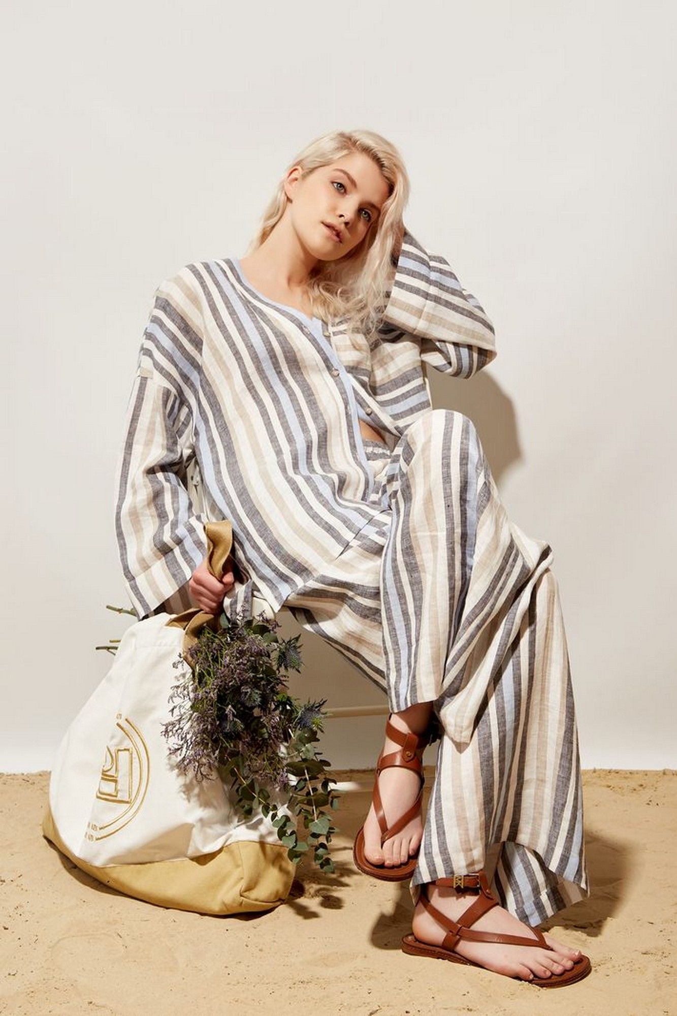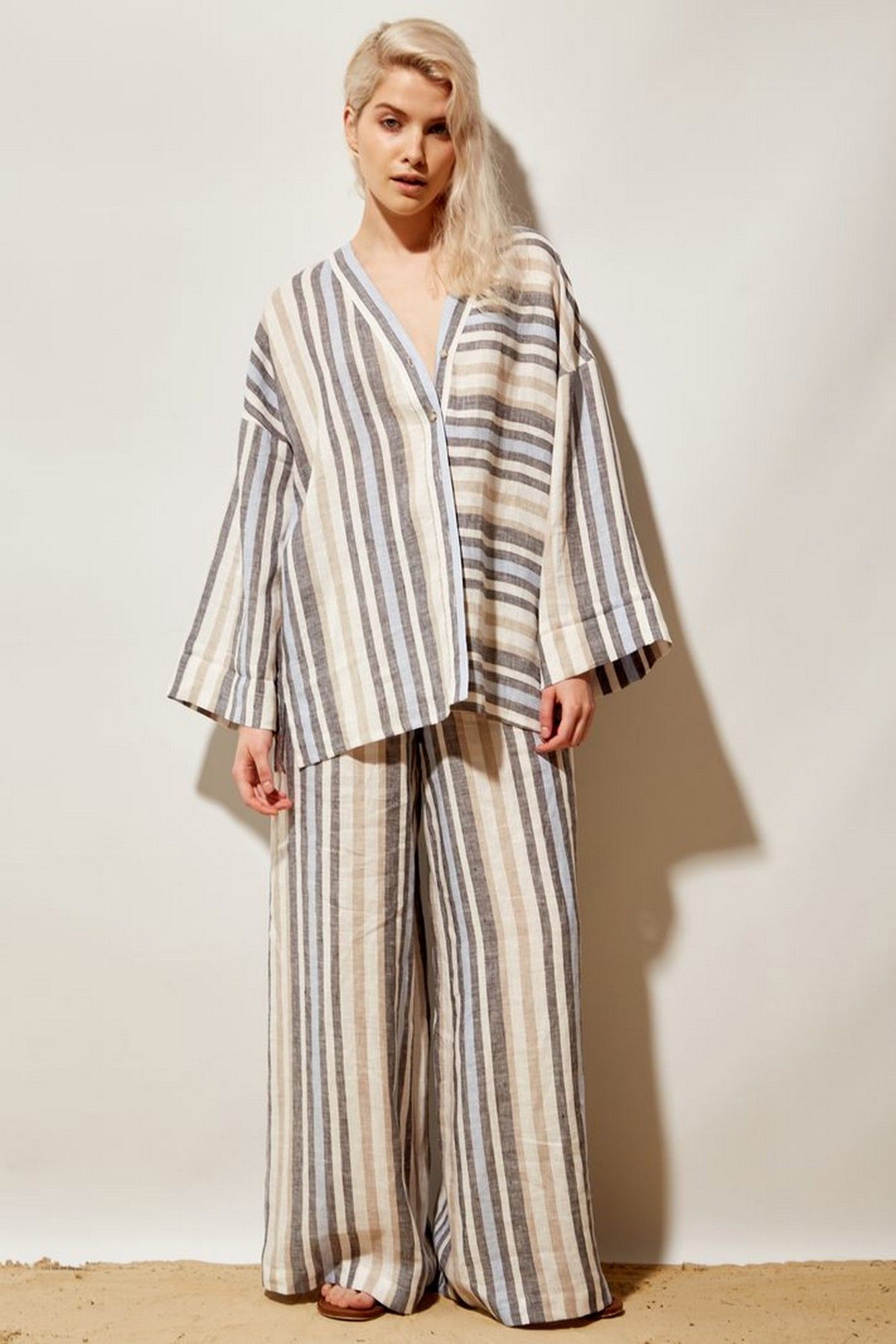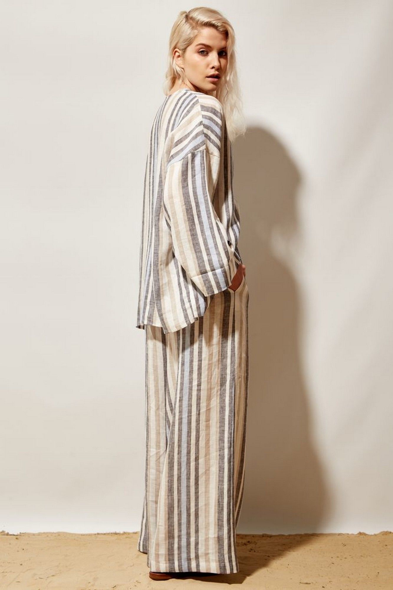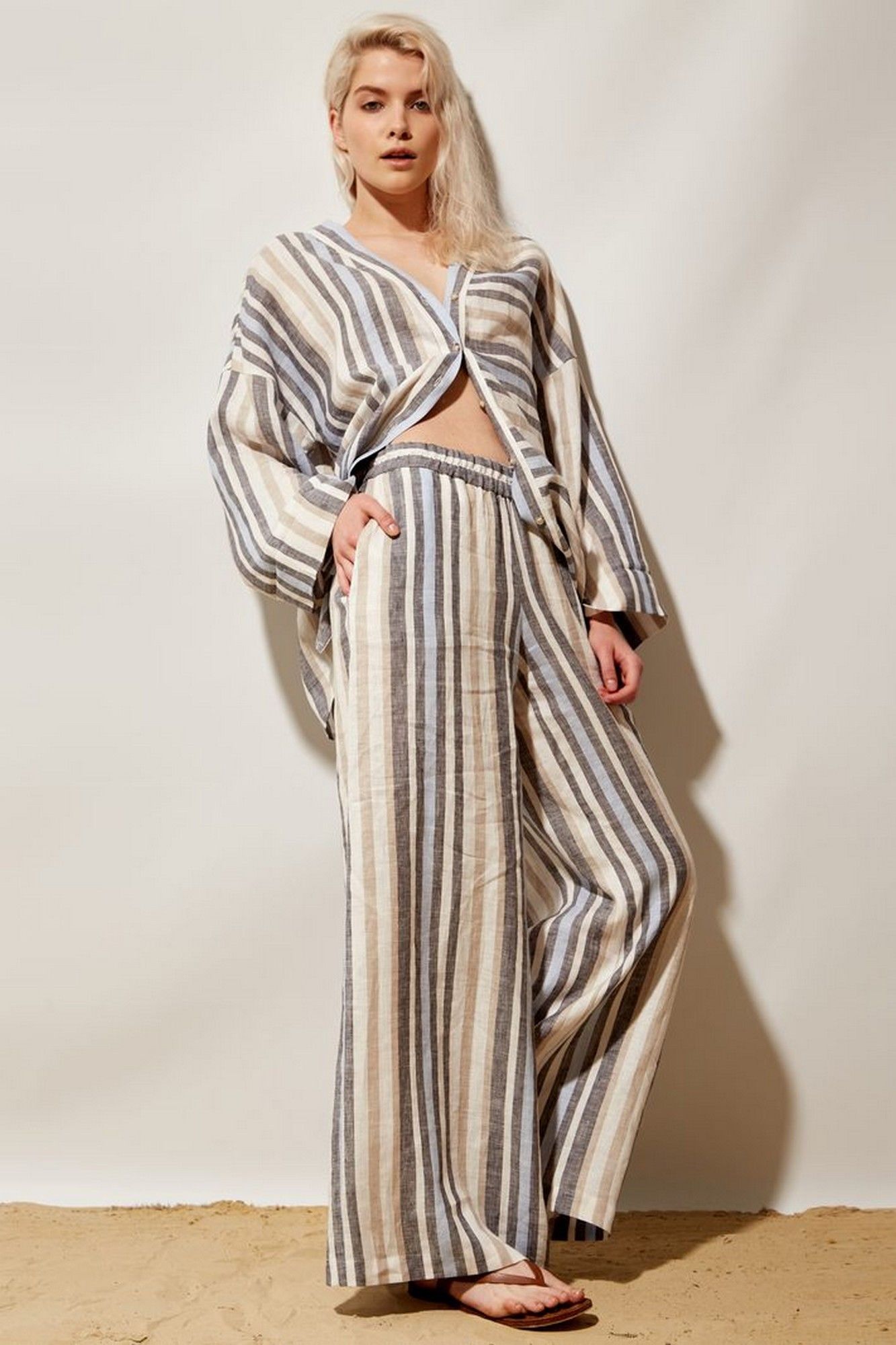 Брюки женские палаццо из льняной ткани в бежево\синюю\голубую полоску с высокой посадкой на талии. Верхний край брюк на резинке. Спереди обработаны боковые наклонные карманы.