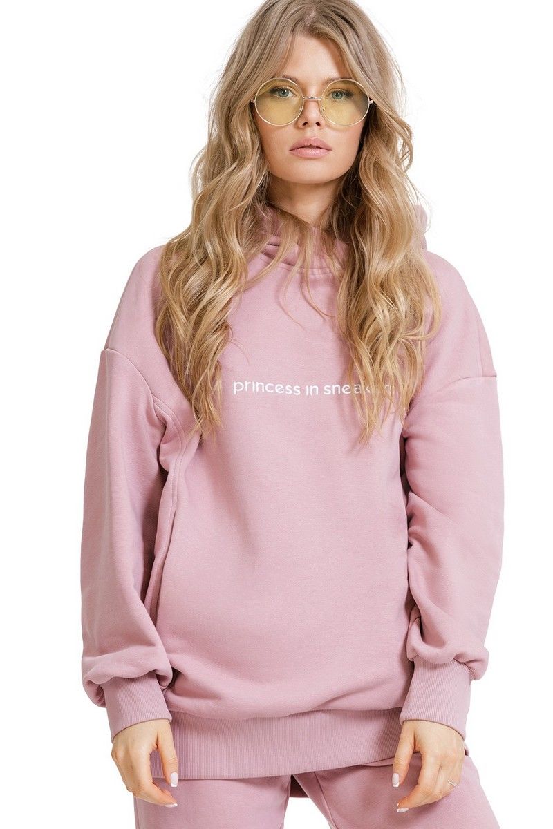 Трикотажное оверсайз худи с вышивкой. Детали: свободный покрой, прямой силуэт, спущенная линия плеча, перед с карманами в рельефных швах, капюшон, широкий притачной пояс, рукава длинные с притачными манжетами Длина по спинке около 74/76 см, длина рукава+ плечо около 53+9,5=62,5 см