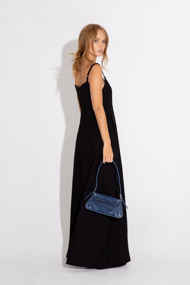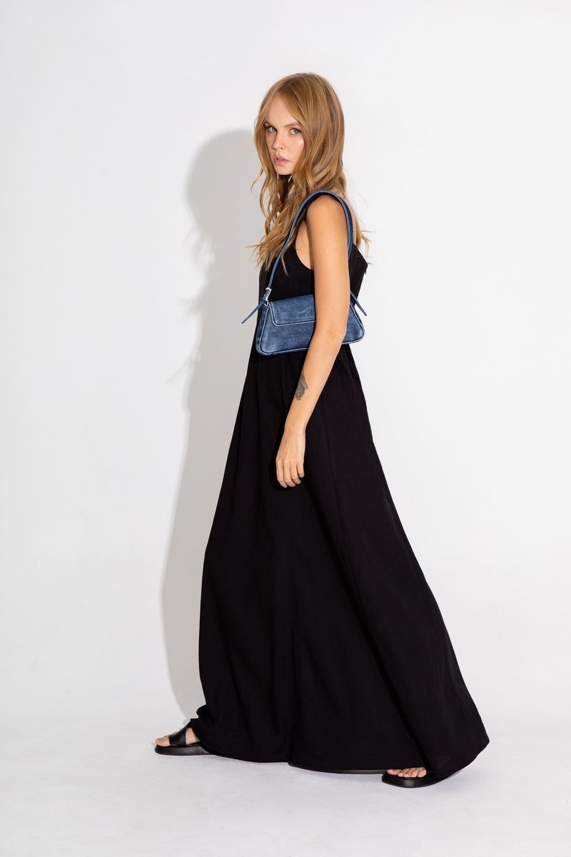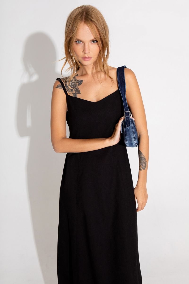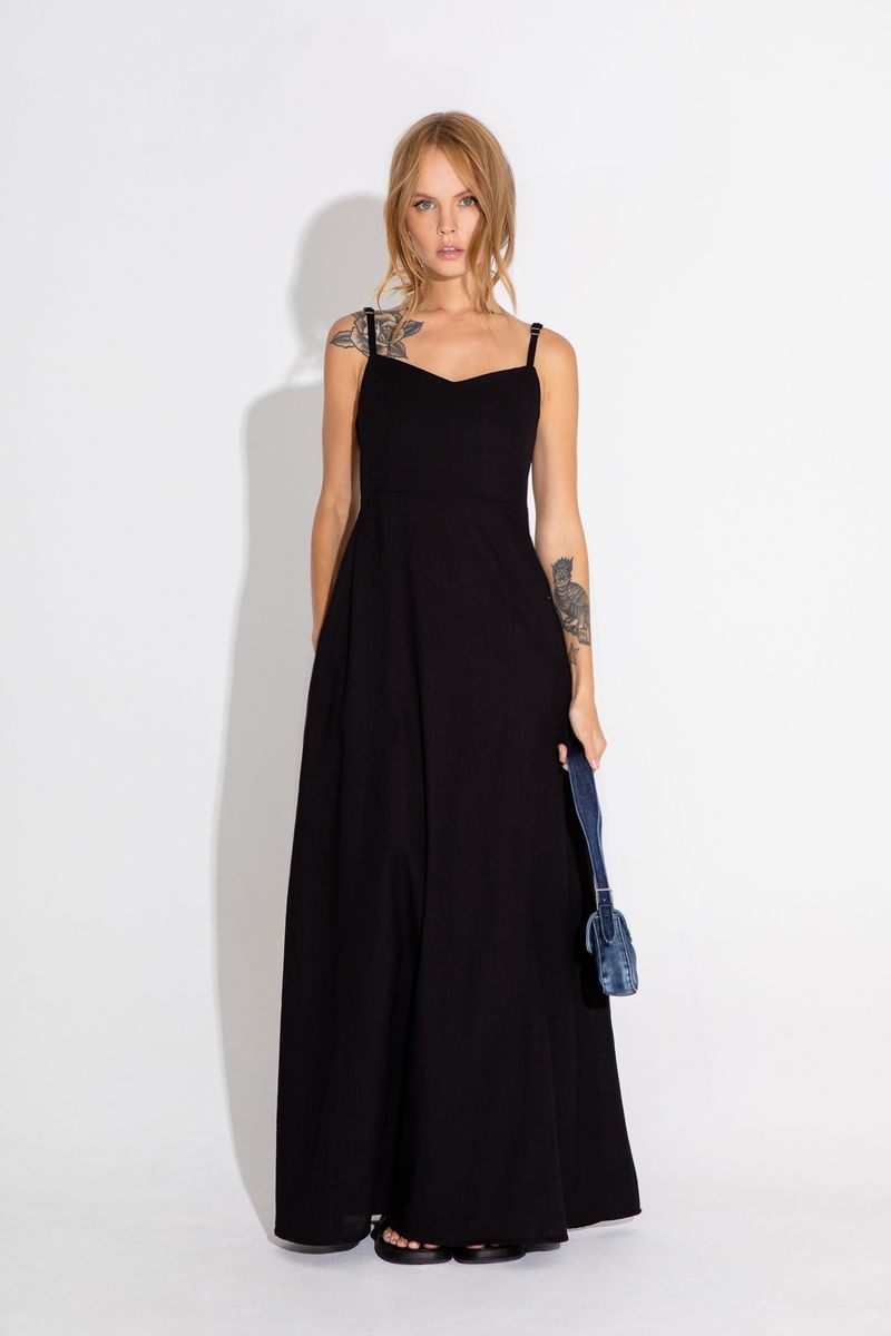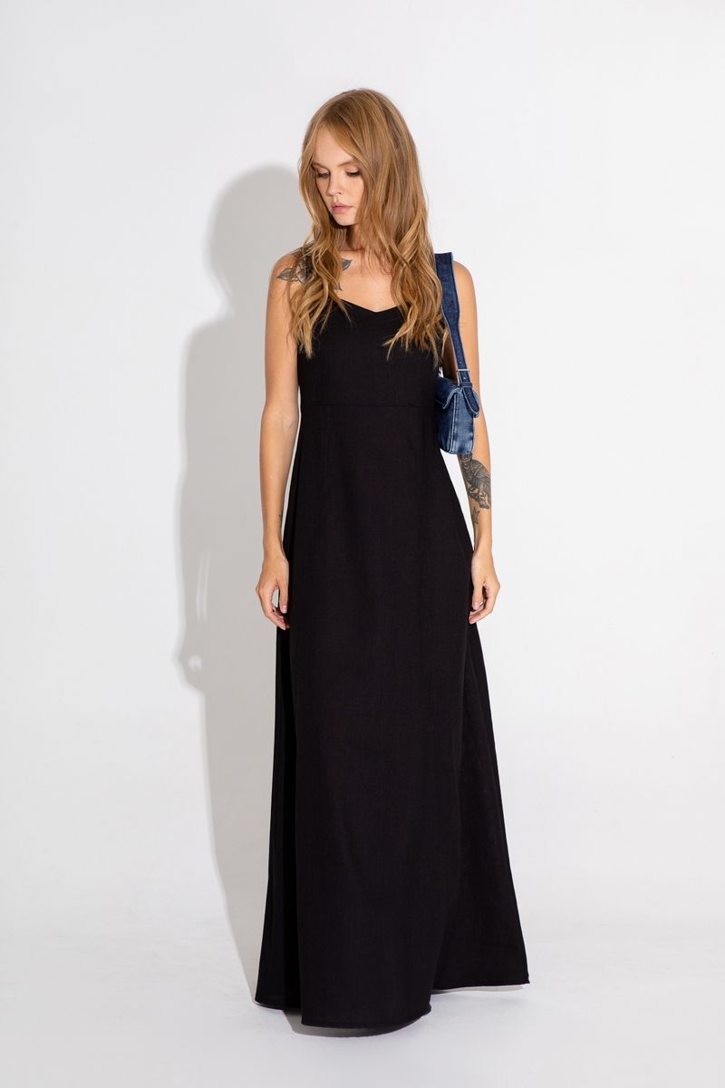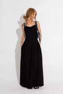Макси- платье на бретелях Детали: отрезная завышенная линия талии, рельефные швы, регулируемые бретели, карманы в швах Длина платья по боковому шву около 121 см