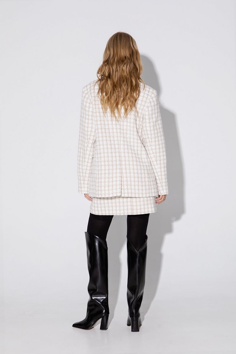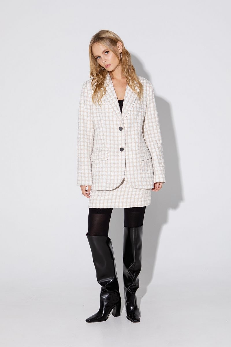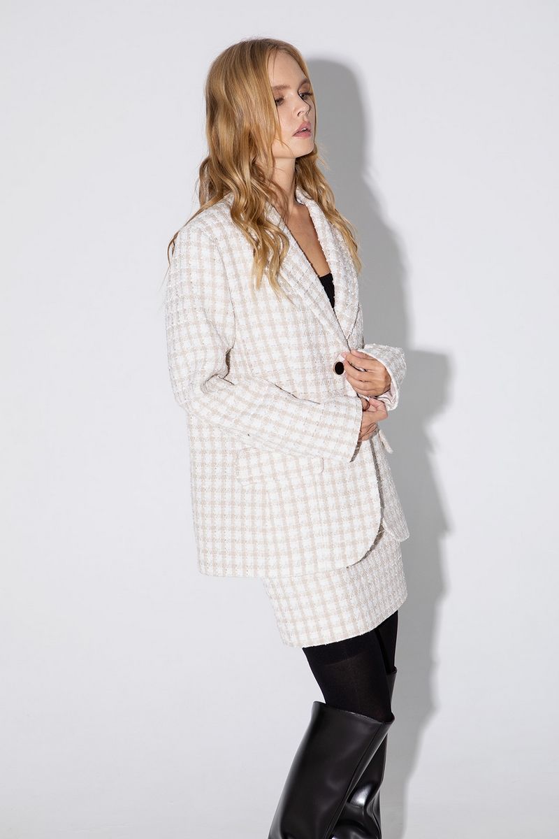 Костюм-двойка из оверсайз жакета и прямой мини-юбки из фактурного текстиля. Детали: жакет прямого силуэта, расширенная линия плеч, пиджачный воротник, перед с прорезными функциональными карманами, однобортная застежка на петли и пуговицы, спинка со средним швом и шлицей, рукава втачные двухшовные, жакет на подкладке. Юбка с высокой посадкой, притачной пояс, застежка сзади на потайную молнию, на подкладке. Длина жакета по спинке около 69 см в размерах 40-46 и около 72 см в размерах 48-52, длина рукавов около 62 см. Длина юбки по боковому шву с поясом около 46 см в размерах 40-46 и около 49 см в размерах 48-52.