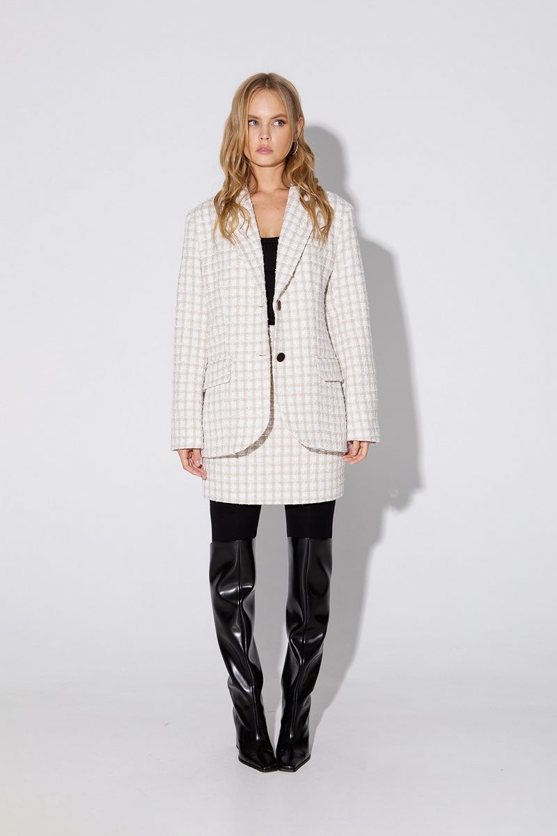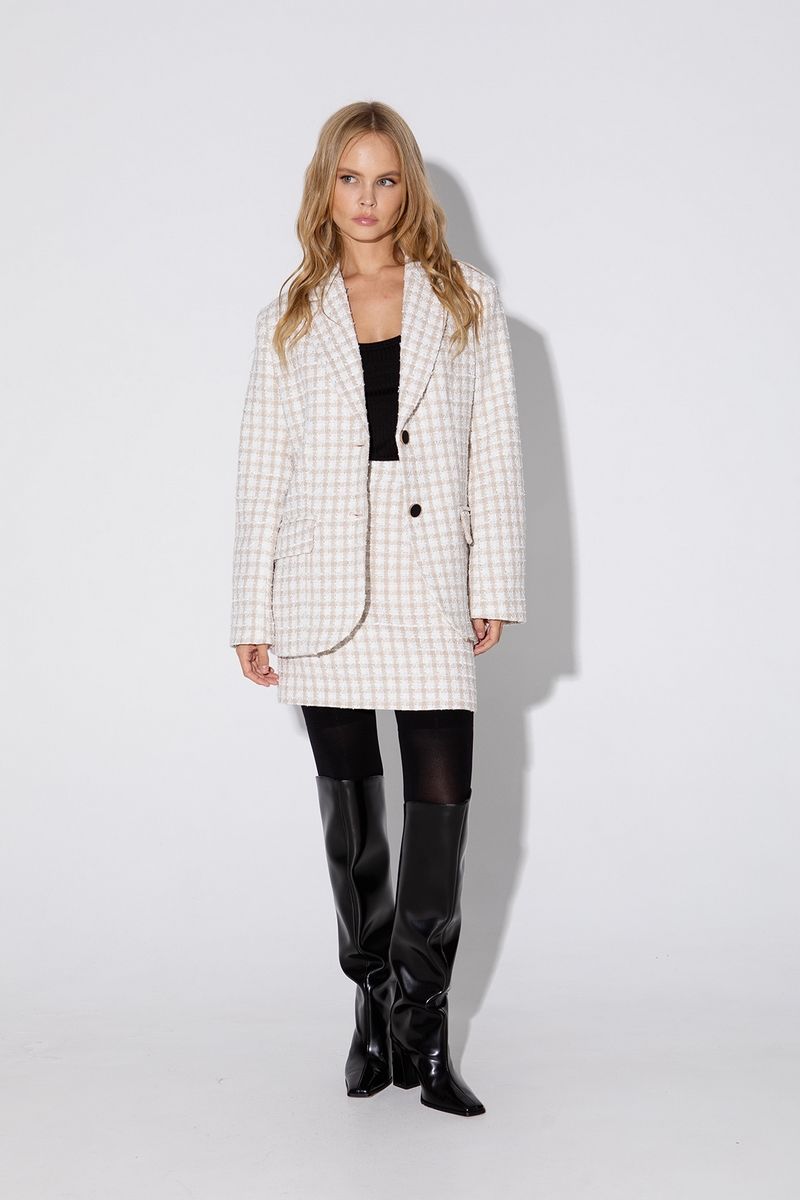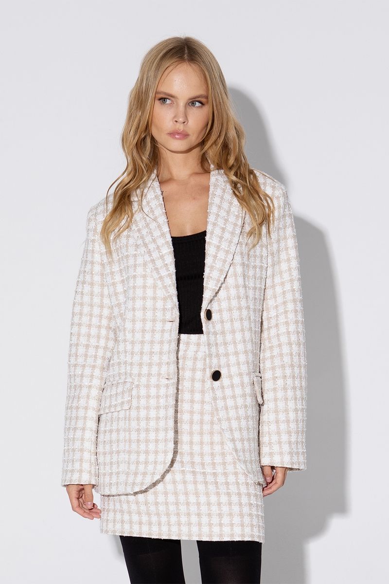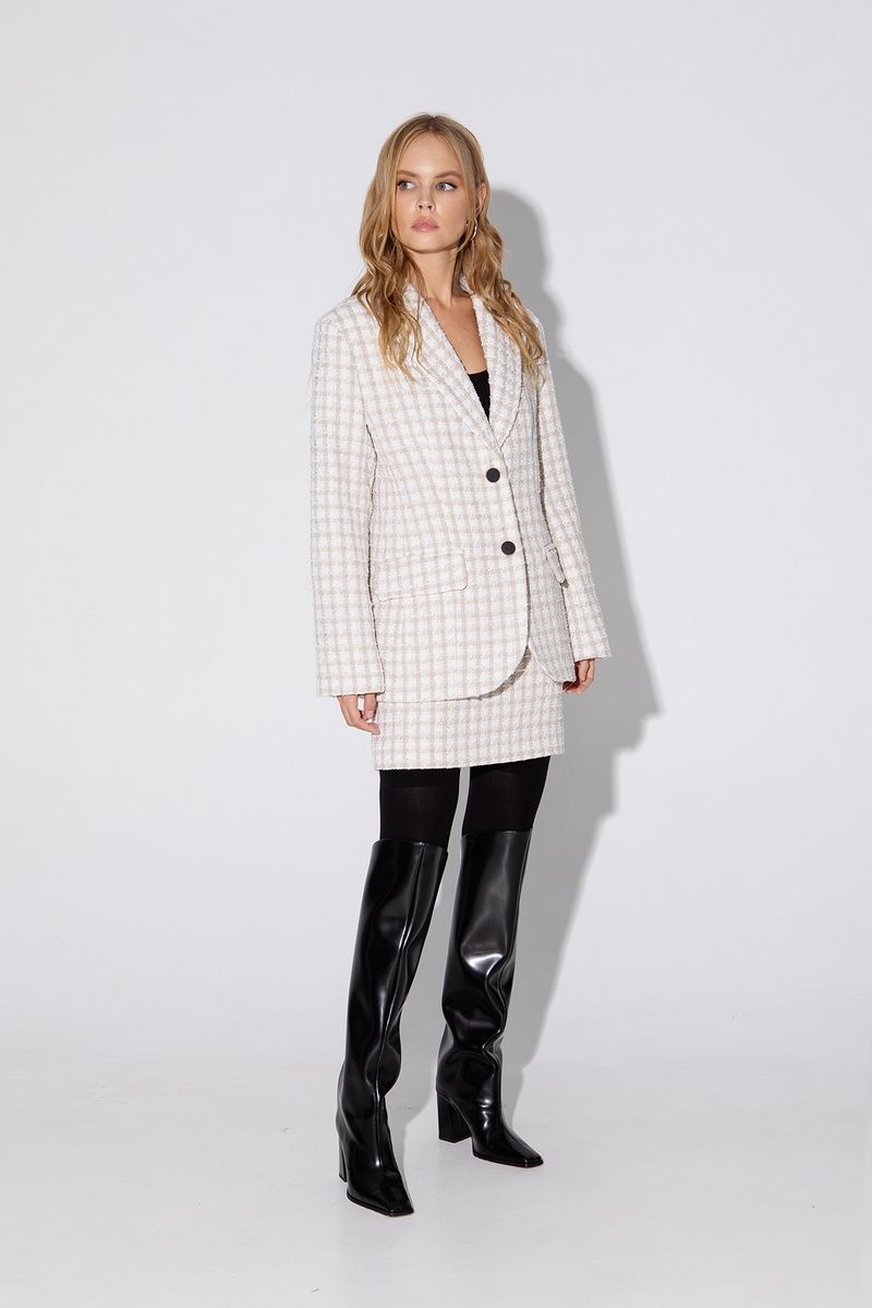 Костюм-двойка из оверсайз жакета и прямой мини-юбки из фактурного текстиля. Детали: жакет прямого силуэта, расширенная линия плеч, пиджачный воротник, перед с прорезными функциональными карманами, однобортная застежка на петли и пуговицы, спинка со средним швом и шлицей, рукава втачные двухшовные, жакет на подкладке. Юбка с высокой посадкой, притачной пояс, застежка сзади на потайную молнию, на подкладке. Длина жакета по спинке около 69 см в размерах 40-46 и около 72 см в размерах 48-52, длина рукавов около 62 см. Длина юбки по боковому шву с поясом около 46 см в размерах 40-46 и около 49 см в размерах 48-52.
