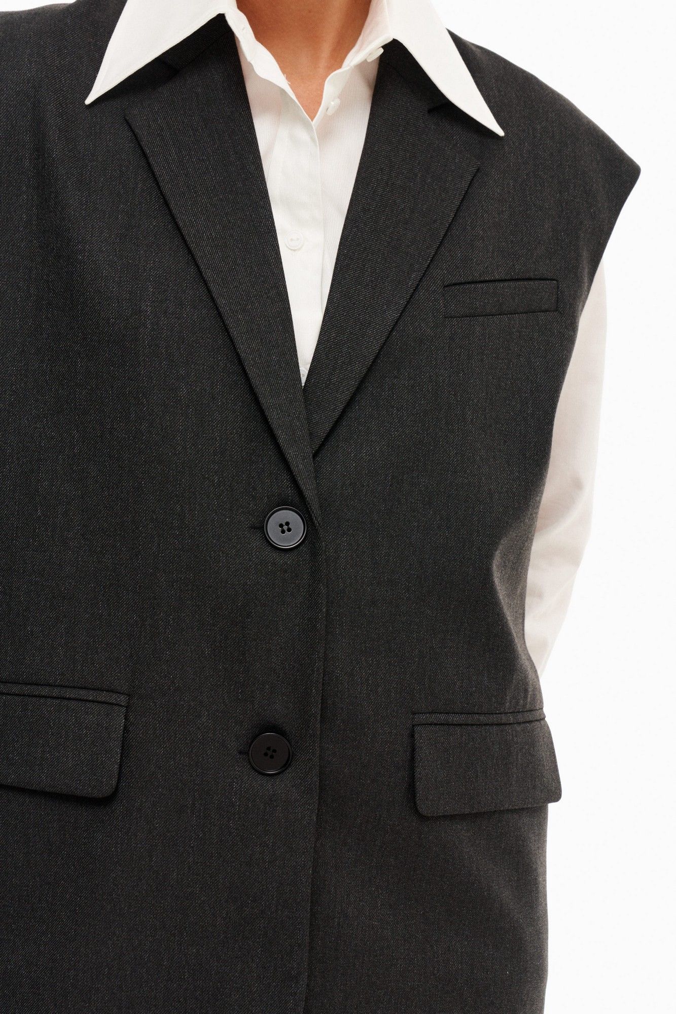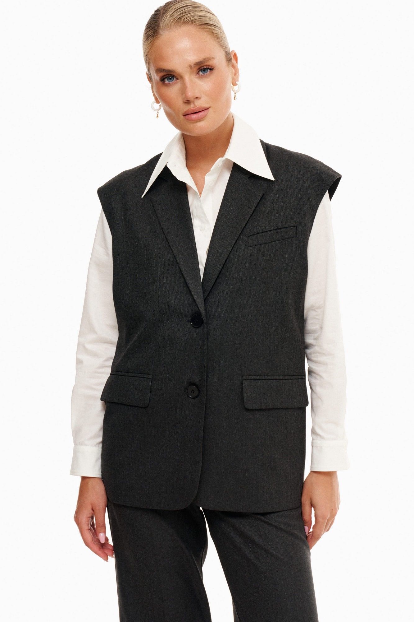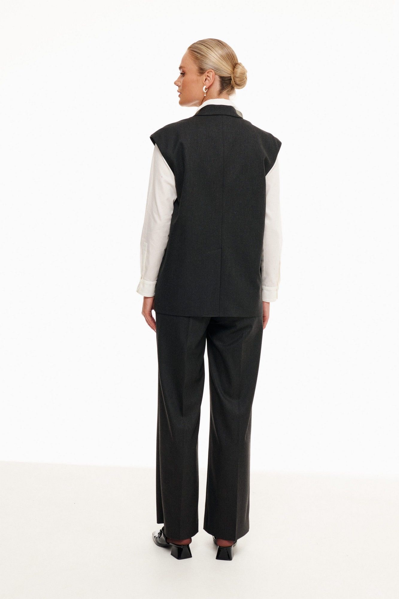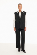 Однобортный жилет свободного силуэта. Воротник пиджачного типа. Спереди карманы с листочкой. Прямые брюки из костюмной ткани с вискозой. По бокам наклонные карманы. Застегиваются брюки на крючок и молнию, по спинке резинка.