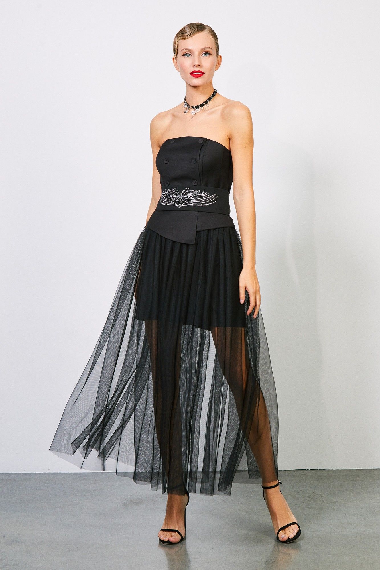 Топ-корсет: - прилегающий силуэт - корсет на косточках - застёжка спереди на два ряда пуговиц - по низу фигурная баска - на подкладке - съёмный пояс с вышивкой .