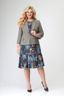 Костюм женский состоит из платья и жакета. Платье выполнено из шифона на шифоновой подкладке. Прямого силуэта, с воланом по низу. Рукав втачной длиной ¾ на манжете. Жакет полуприлегающего силуэта, выполнен из костюмной ткани на подкладке. Воротник пиджачный с лацканом, застёжка в стык на одну пуговицу. Рукав втачной длиной ¾. ПЛАТЬЕ: Длина платья по центру спинки р.50,52 – 103 см, р.54,56 – 105 см (допуск (+-) 2 см) Длина рукава р.50,52 – 47 см, р.54,56 – 48 см (допуск (+-) 1 см) Ширина платья по линии груди ½ р.50 – 55 см, р.52 - 57 см, р.54 – 59 см, р.56 – 61 см (допуск (+-) 1 см) Ширина платья по линии талии ½ р.50 – 53 см, р.52 - 55 см. р.54 – 57 см, р.56 – 59 см (допуск (+-) 1 см) Ширина платья по линии бедра ½ р.50 – 58 см, р.52 – 60 см, р.54 – 62 см. р.56 – 64 см (допуск (+-) 1 см) Ширина рукава под проймой ½ р.50 – 21см, р.52 – 22см, р.54 – 22,5 см, р.56 – 23,5 см (допуск (+-) 1 см) ЖАКЕТ: Длина жакета по центру спинки р.50,52,54,56 – 57 см (допуск (+-) 1 см) Длина рукава жакета р.50,52,54,56 – 49 см (допуск (+-) 1 см) Ширина платья по линии груди ½ р.50 – 53см, р.52 – 55 см, р.54 – 57см, р.56 – 59 см (допуск (+-) 1 см) Ширина платья по линии талии ½ р.50 – 49 см, р.52 – 51 см, р.54 – 53 см, р.56 – 55 см (допуск (+-) 1 см) Ширина платья по линии низа ½ р.50 – 56 см, р.52 – 58 см, р.54 – 60 см, р.56 – 62 см (допуск (+-) 1 см) Ширина рукава под проймой ½ р.50 – 18,5 см, р.52 – 19,5 см, р.54 – 21 см, р.56 – 22 см (допуск (+-) 0,5 см)