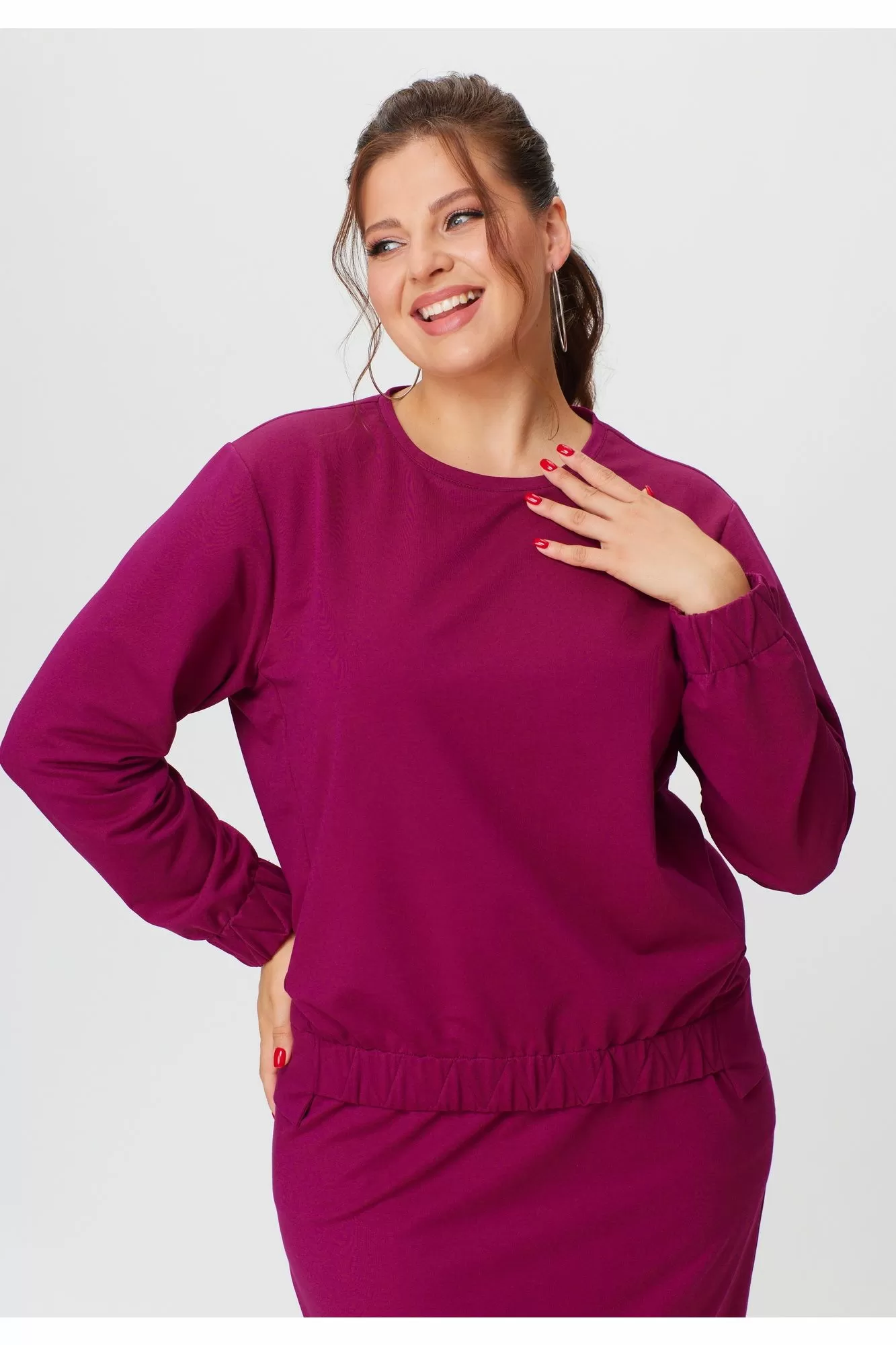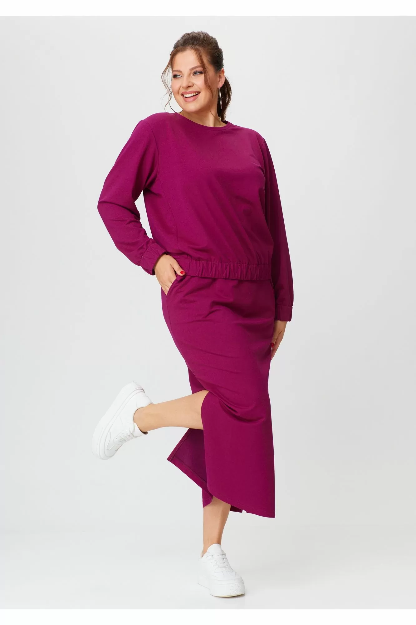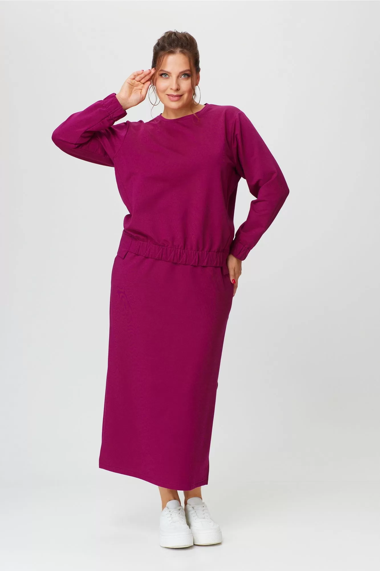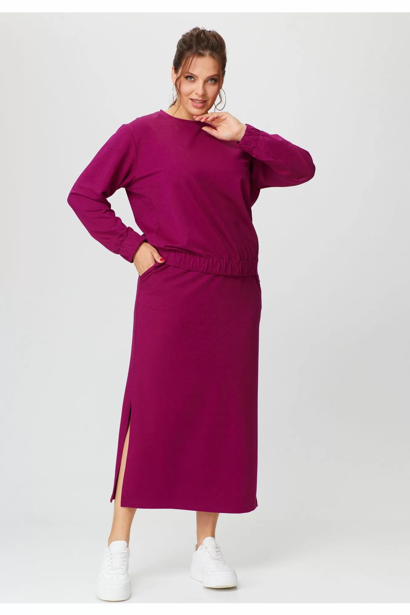Комплект женский, двухпредметный, состоящий из джемпера и юбки. Джемпер прямого силуэта со спущенным рукавом, с круглой горловиной.Перед и спинка разной длиныПо переду и низу рукава резинка с отделочными строчками. Юбка прямая ,с наклонными карманами по переду, пояс притачной по кругу на резинке.