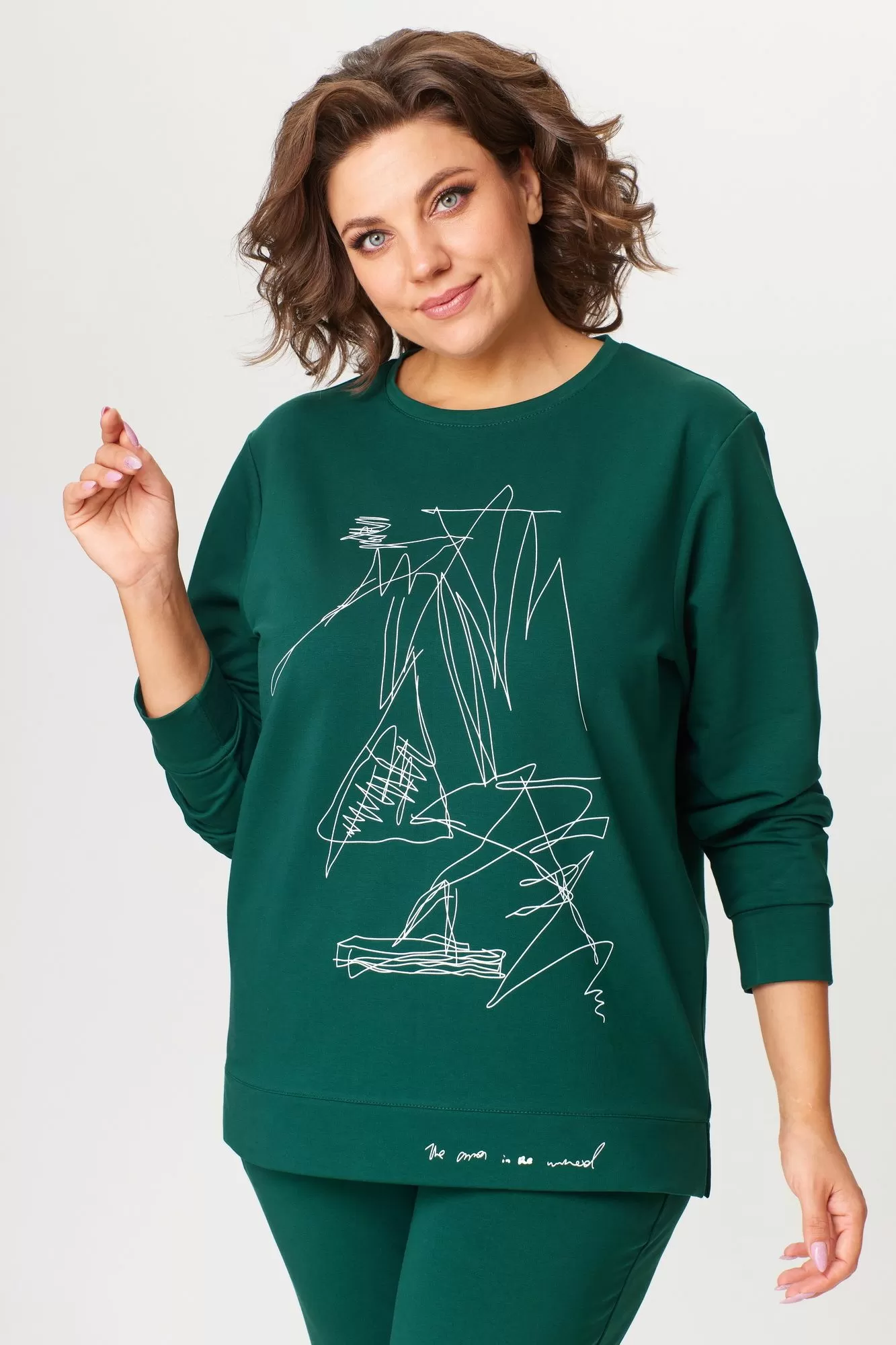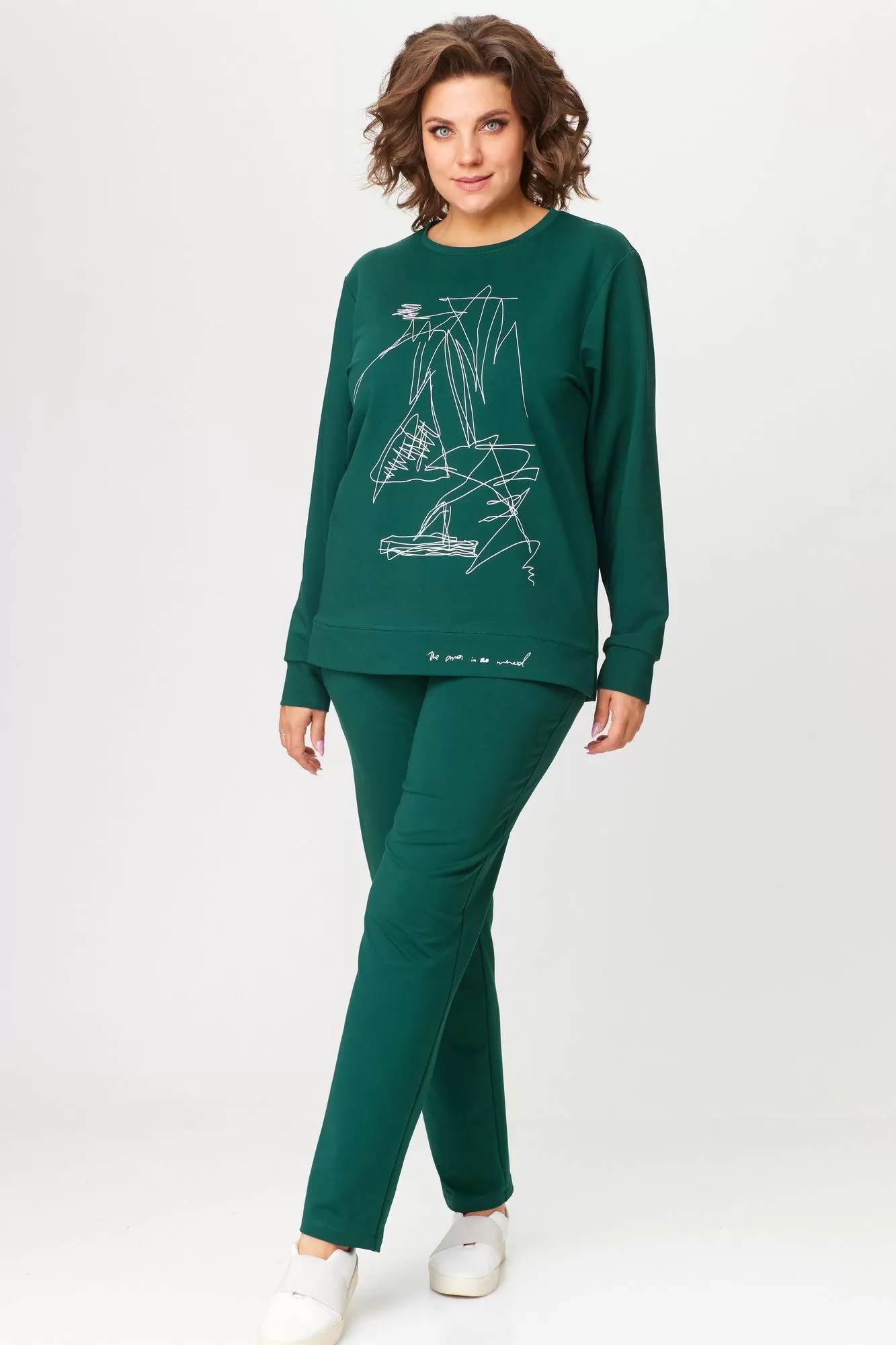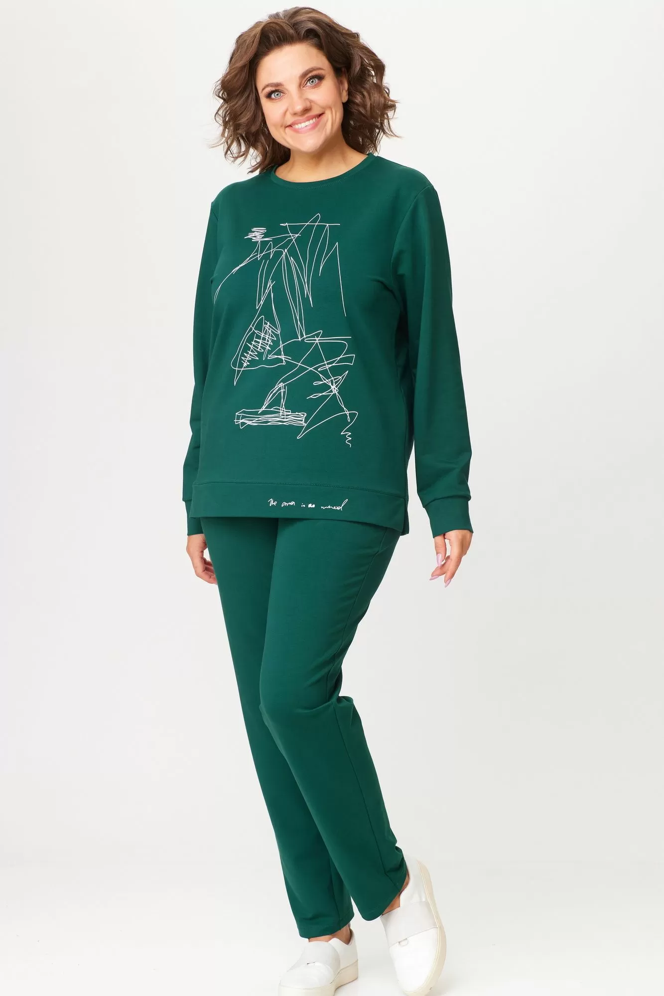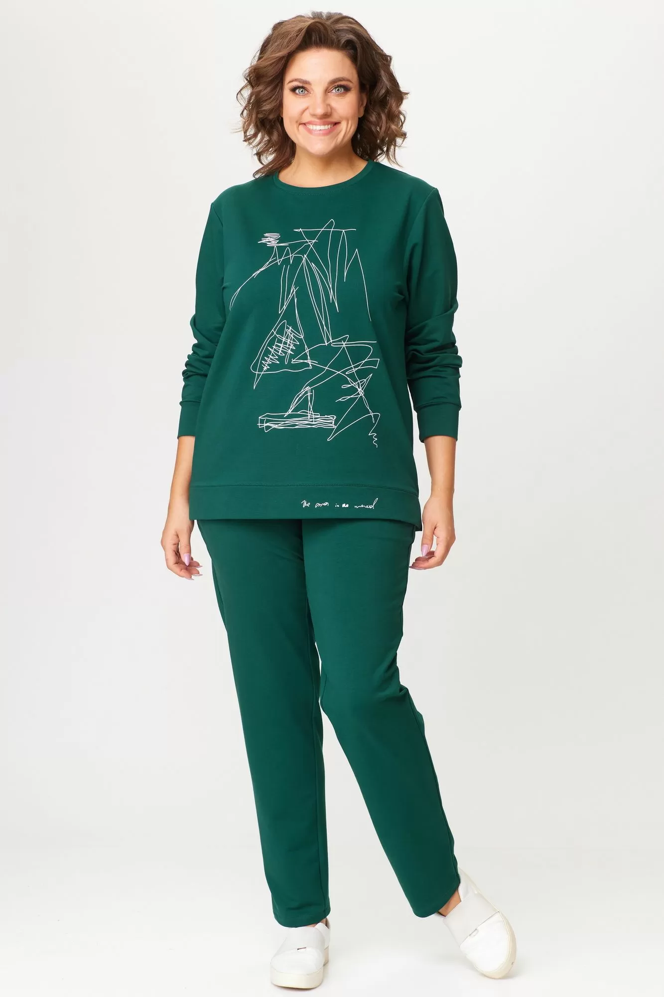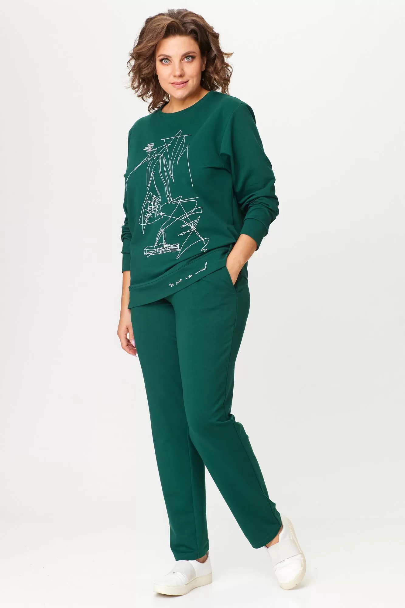 Комплект женский, двухпредметный, состоящий из свитшота и брюк. Свитшот со спущенным рукавом, с круглой горловиной, с планкой по низу,в боковых швах карманы.Рукав на манжете, по переду принт-печать. Брюки зауженные к низу, пояс на резинке.