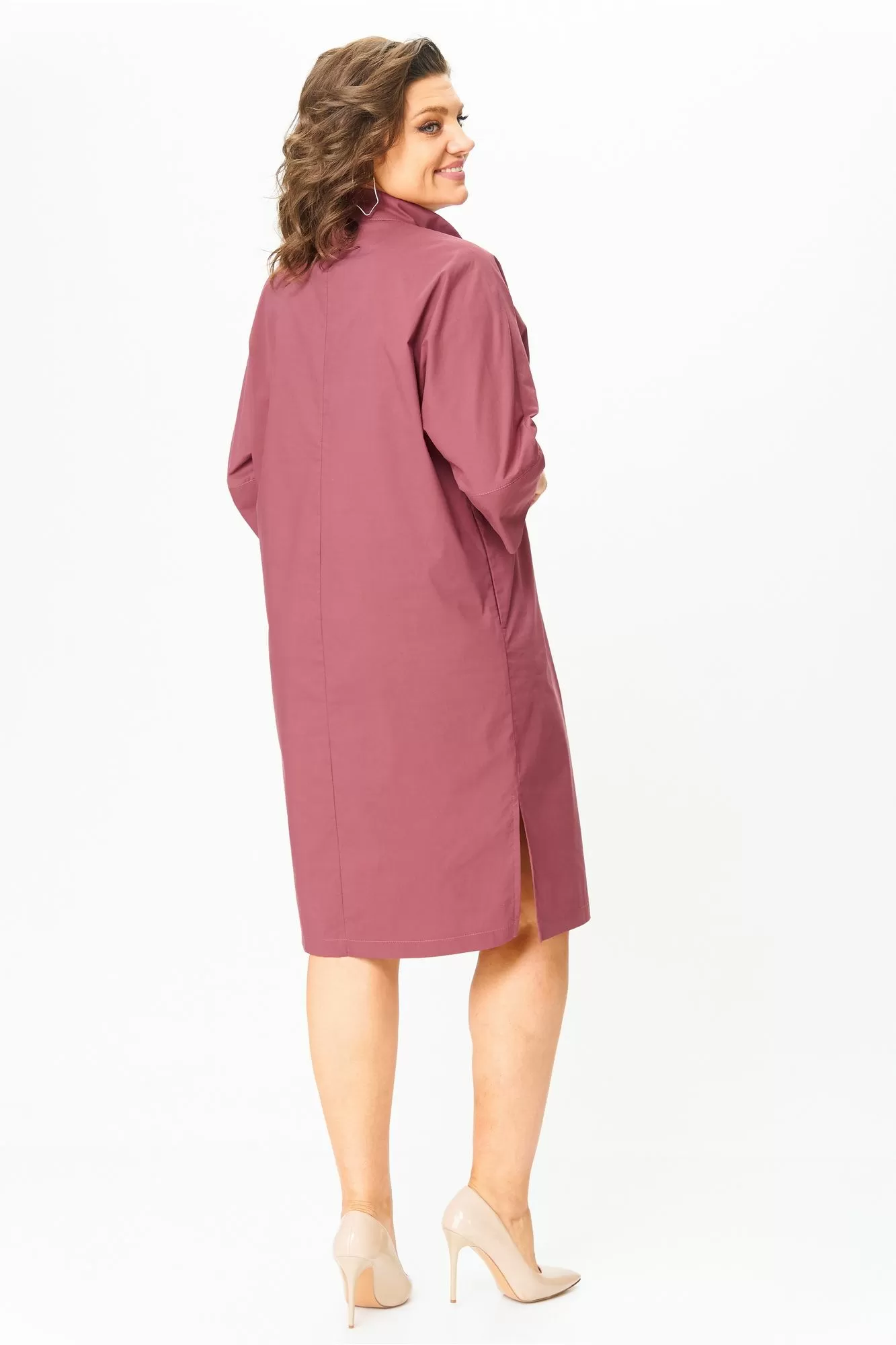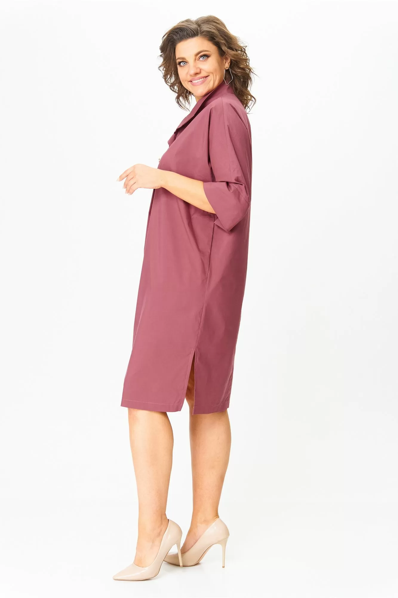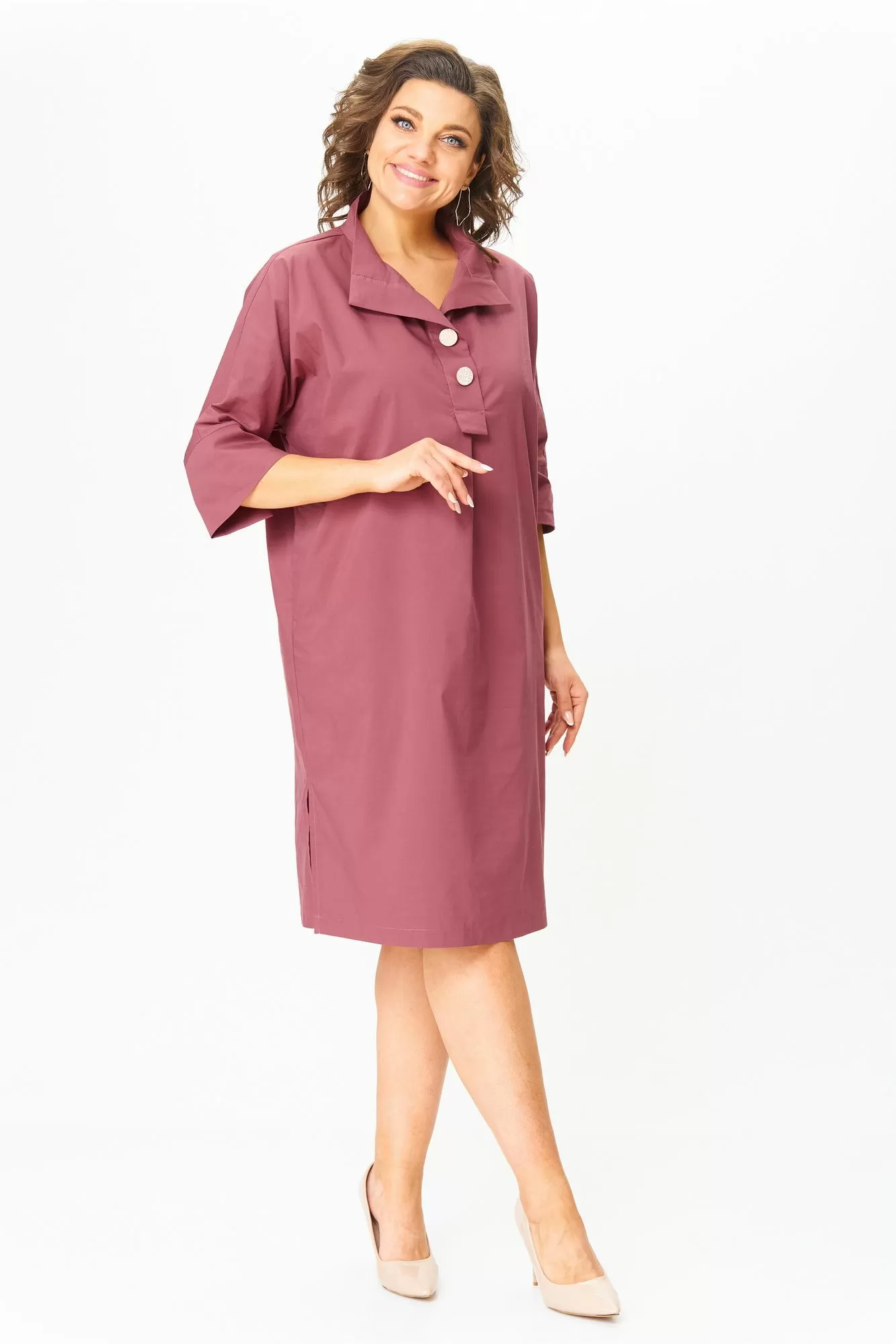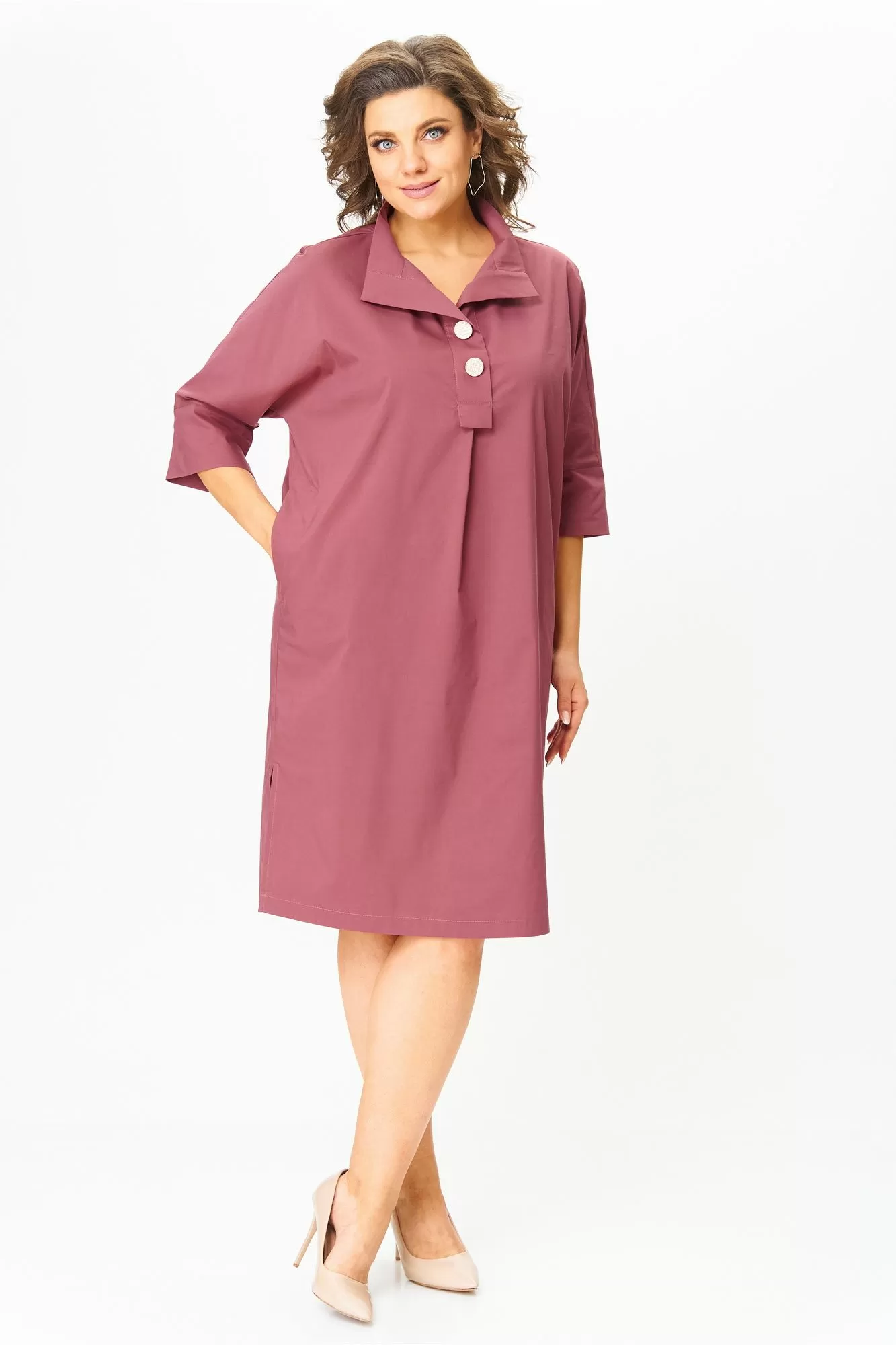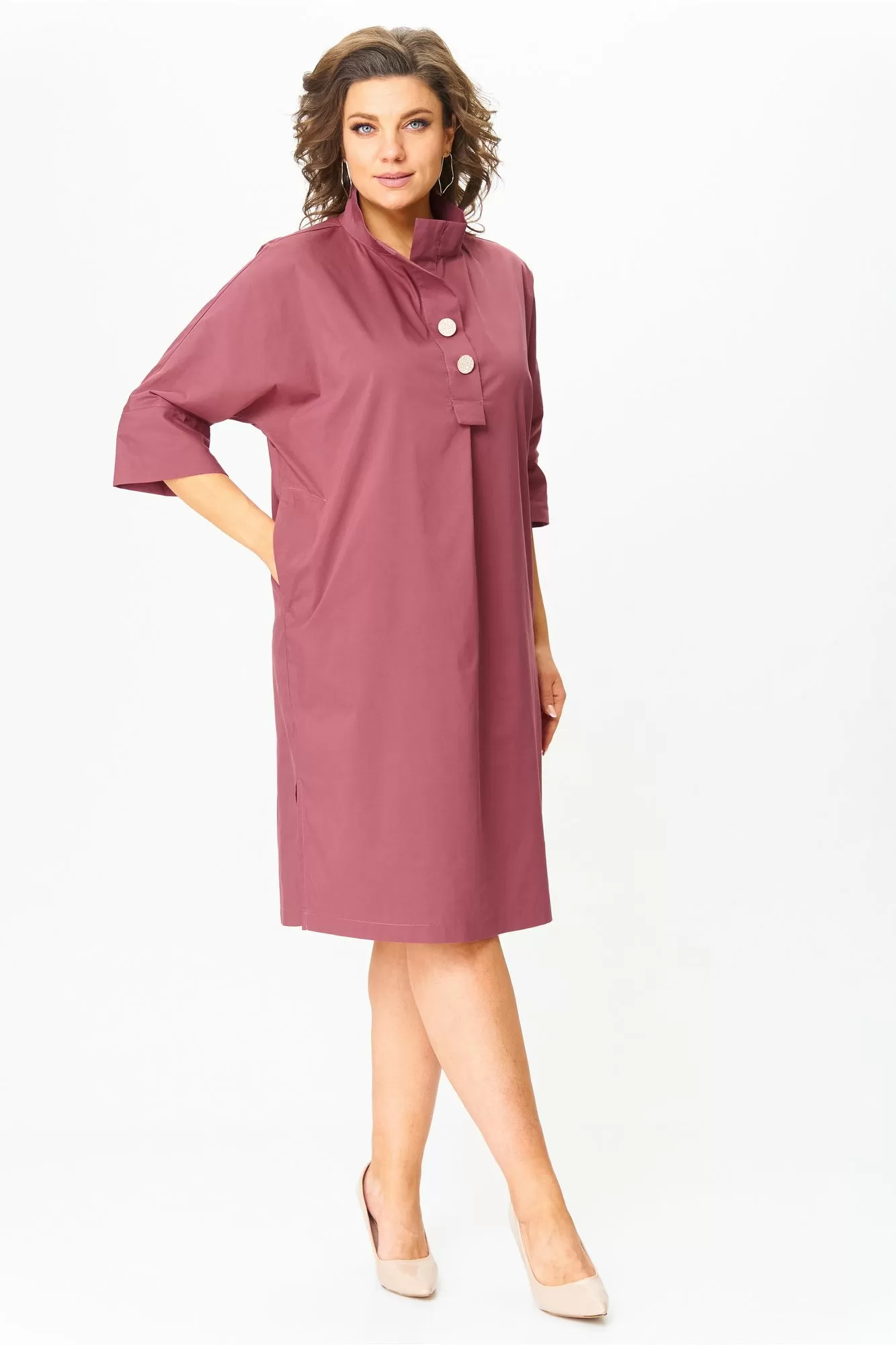 Женское платье, прямого кроя, с рукавом 3/4 на манжете .По переду планка с пуговицами и воротником, в боковых швах карманы. По бокам- разрезы.