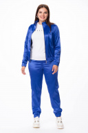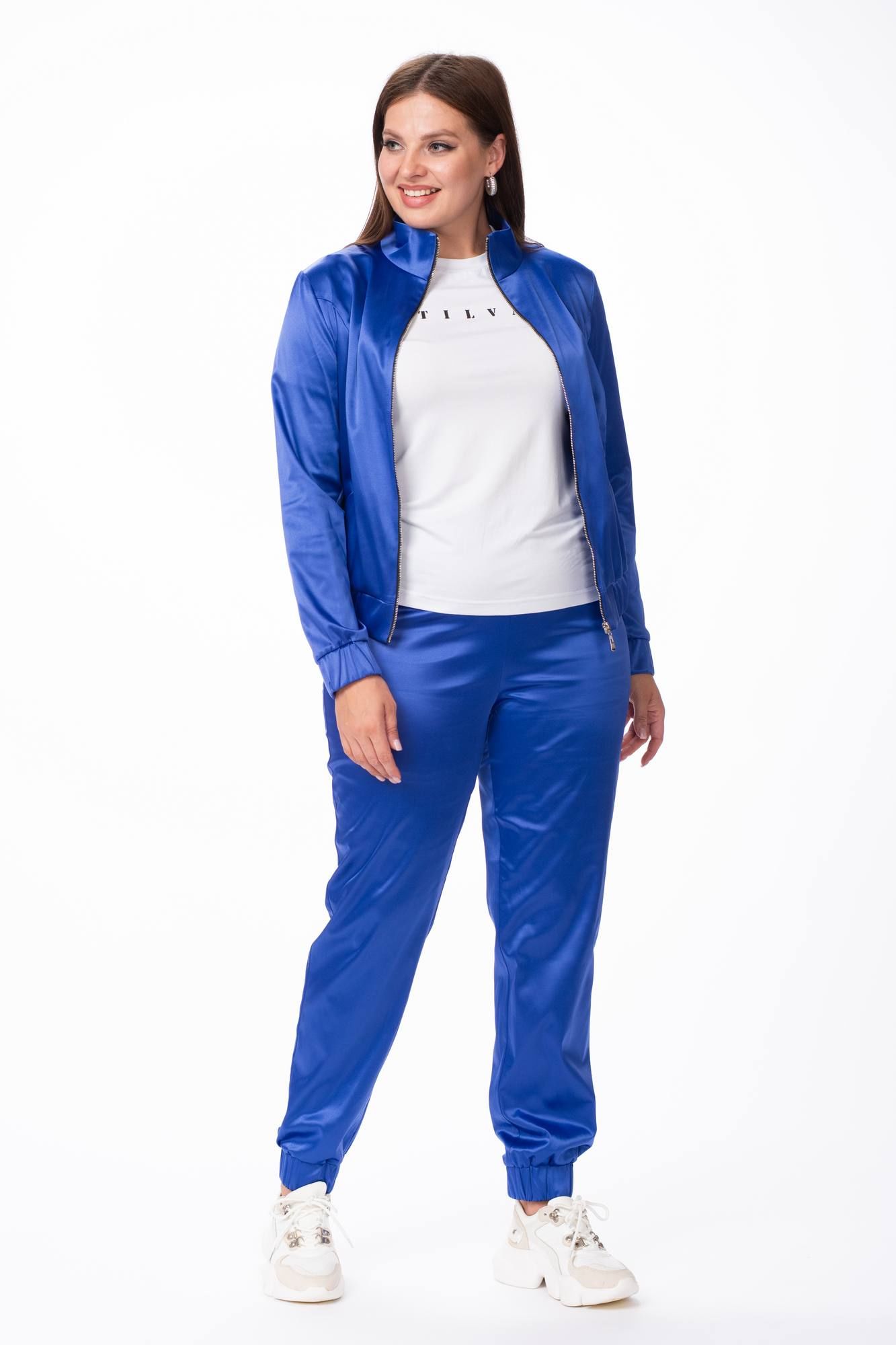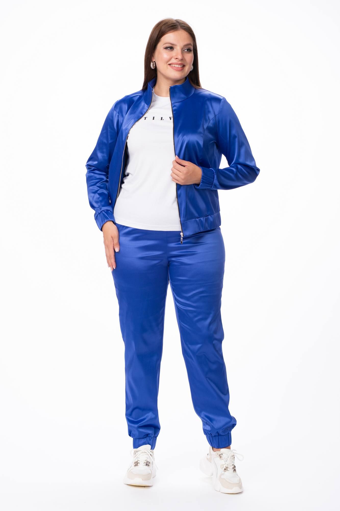 Стильный костюм для современной модницы, выполненный в актуальном стиле спорт-шик. Костюм свободного силуэта изготовленный из комфортной эластичной ткани с содержанием хлопка. Ткань имеет небольшой блеск. По переду бомбера - фигурные рельефы. Застежка на металлическую тесьму-молнию. Воротник - стойка. Карманы в швах рельефов. Рукава длинные с притачной манжетой с эластичной тесьмой-резинкой. Брюки на притачном поясе с эластичной тесьмой-резинкой. Посадка - выше средней. Низ брюк на манжете с эластичной тесьмой-резинкой. Костюм идеально подойдет для прогулок с друзьями. Одежда выходного дня, для летних вечеров. Отличный спортивный костюм для девушек и женщин.