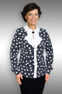 Блуза приталенного силуэта с центральной застежкой, по спинке на стойку. Воротник отложной на стойке. Рукав втачной, одношовный с притачными манжетами. На полочке в качестве отделки настрочены отлетные детали, выполненные как и стойка с воротником из отделочный ткани. Для большего приталивания используется пояс. в левом боку есть потайная молния.Длина изделия 62-66 см, рукава 64 см