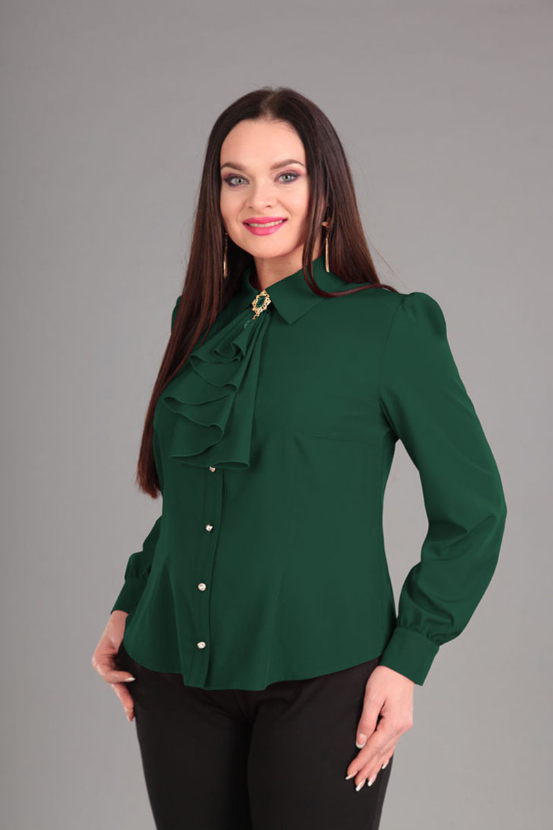 Блуза женская, приталенного силуэта, с нагрудными и талевыми вытачками. Воротник втачной, рубашечный на стойке. Застежка центральная, на планку, к правой части которой пристегивается волан-жабо. Рукав втачной, по окату и к низу присборивается. Манжет на две пуговицы. На стойке как украшение используется брошь.