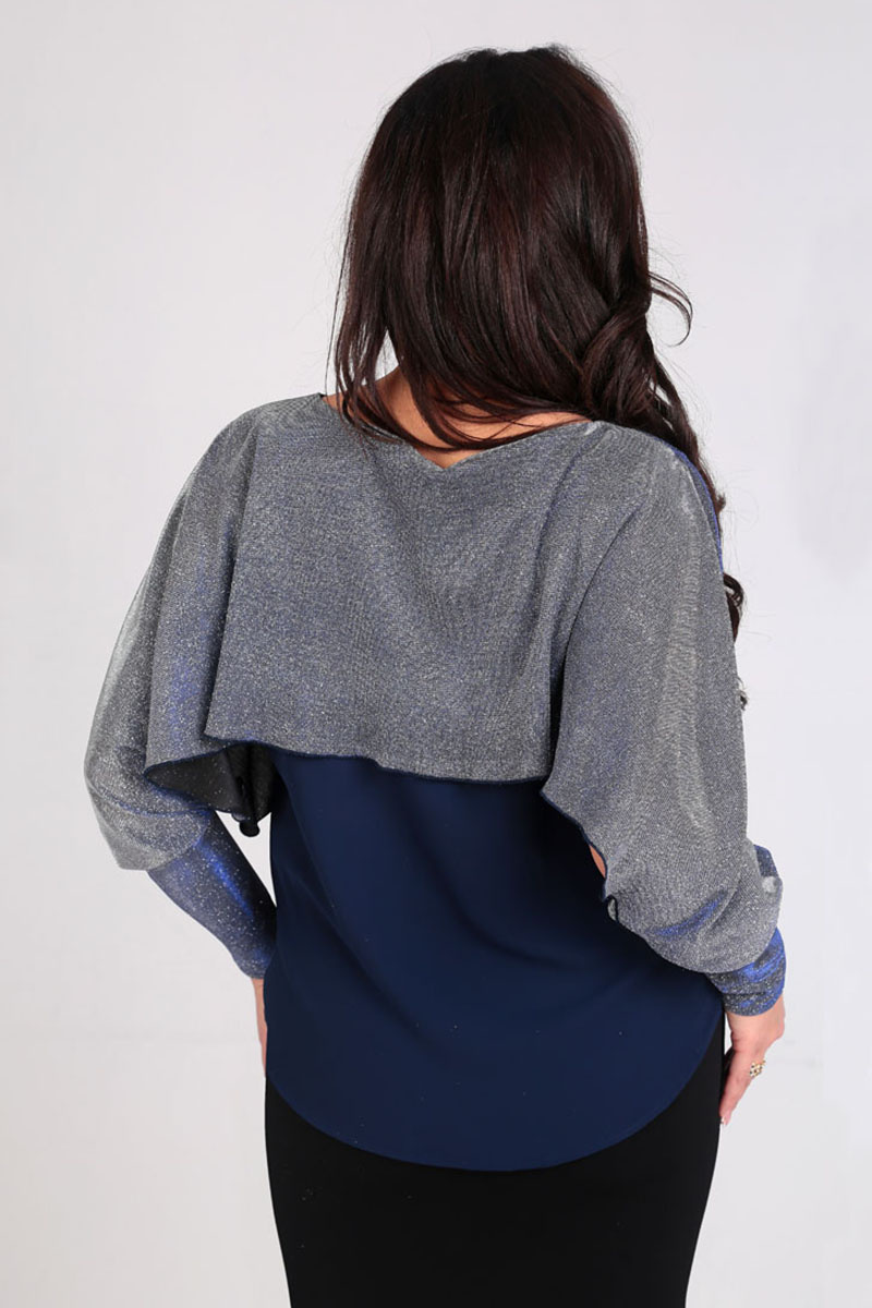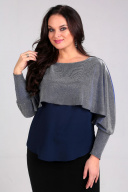 Блуза женская, свободного силуэта. Модель, двойная – в виде майки и болеро, которые вместе соединяются по горловине. Майка с нагрудными выточками, пройма окантована. Болеро накрывает плечи, частично спинку и полочку, верхнюю часть рук, и фиксируется на руке манжетой.