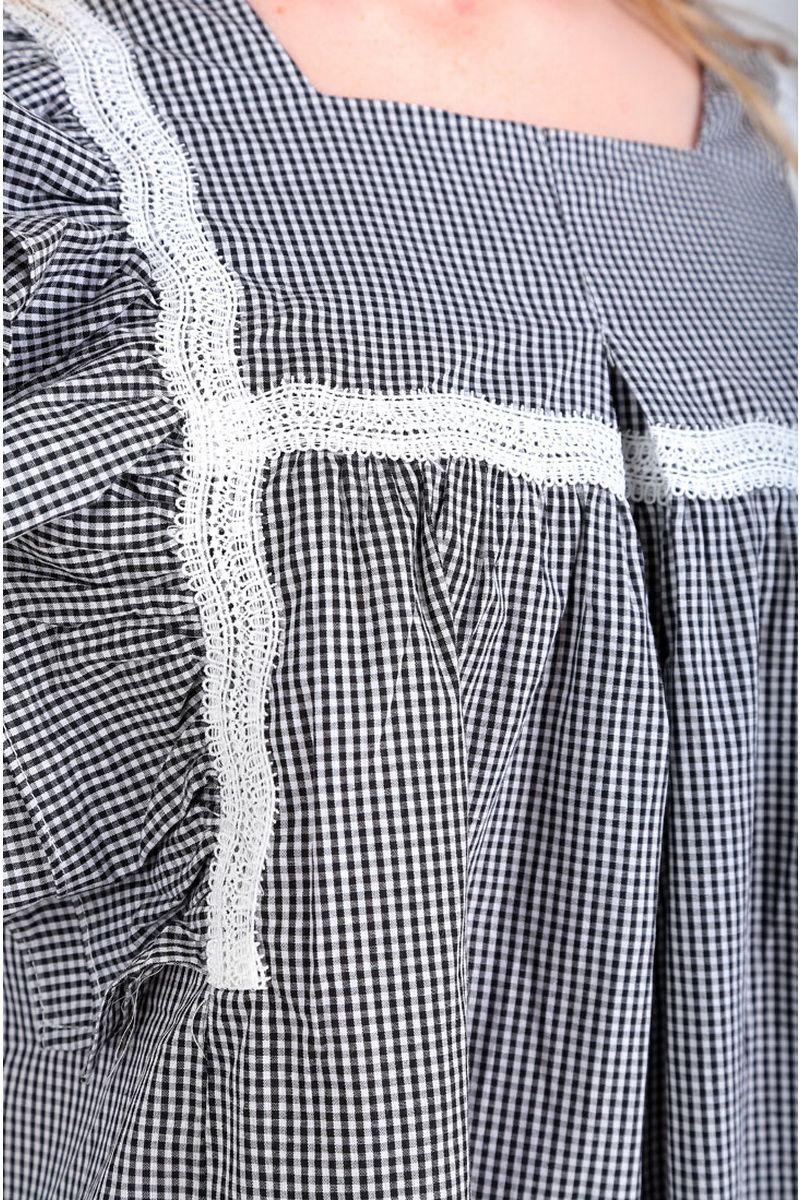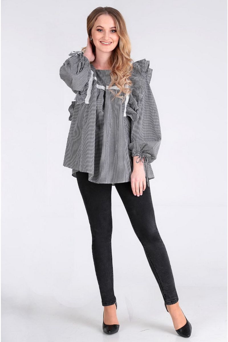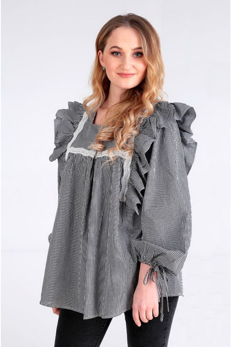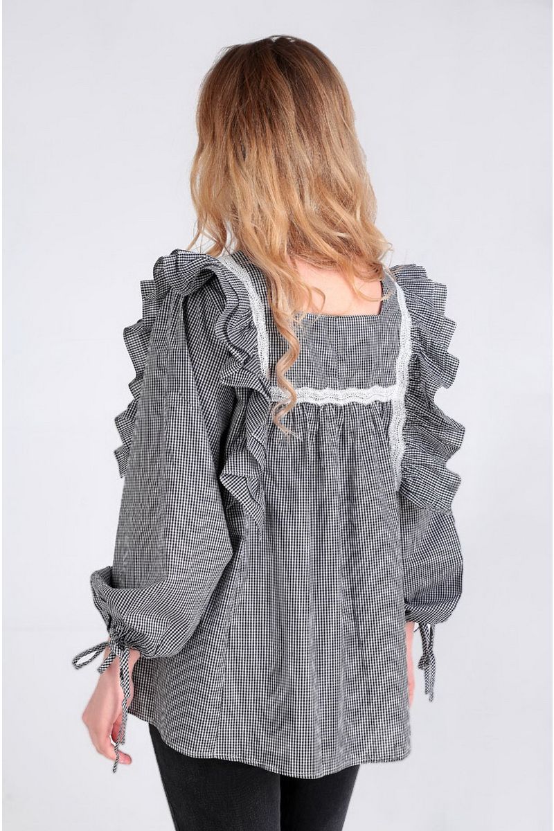 Свободная молодежная блуза one size (единый размер р. 46-50) в стиле кантри из натуральной ткани с принтом «клетка». Блуза с кокеткой, с декорирующими элементами, такими как рюши и кружево. Вырез горловины квадратный. Рукава втачные, длинные и широкие, собранные снизу на резинке, что позволяет регулировать длину. Блуза с кокеткой «А»-силуэта уместна в любой обстановке: в офисе, на отдыхе, в повседневных делах.
