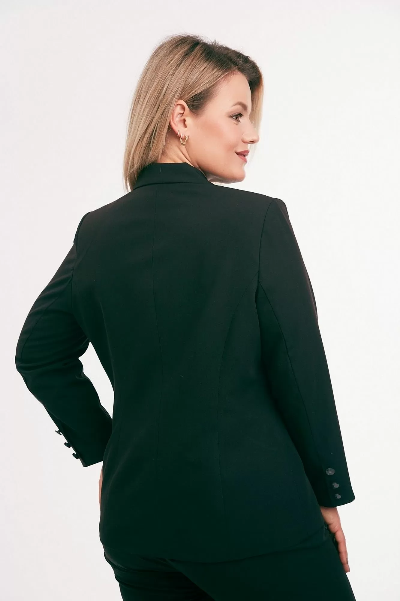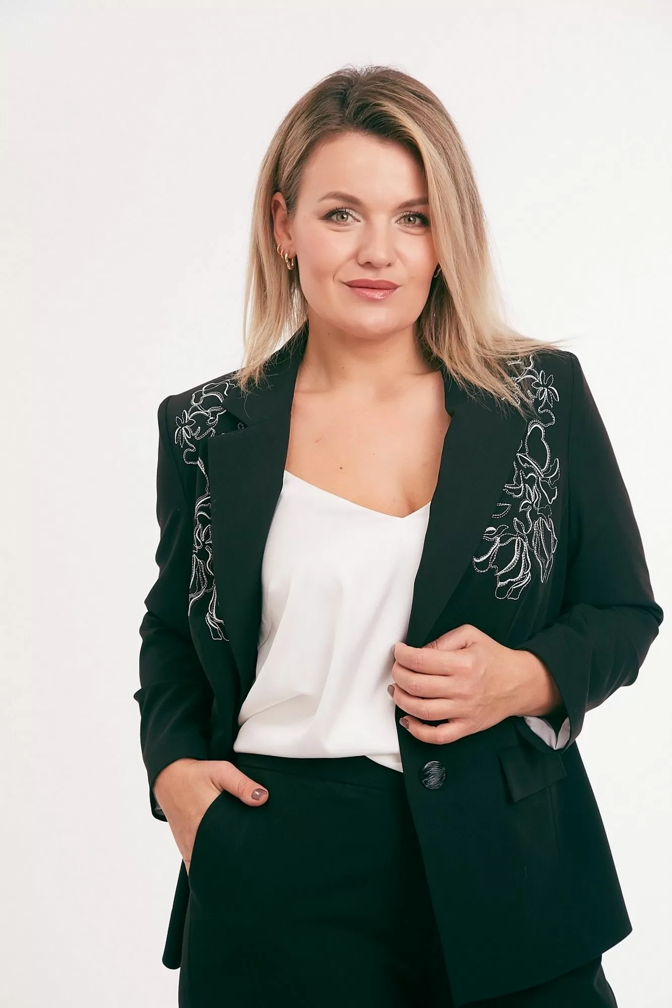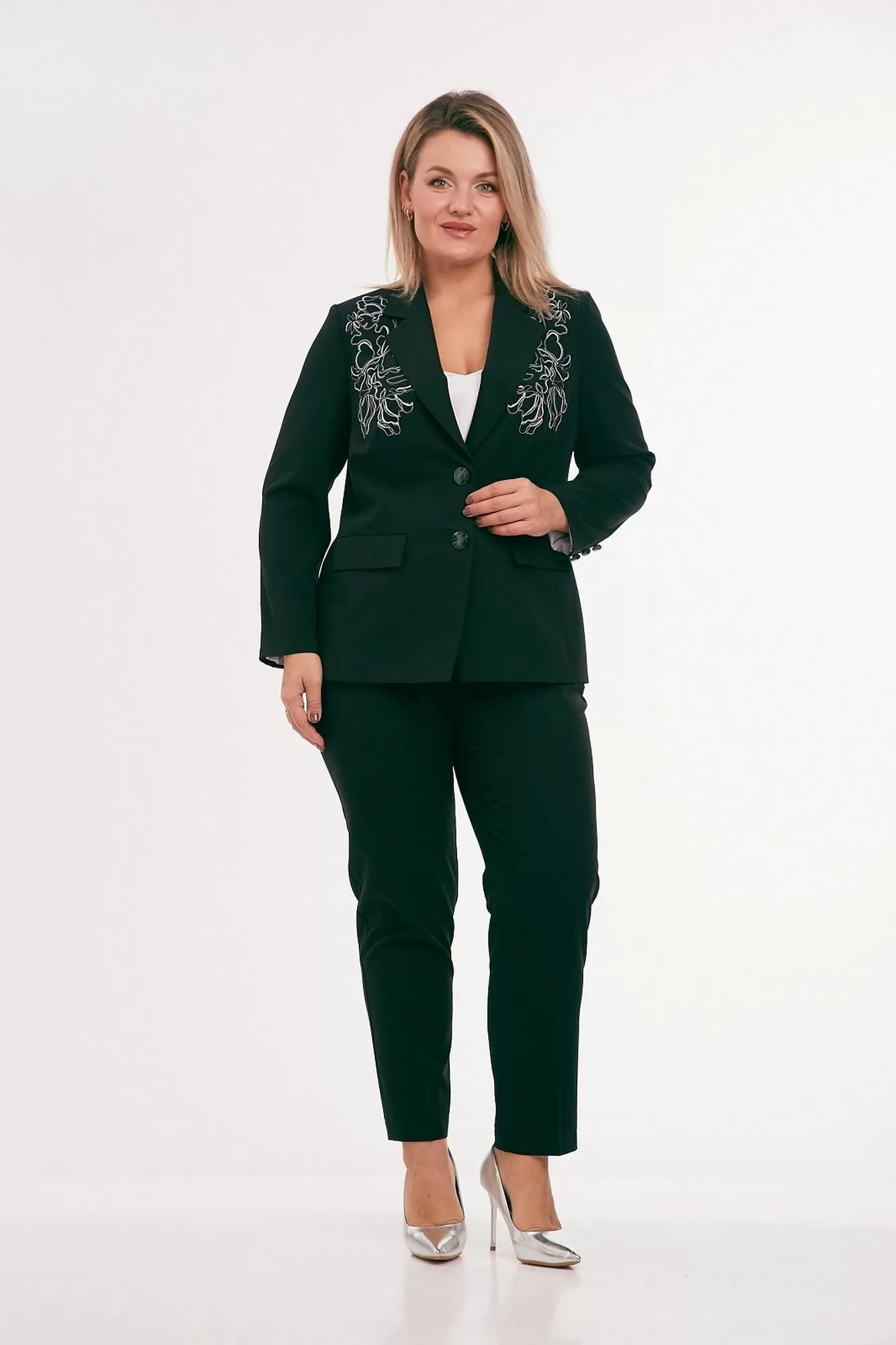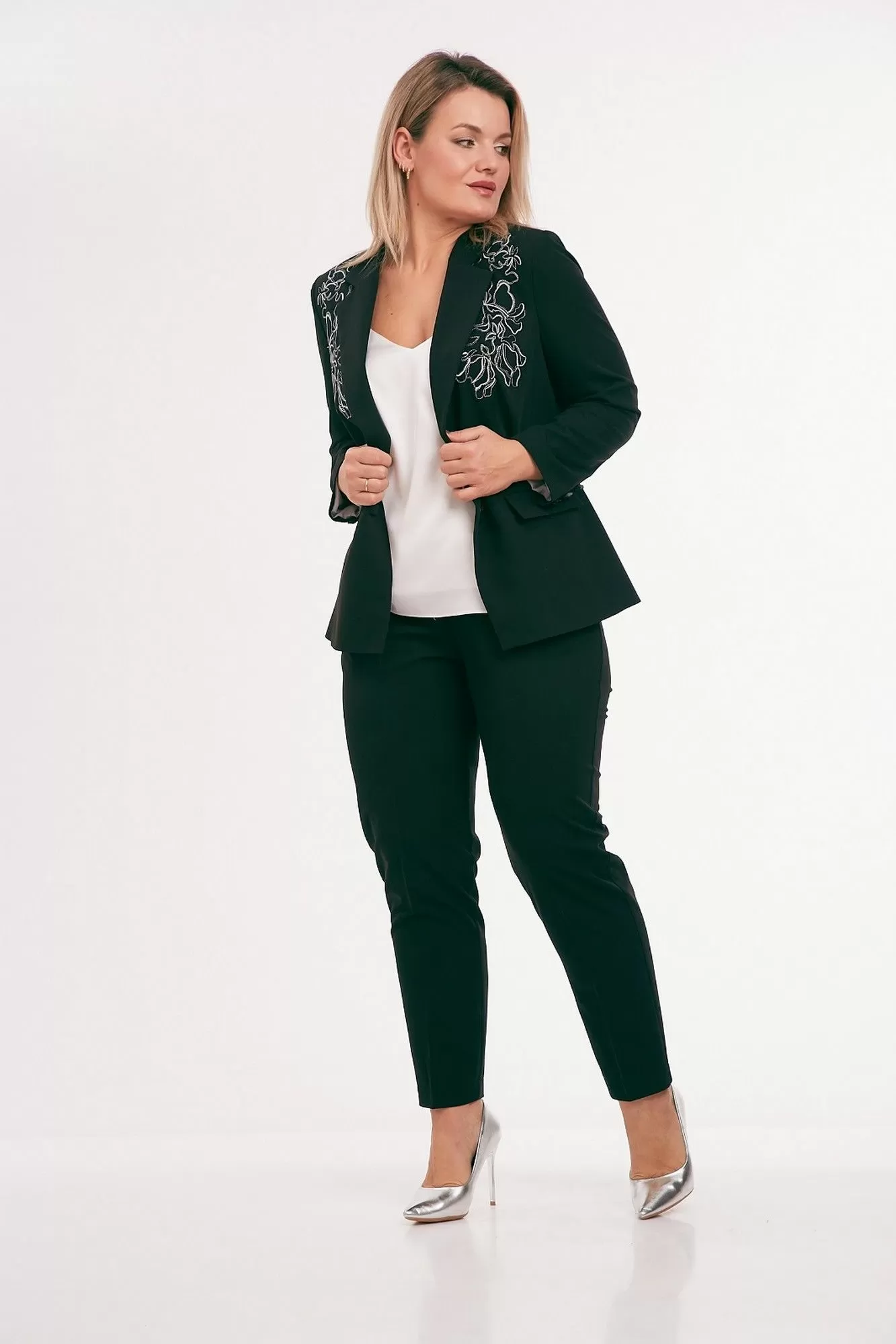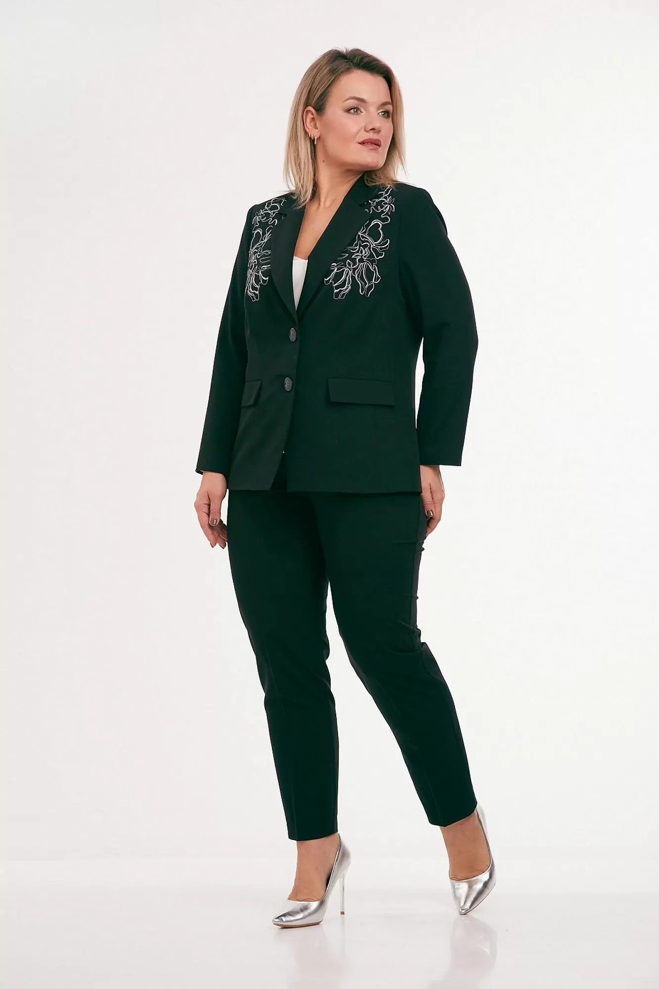 Жакет из костюмной ткани на подкладке, полуприлегающего силуэта, с отложным воротником и лацканами, с центральной бортовой застежкой на петли и пуговицы. Перед с талиевыми вытачками, прорезными карманами с клапаном и вышивкой в области груди. Спинка со средним и рельефными швами. Рукав втачной двухшовный. Воротник отложной пиджачного типа.