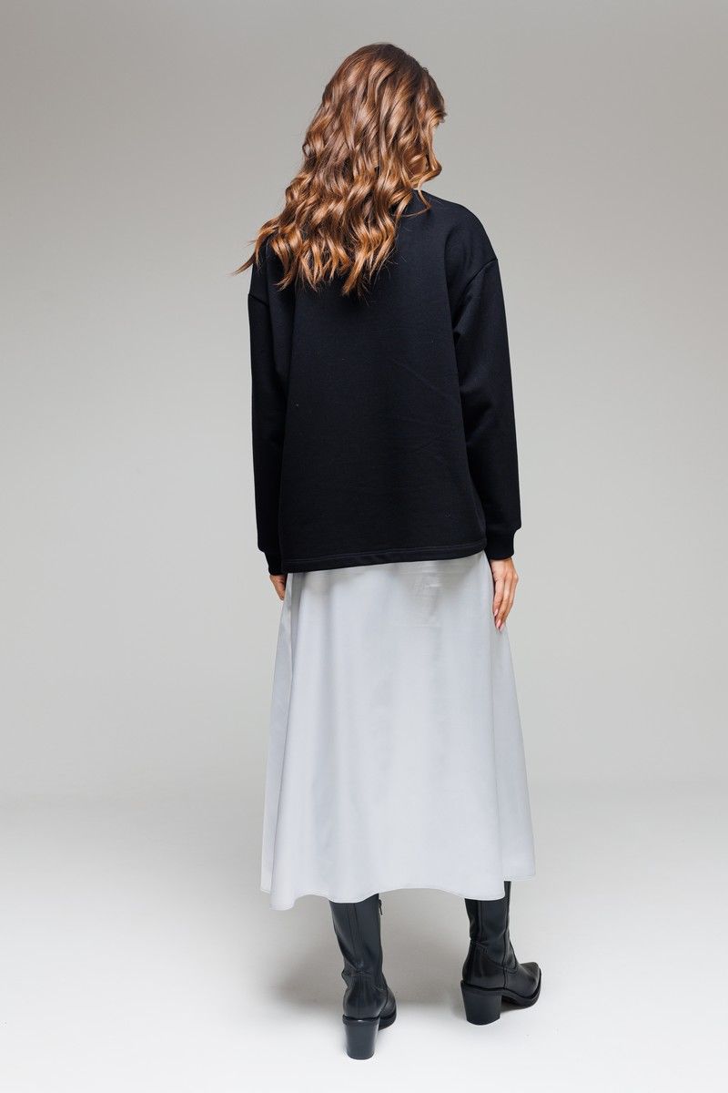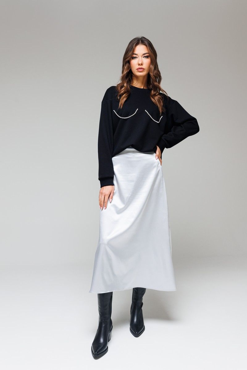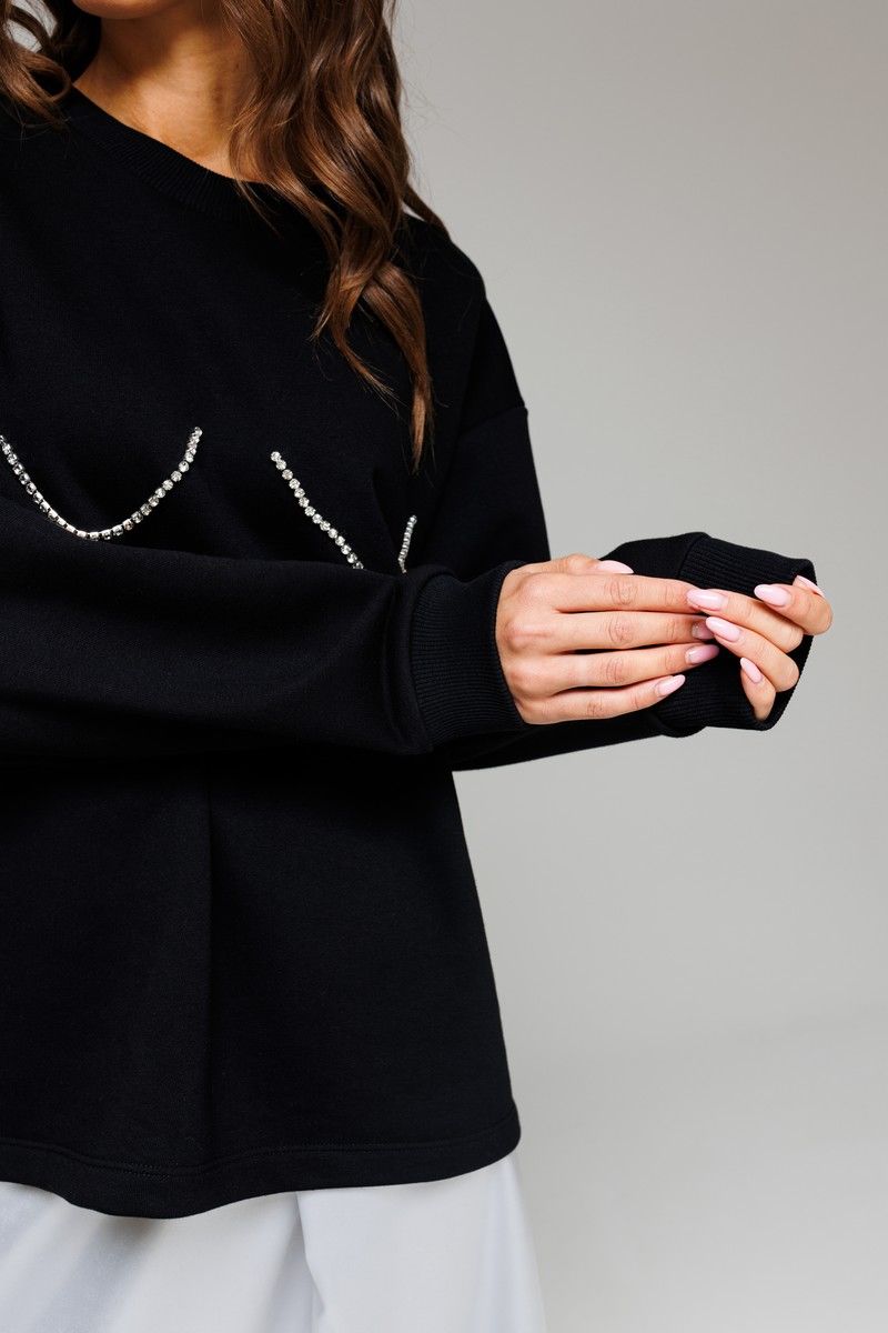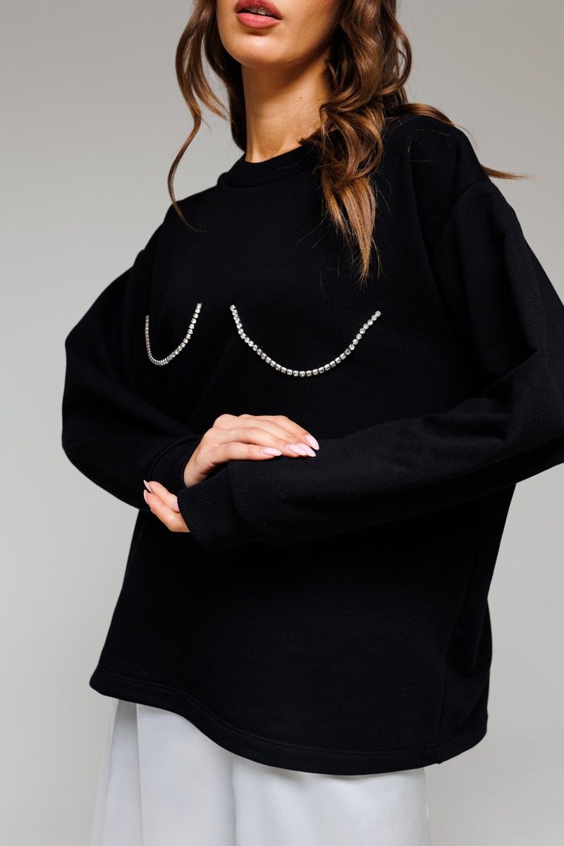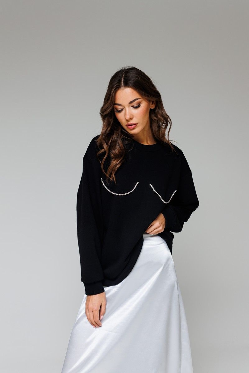 Ультро-современный, женственный джемпер оверсайз из хлопкового трикотажа с вставкой из страз, в виде женской груди, по середине. Рукав на манжете, круглая горловина. Вы не останетесь незамеченной. Премиальное качество.