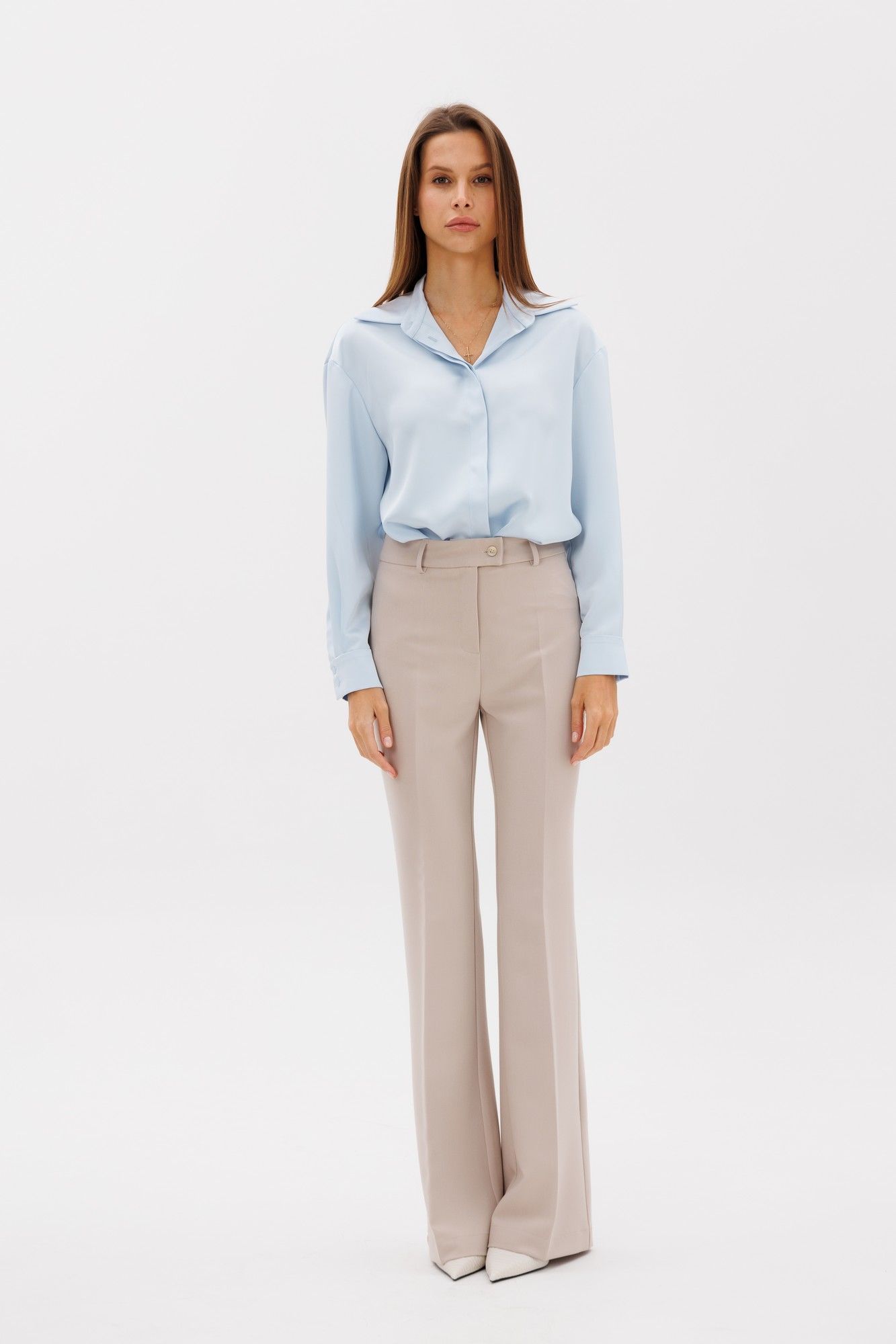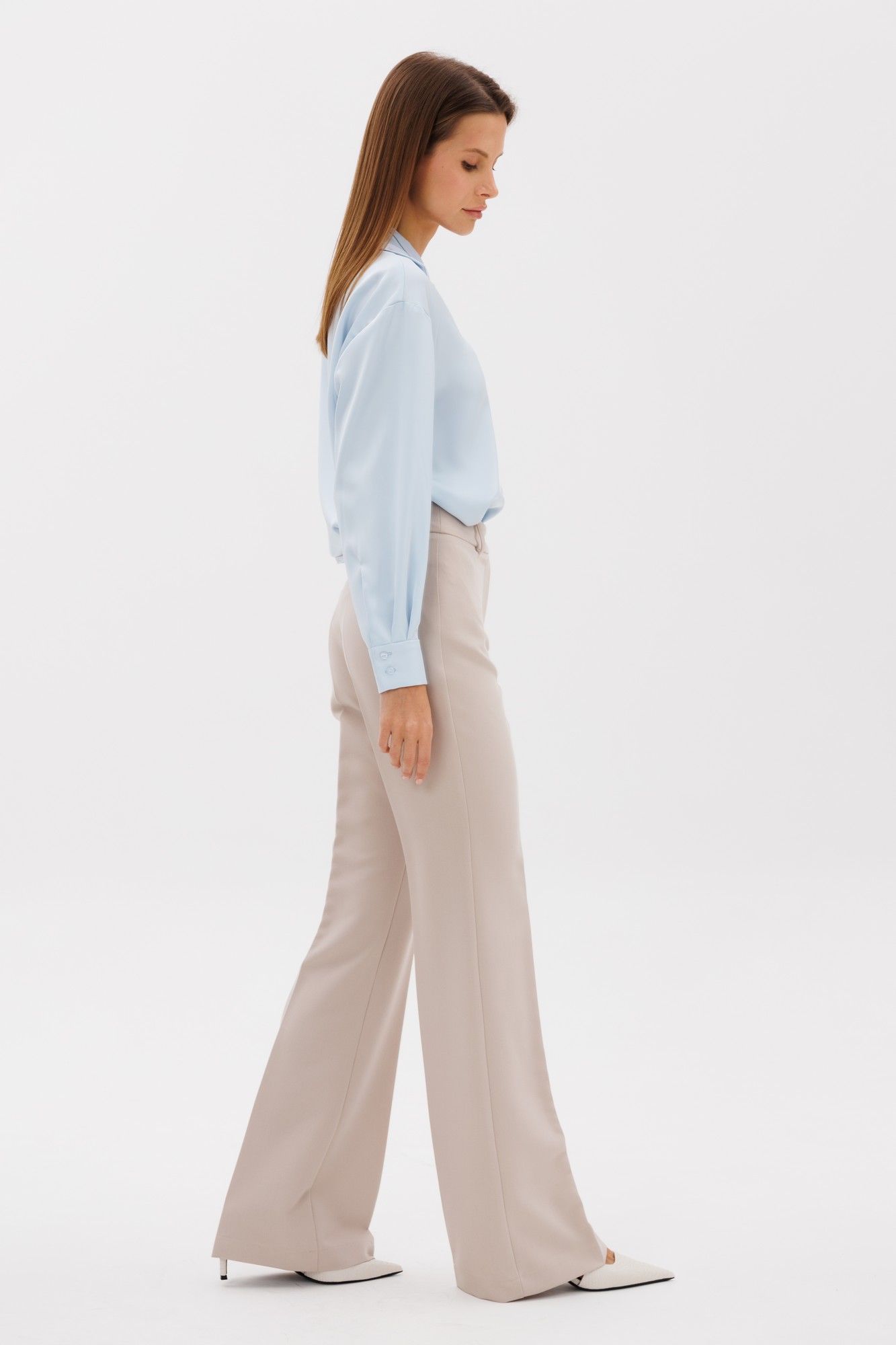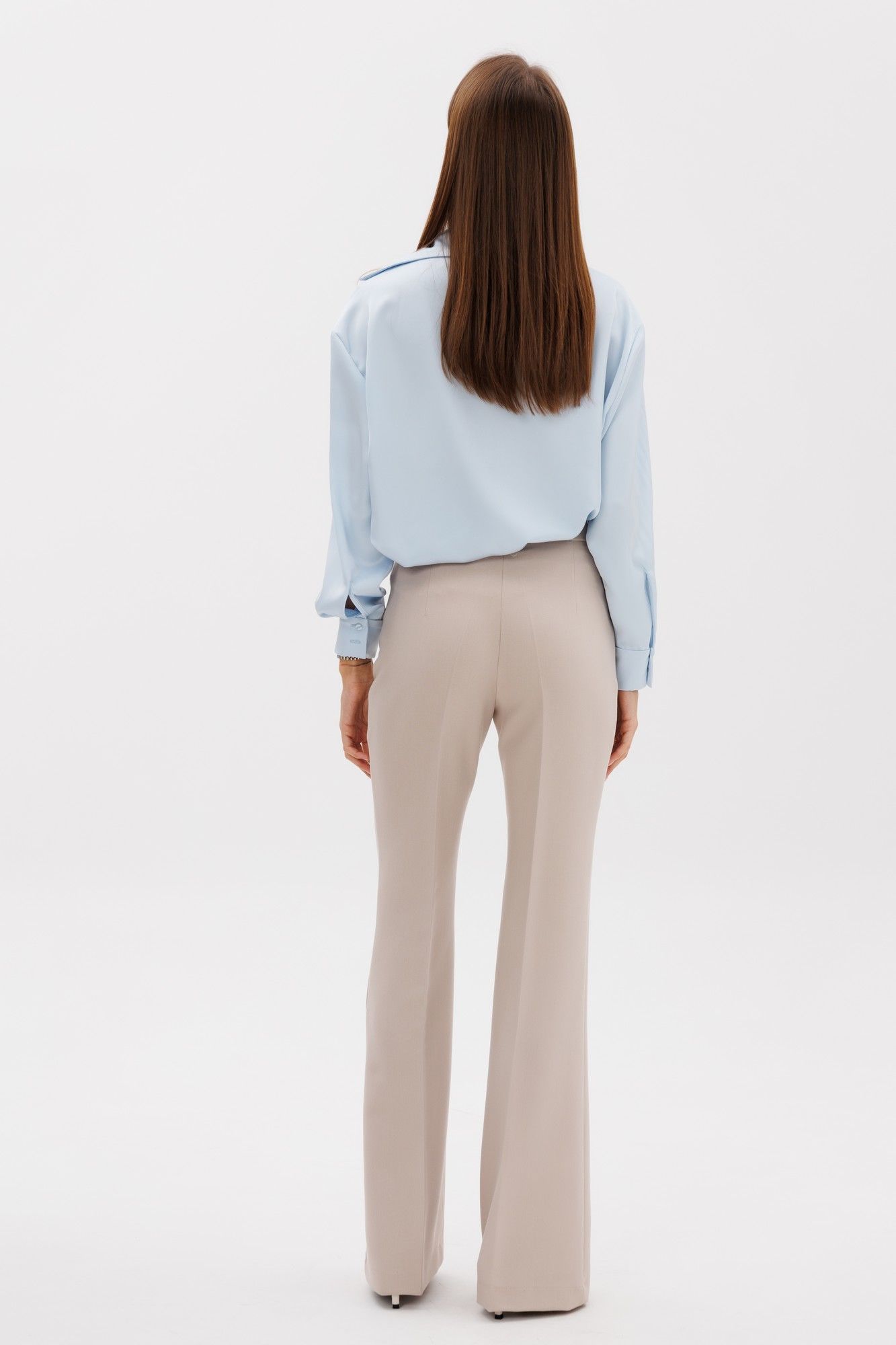 Классические расклешенные брюки полупрелегающего силуэта с высокрй посадкой, пояс притачной со шлевками, застежка на молнию и петлю-пуговицу, брюки без карманов. Выполнены из премиальной ткани костюмной группы. Визуально удлиняют ноги и делают фигуру более женственной. Длина по боковому шву 111 см, полуобхват талии 35 см, полуобхват бедер 45 см , высота посадки 30 см в 42-м размере.