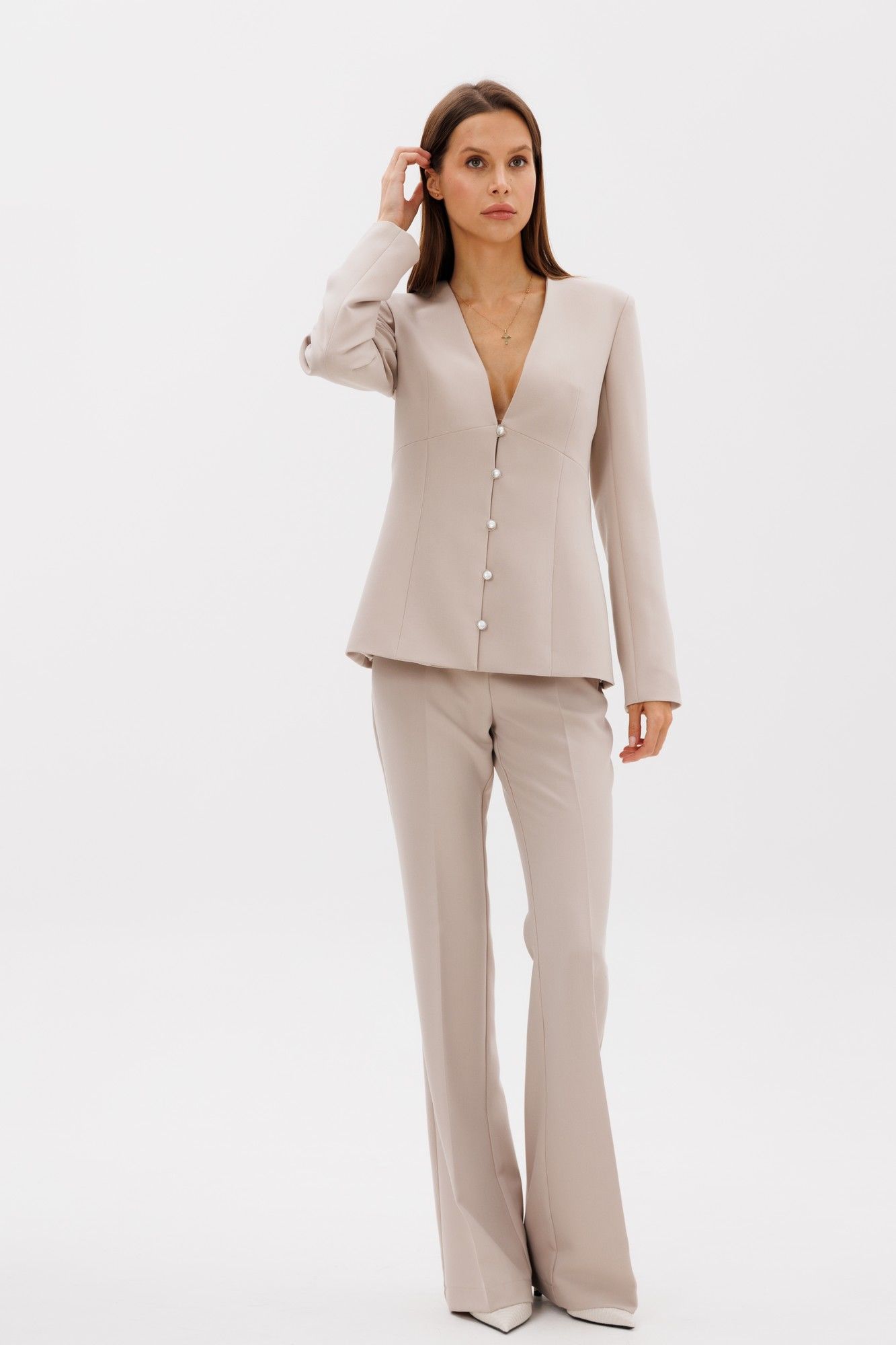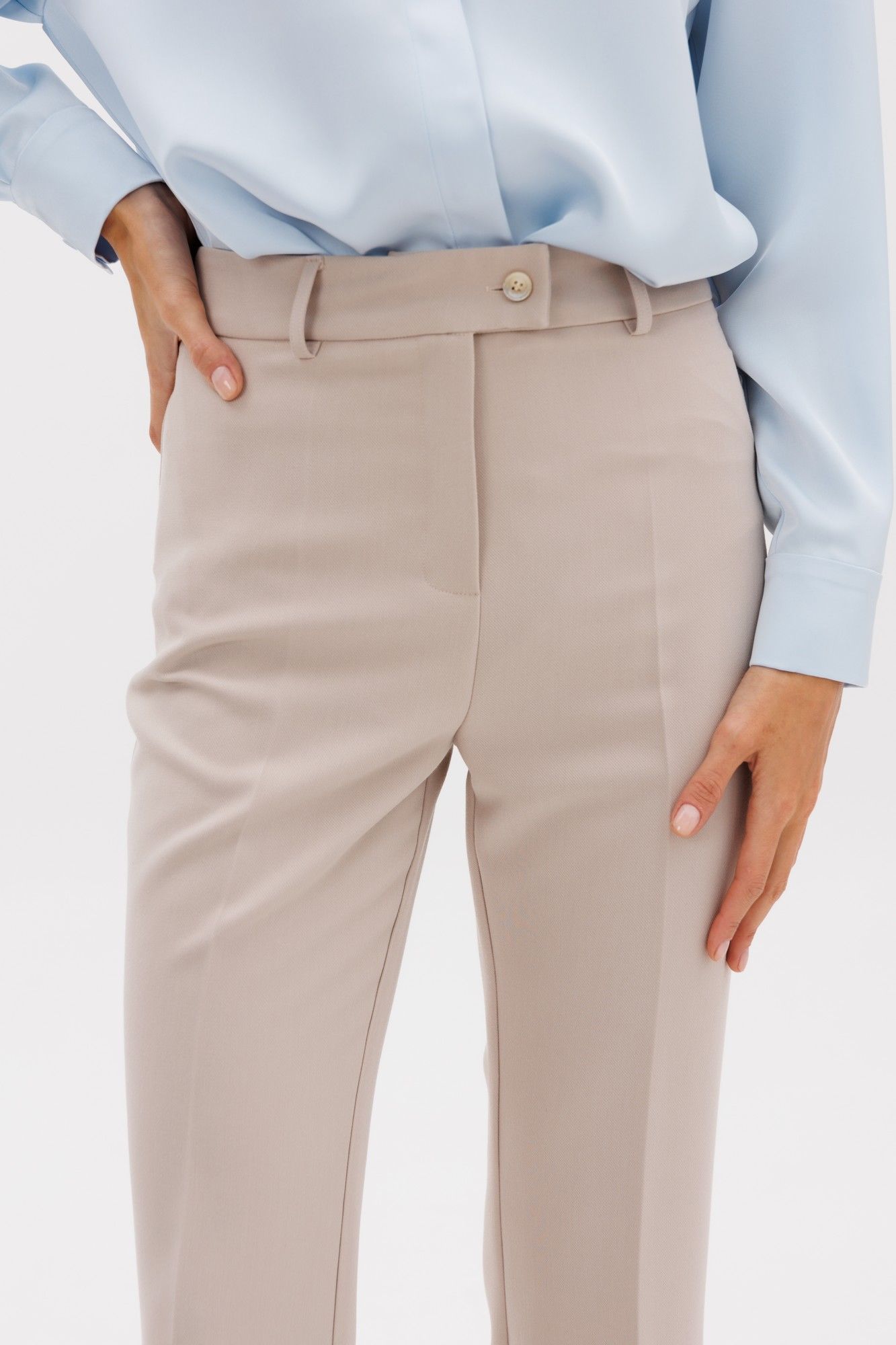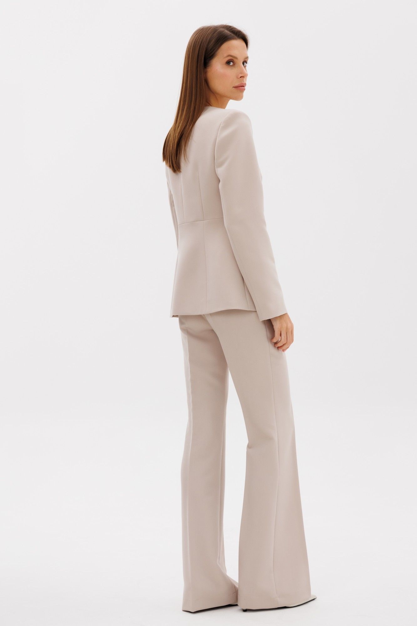 Классические расклешенные брюки полупрелегающего силуэта с высокрй посадкой, пояс притачной со шлевками, застежка на молнию и петлю-пуговицу, брюки без карманов. Выполнены из премиальной ткани костюмной группы. Визуально удлиняют ноги и делают фигуру более женственной. Длина по боковому шву 111 см, полуобхват талии 35 см, полуобхват бедер 45 см , высота посадки 30 см в 42-м размере.