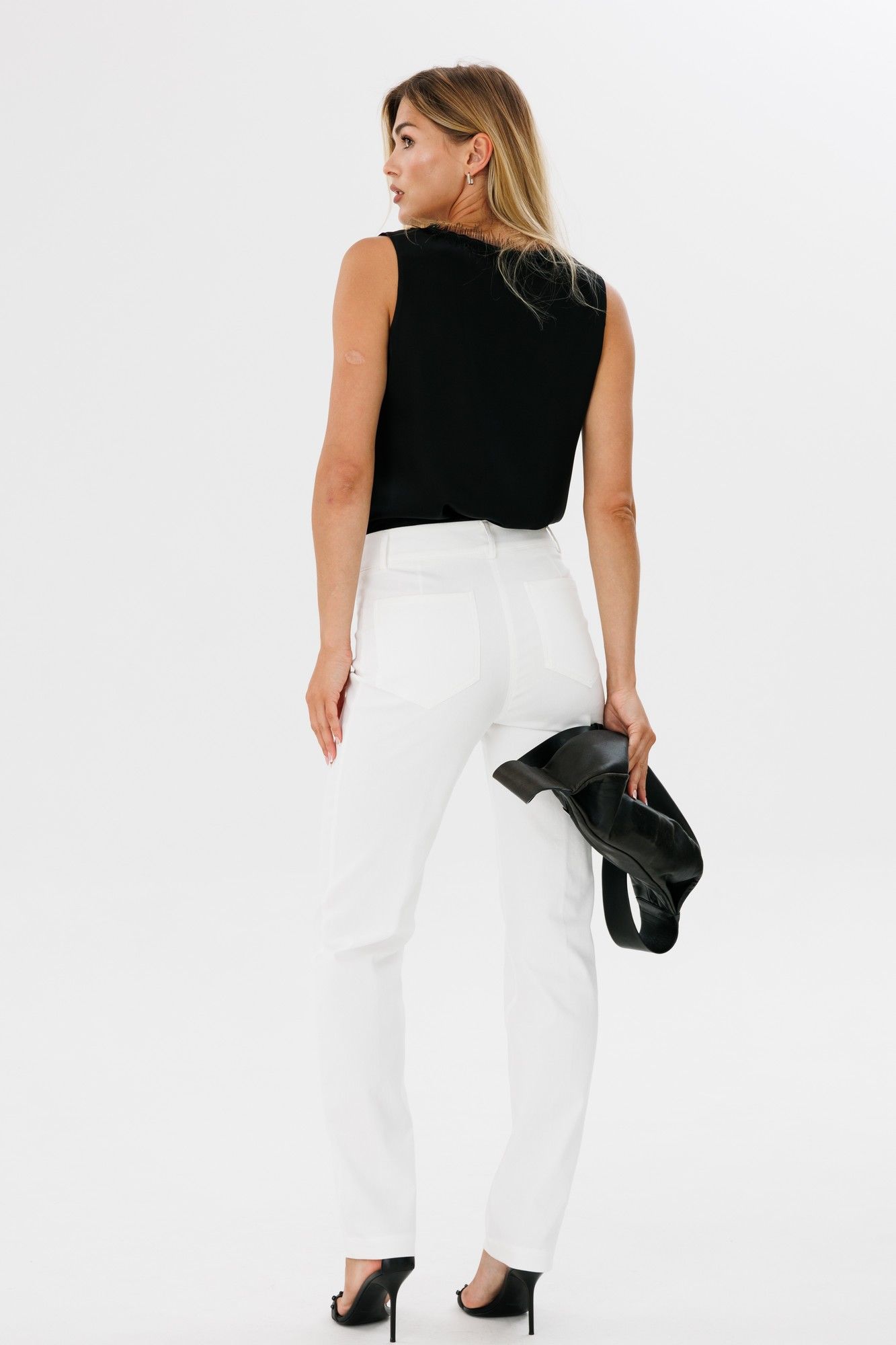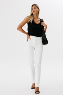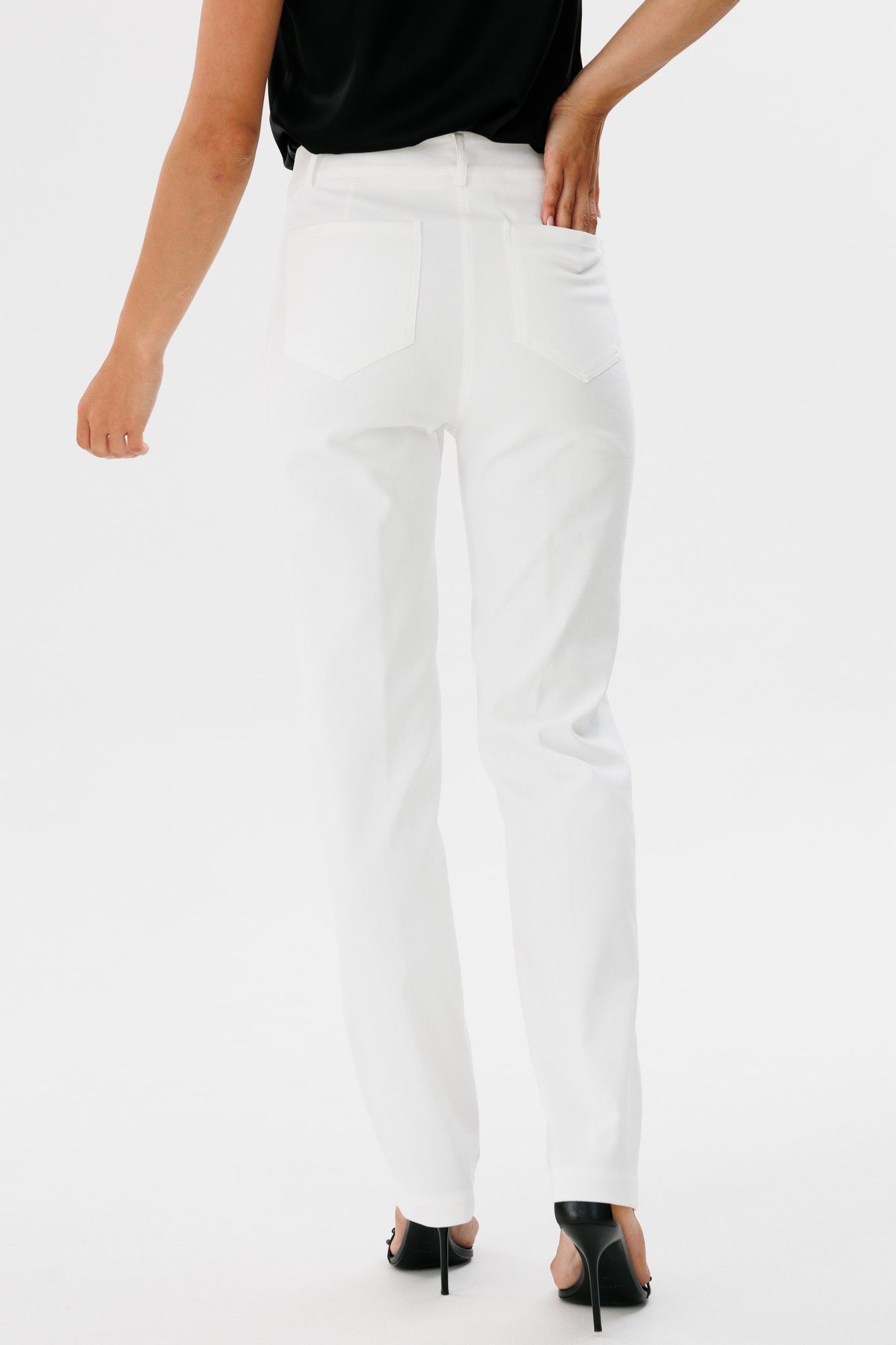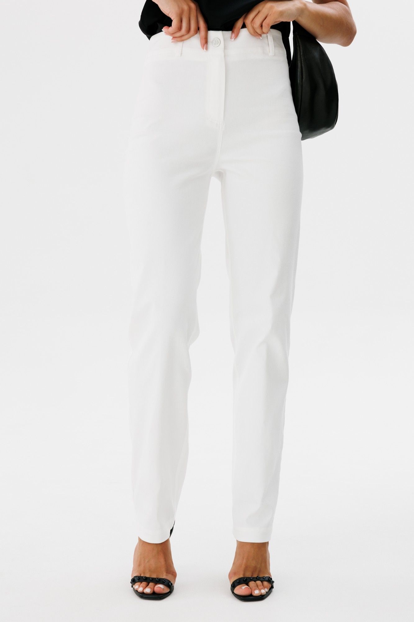 Брюки выполнены из мягкого молочного джинса, прямые, пояс притачной со шлевками, застежка на петлю-пуговицу, по переду гульфик с застежкой на молнию, сзади накладные карманы,посадка высокая. Длина по боковому шву 102 см полуобхват талии в 42-м размере 34 см, полуобхват бедер в 42-м размере 43 см.