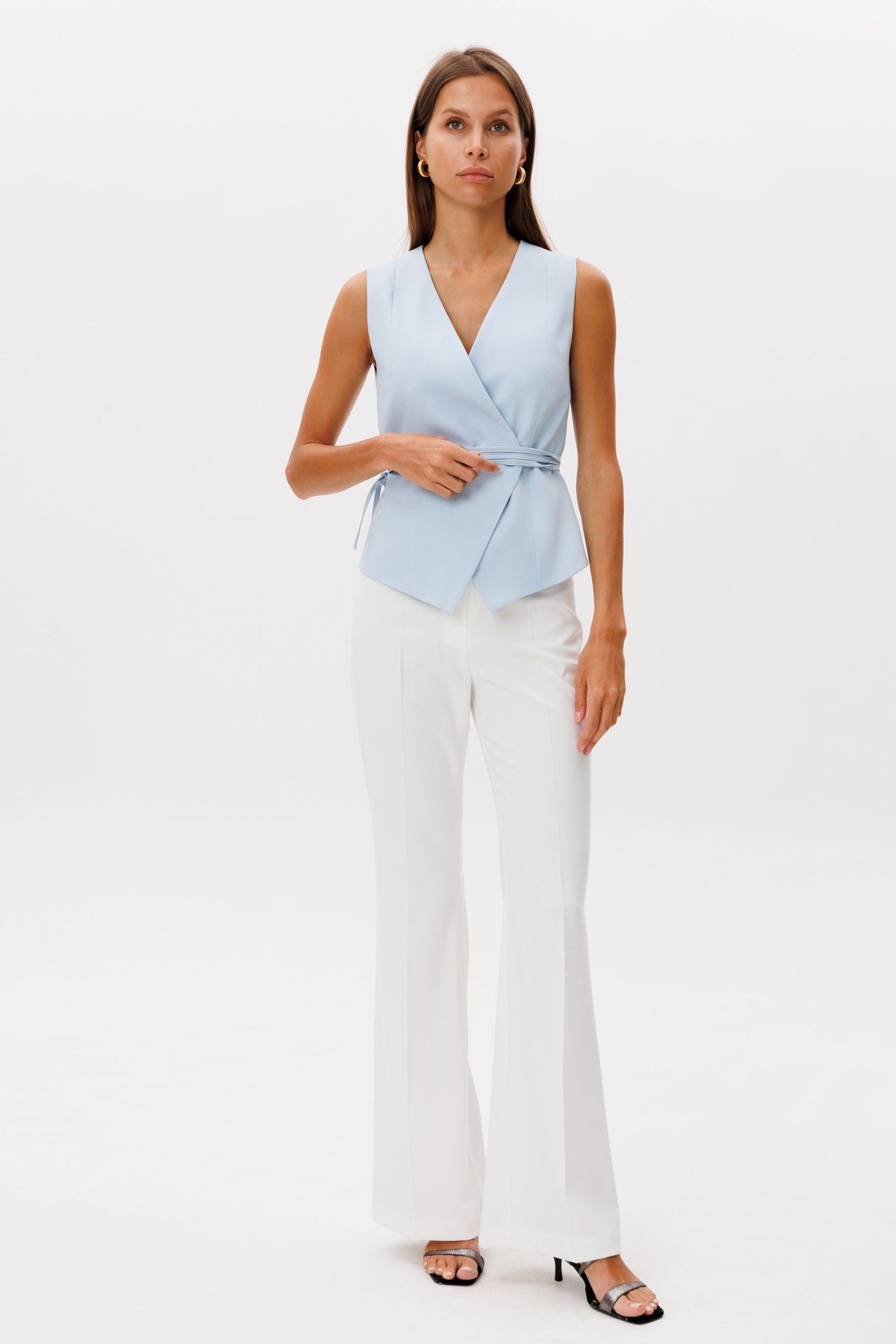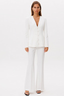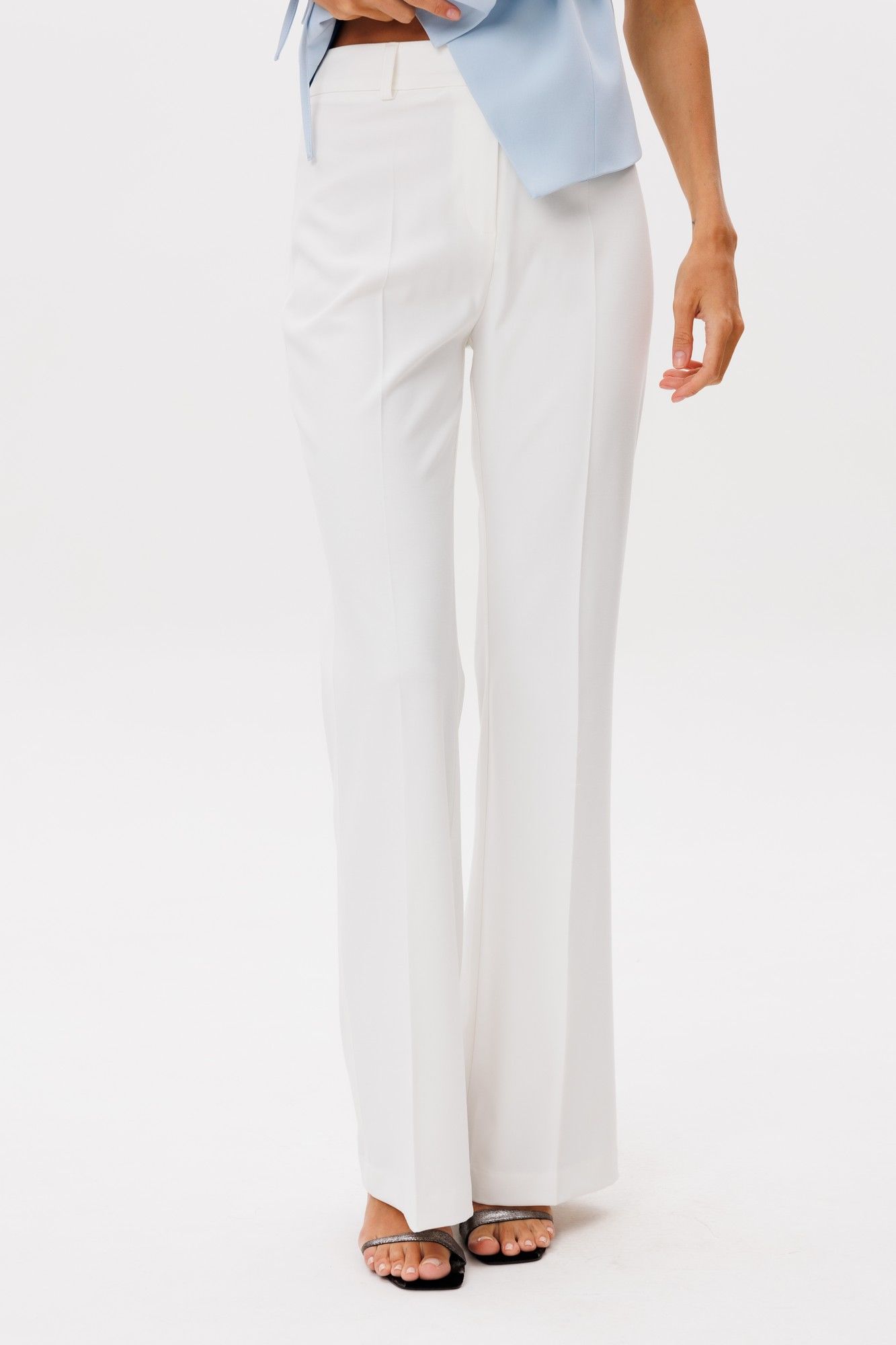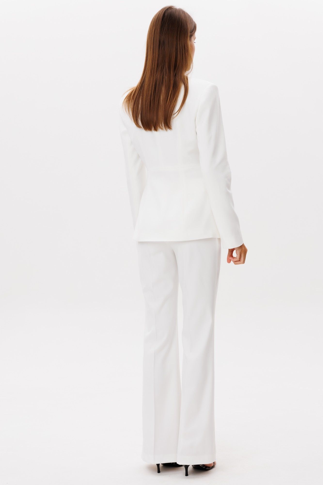 Классические расклешенные брюки полупрелегающегоьсилуэта с высокрй посадкой, пояс притачной со шлевками, застежка на молнию и петлю-пуговицу, брюки без карманов. Выполнены из ткани костюмной группы. Длина по боковому шву 111 см, полуобхват талии 35 см, полуобхват бедер 45 см , высота посадки 30 см в 42-м размере. Брюки можно сочетать с жакетом арт 2382