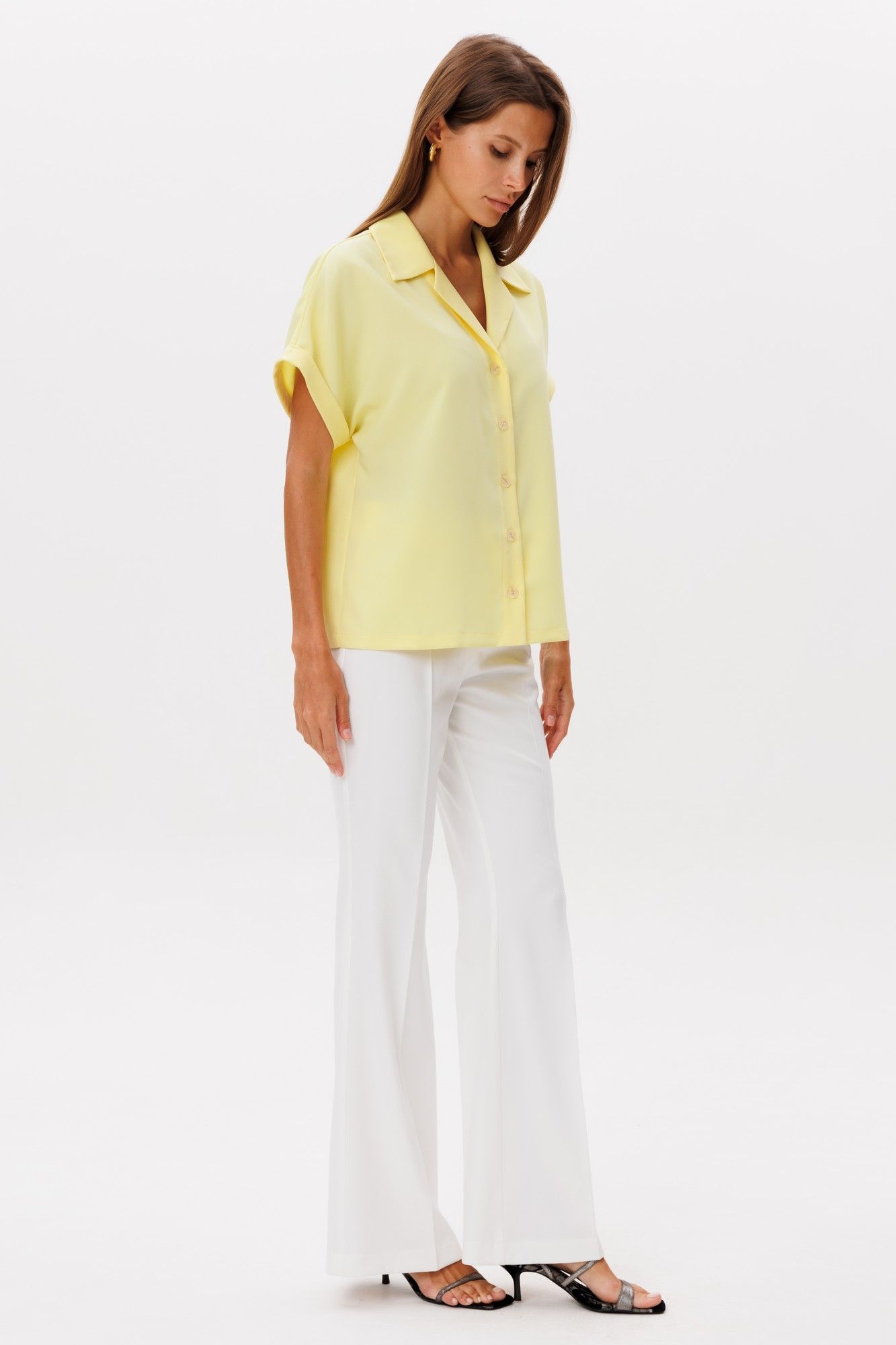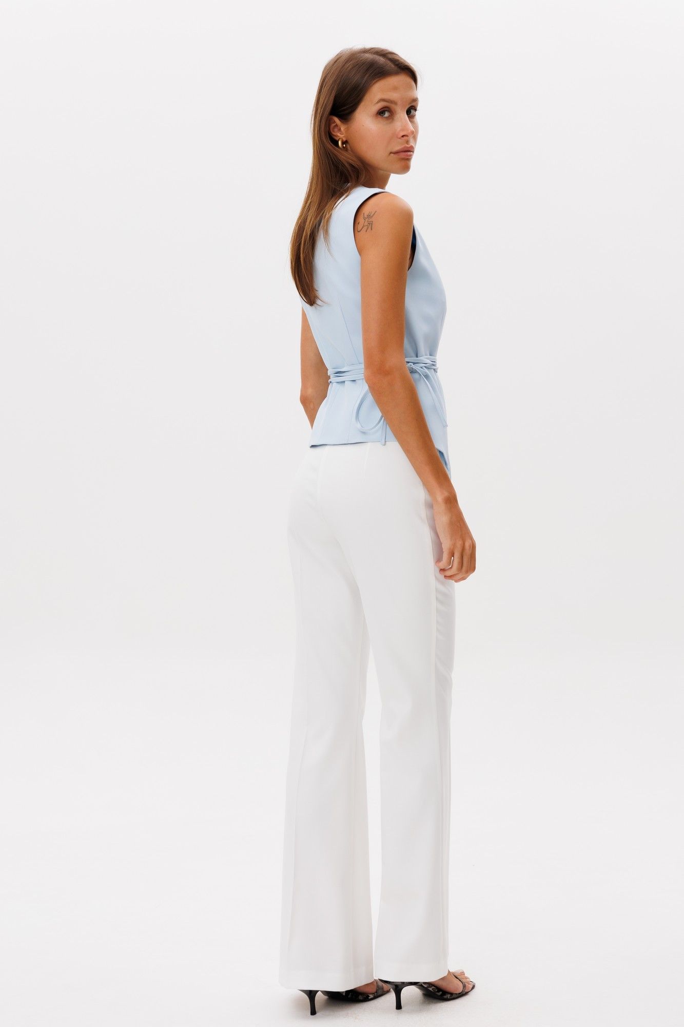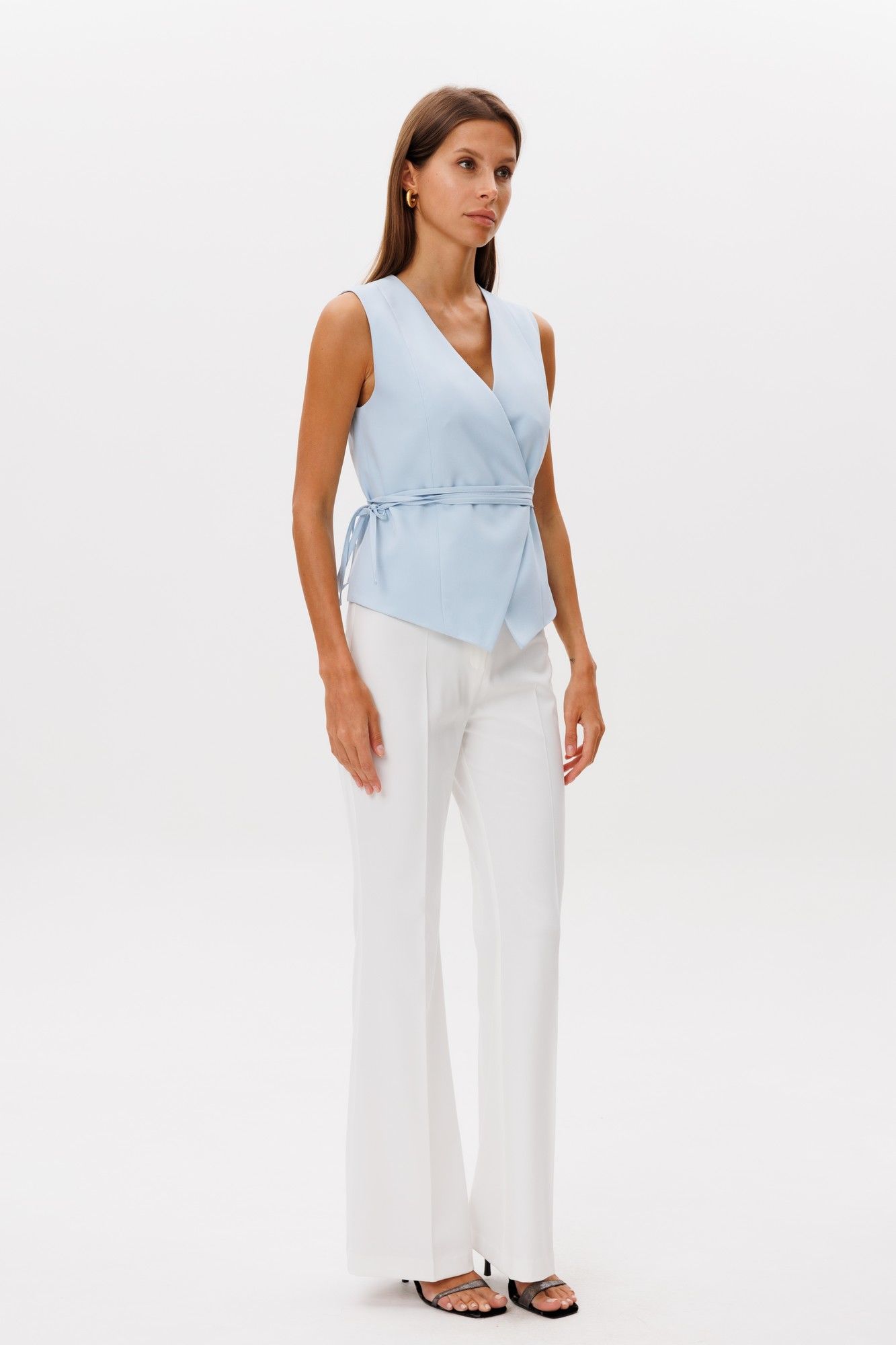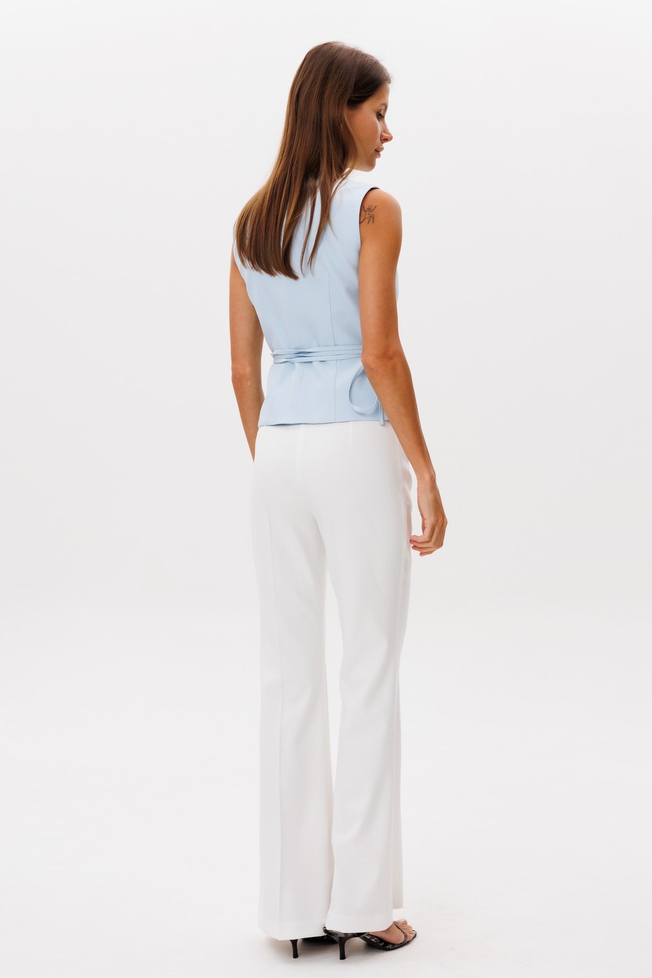 Классические расклешенные брюки полупрелегающегоьсилуэта с высокрй посадкой, пояс притачной со шлевками, застежка на молнию и петлю-пуговицу, брюки без карманов. Выполнены из ткани костюмной группы. Длина по боковому шву 111 см, полуобхват талии 35 см, полуобхват бедер 45 см , высота посадки 30 см в 42-м размере. Брюки можно сочетать с жакетом арт 2382