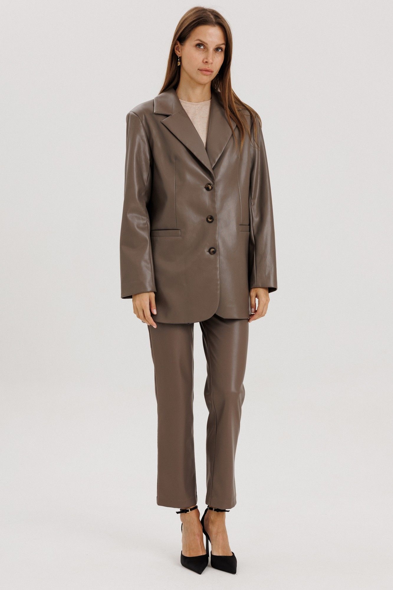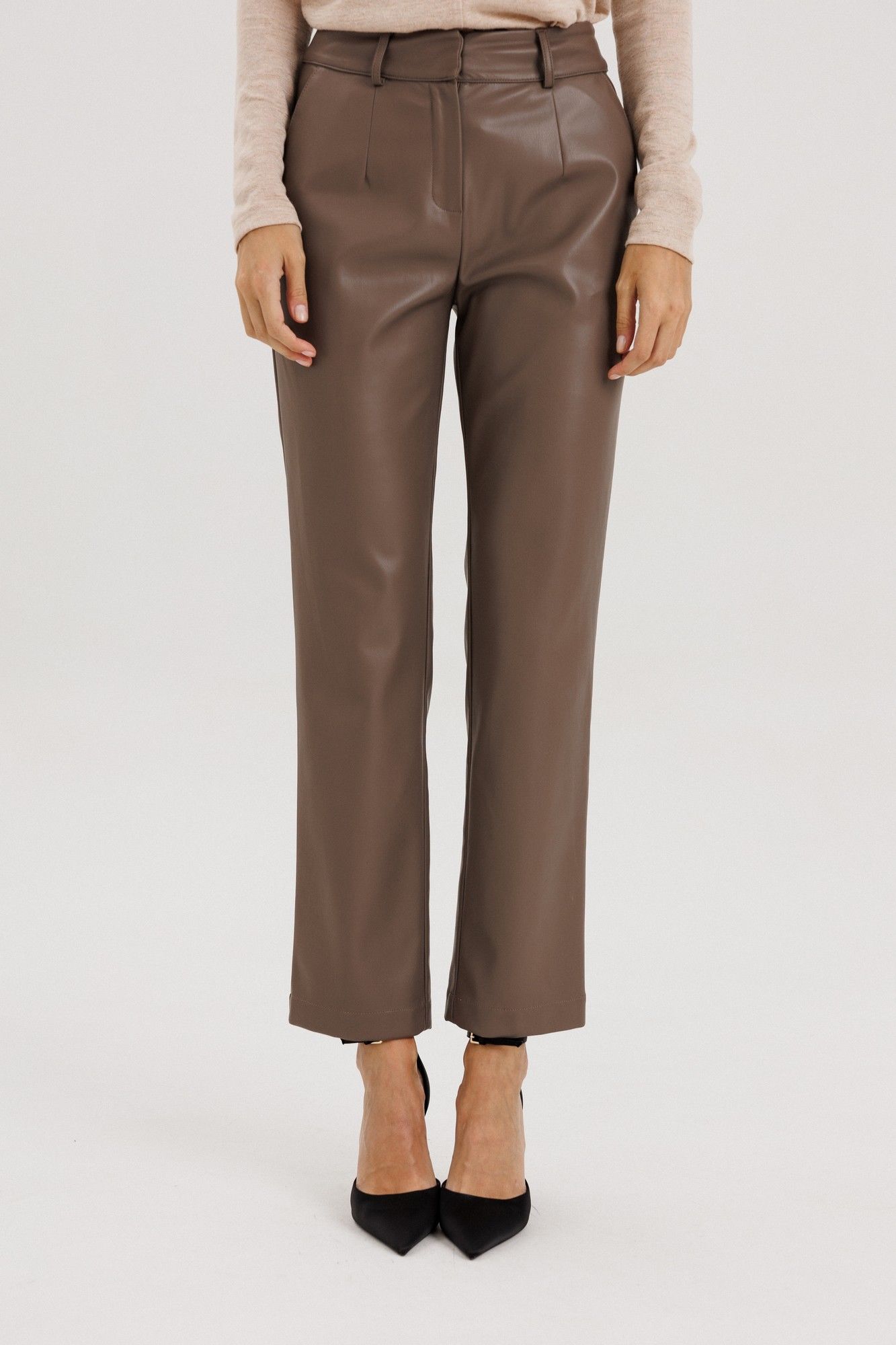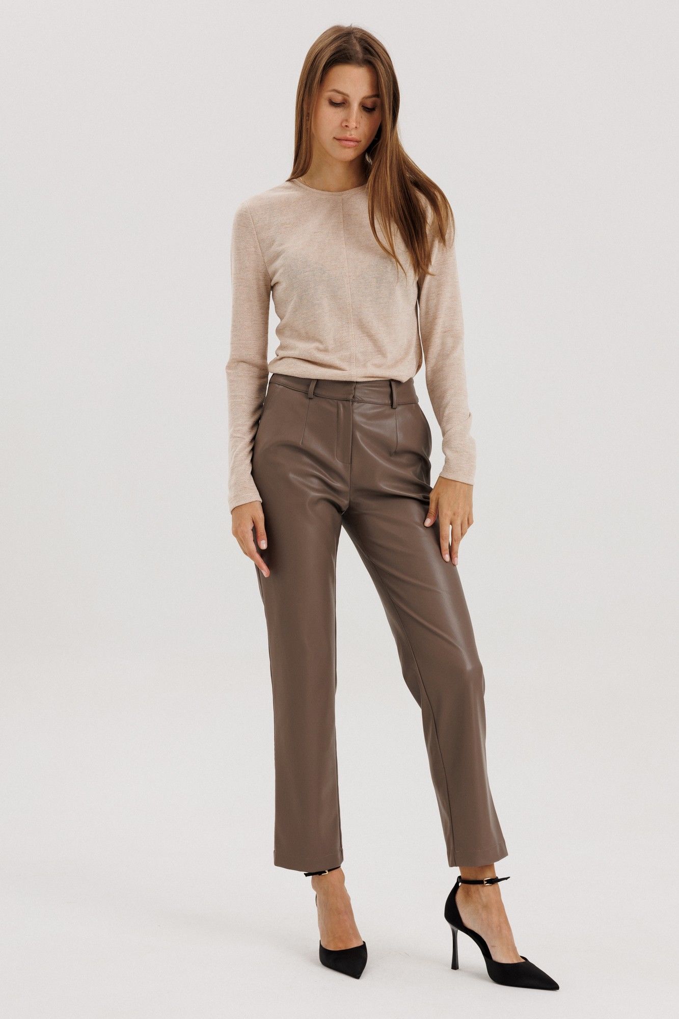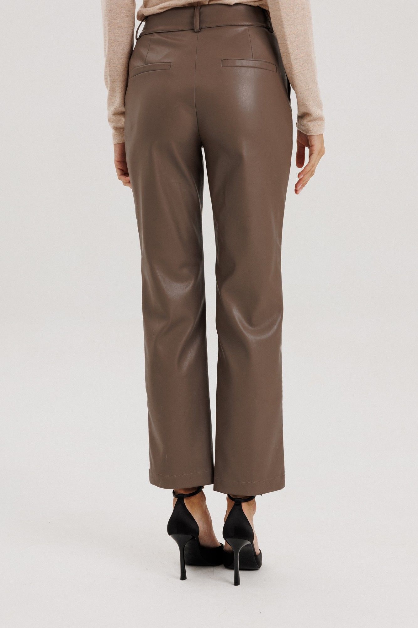 Брюки прямые, пояс притачной со шлевками, застежка на потайной крючок, по переду гульфик с застежкой на молнию, сзади имитация карманов на задних половинках брюк, спереди боковые функциональные карманы, посадка высокая.Классический крой отлично гармонирует с мягкими свитерами и полупрозрачными блузками, выполнены из мягкой экокожи на "замшевой" основе Длина по боковому шву 98 см полуобхват талии в 42-м размере 34 см, полуобхват бедер в 42-м размере 43 см. Рост модели на фото 178 см.
