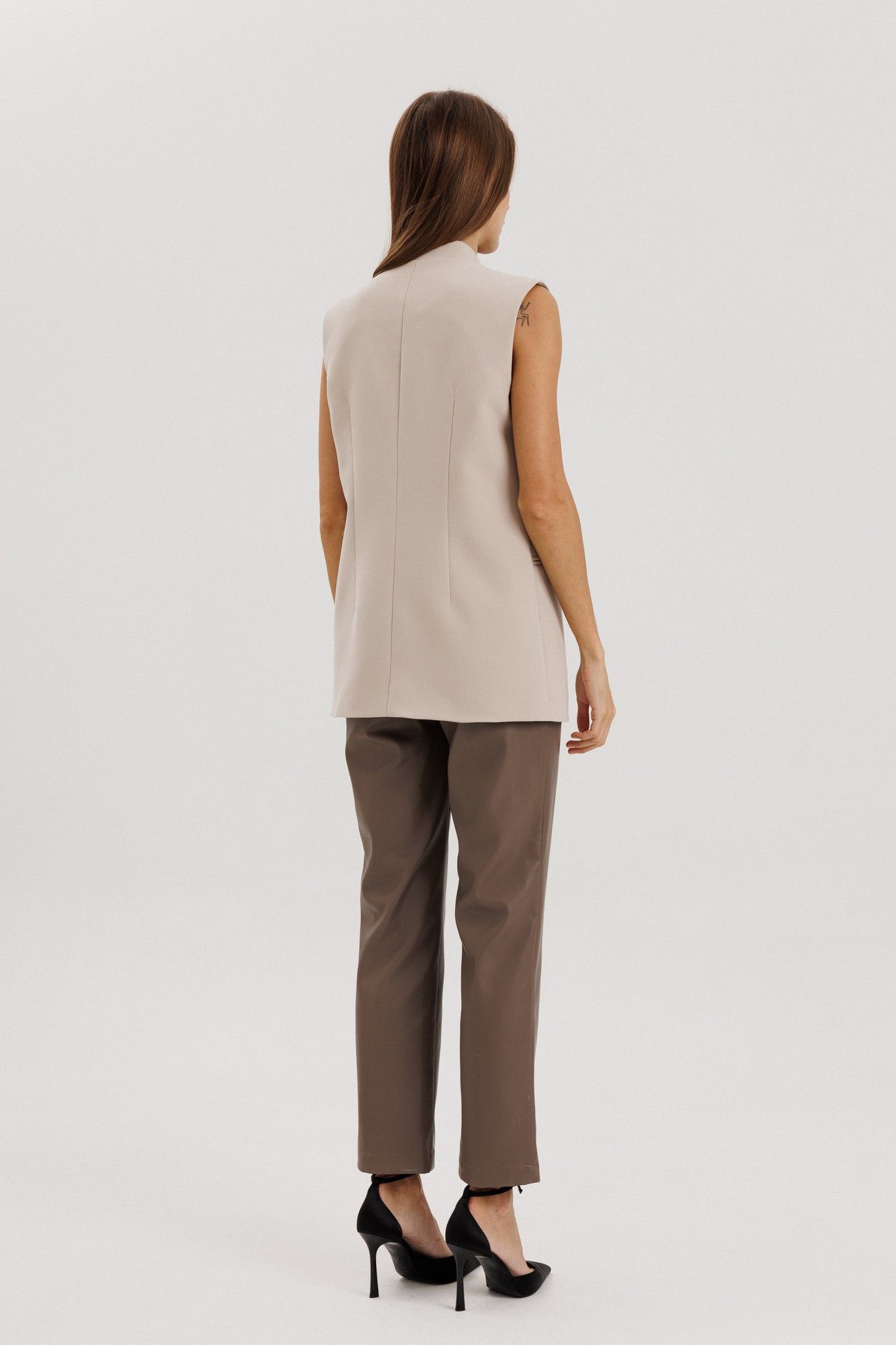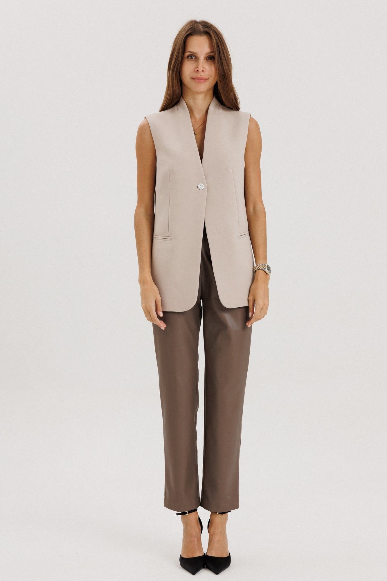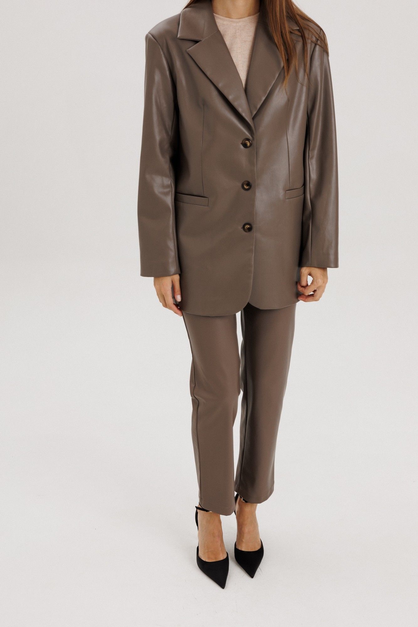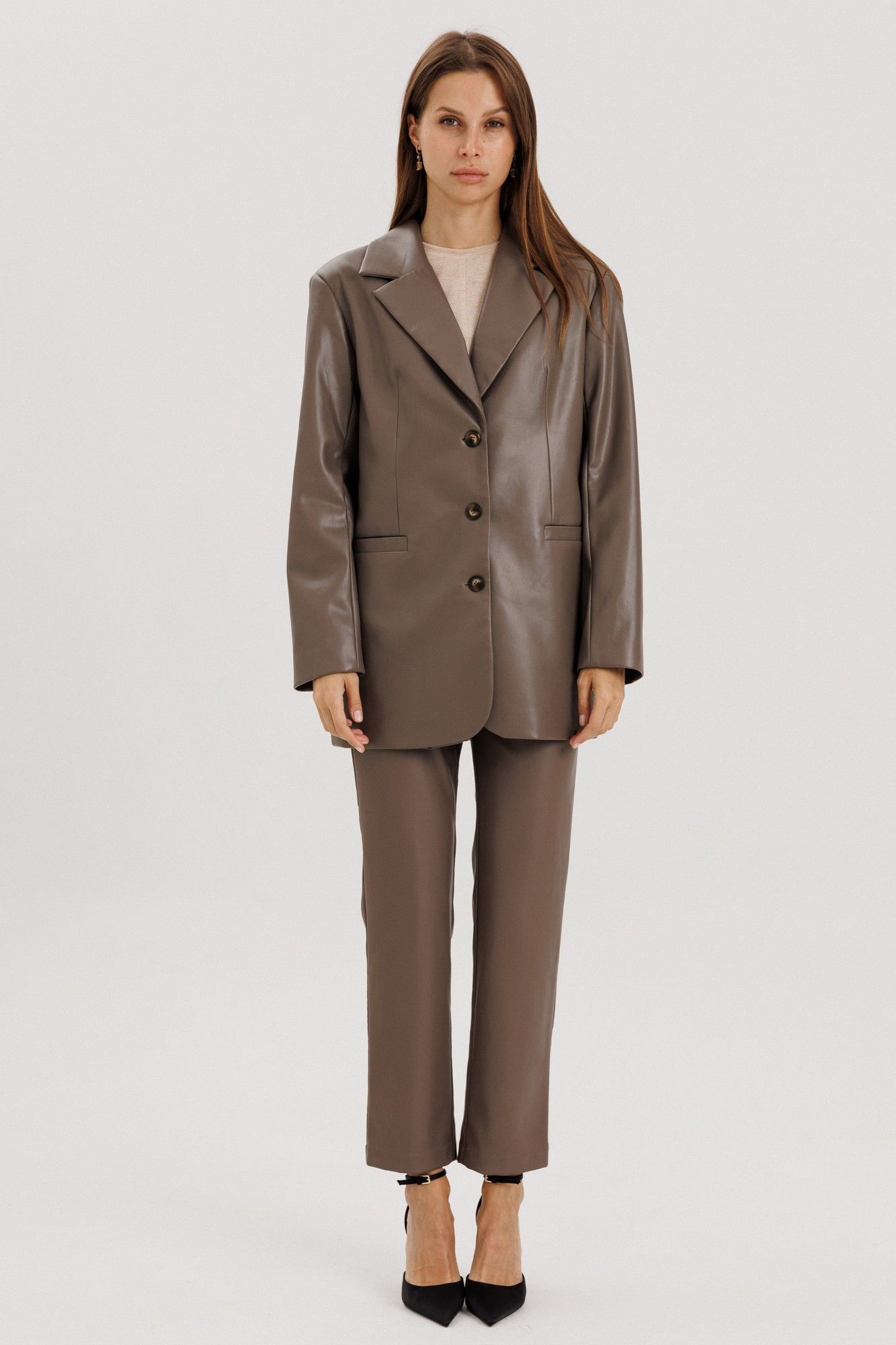 Брюки прямые, пояс притачной со шлевками, застежка на потайной крючок, по переду гульфик с застежкой на молнию, сзади имитация карманов на задних половинках брюк, спереди боковые функциональные карманы, посадка высокая.Классический крой отлично гармонирует с мягкими свитерами и полупрозрачными блузками, выполнены из мягкой экокожи на "замшевой" основе Длина по боковому шву 98 см полуобхват талии в 42-м размере 34 см, полуобхват бедер в 42-м размере 43 см. Рост модели на фото 178 см.