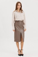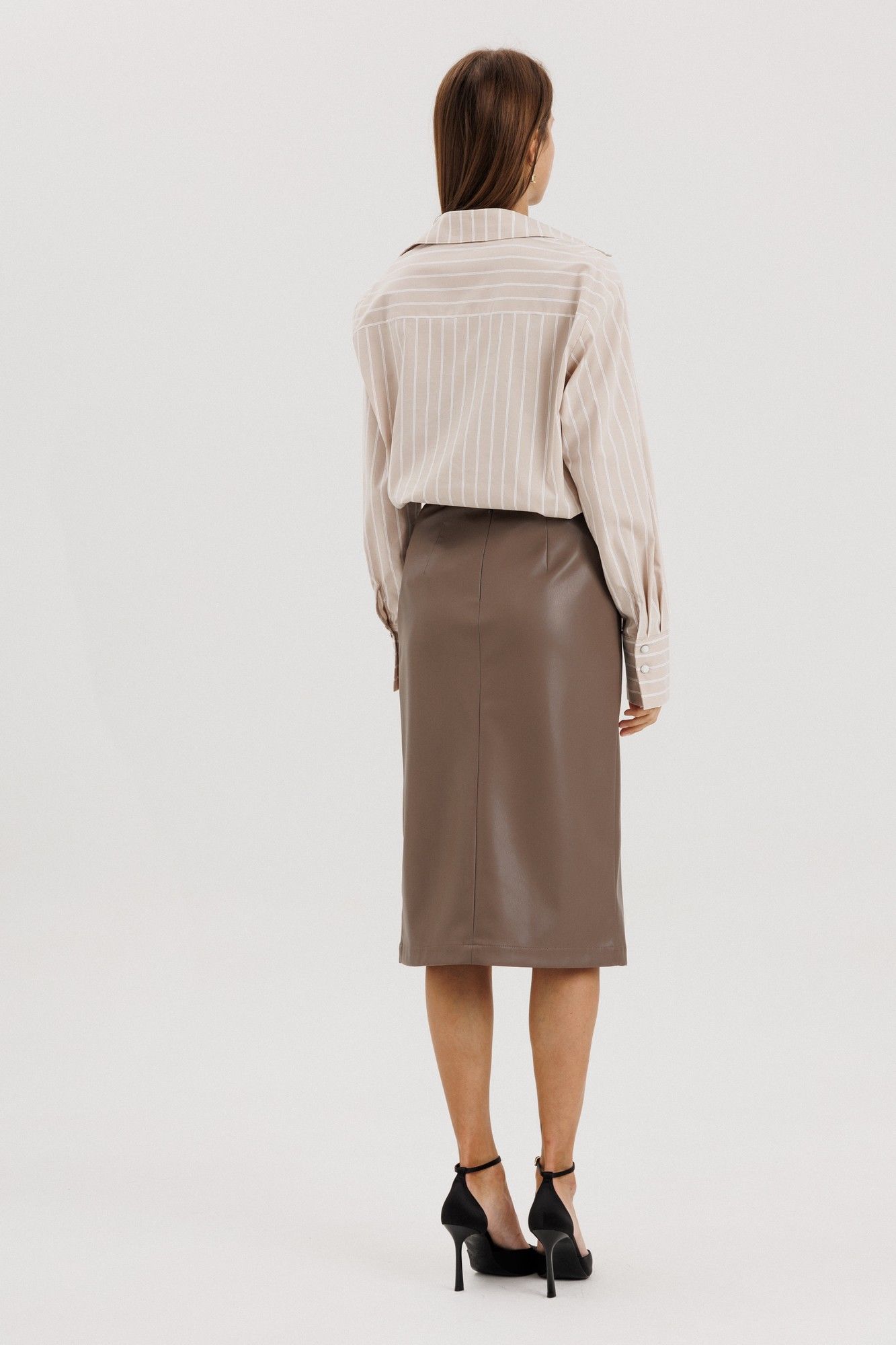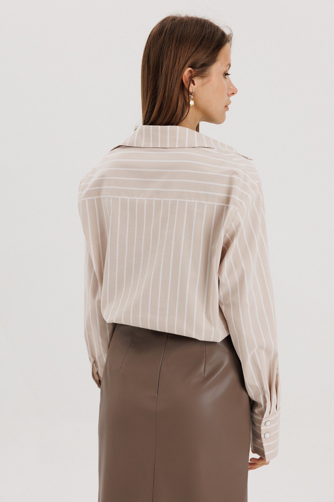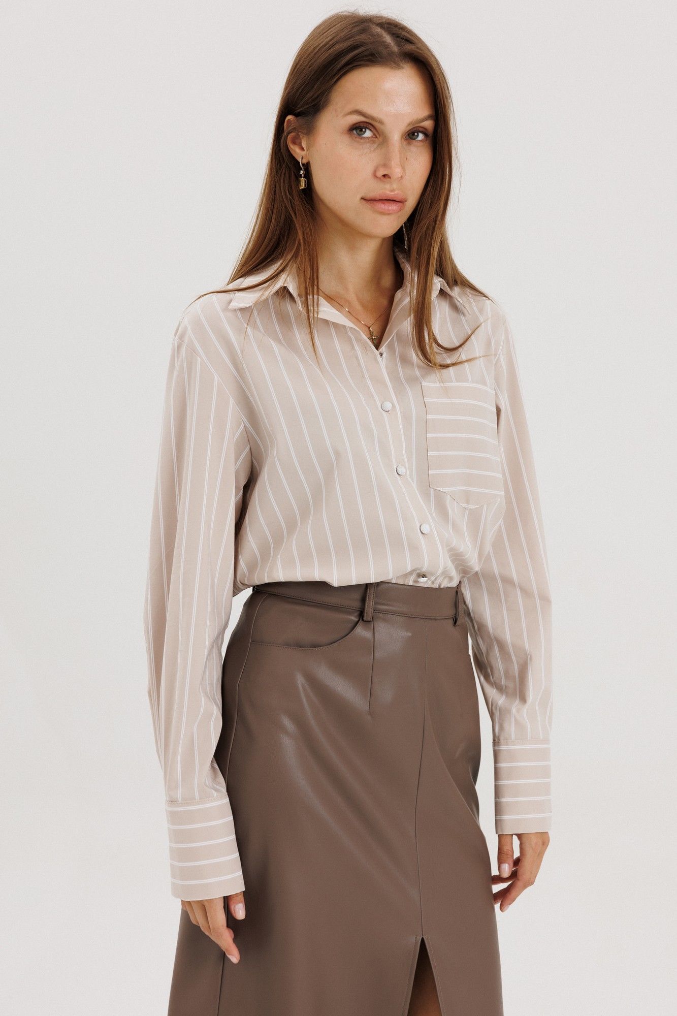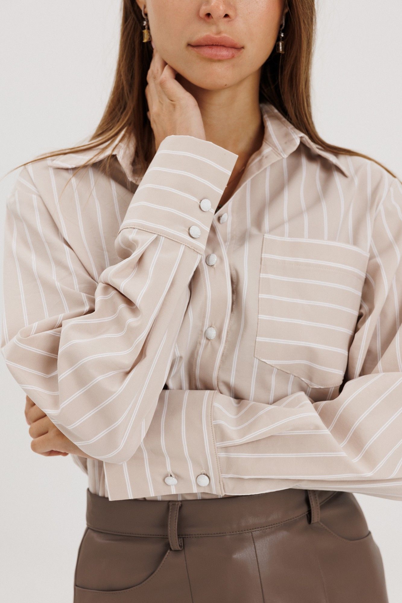 Классическая рубашка в волоску , V-образным вырезом и длинными рукавами, линия плеча немного спущена, рукав притачной. Застёжка центральная на петли - пуговицы. Низ блузки фигурной формы. Блузка выполнена из рубашечной ткани бежевого цвета в полоску белого цвета, по переду нагрудный накладной карман. Акцентная деталь -- серебряные пуговицы. По спинке отрезная кокетка, на манжете застежка на две петли-пуговицы. За счет эластана ткань немного тянется. Длина по спинке 71см, длина рукава от линии шва 60 см, высота манжеты 11 см. Рост модели на фото 178 см.
