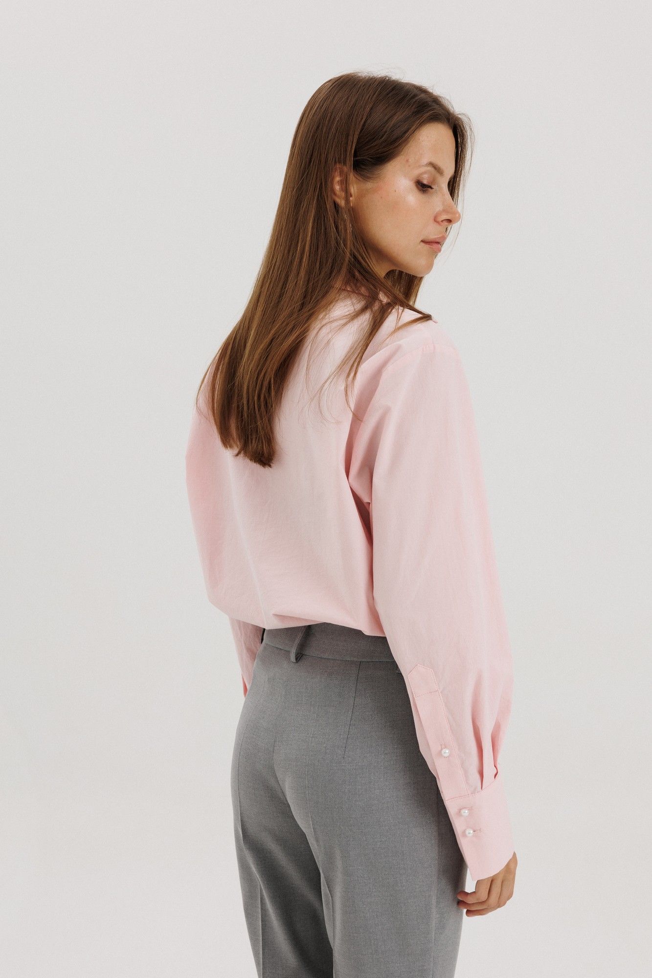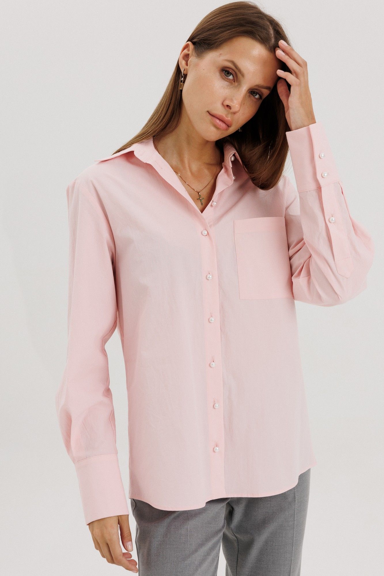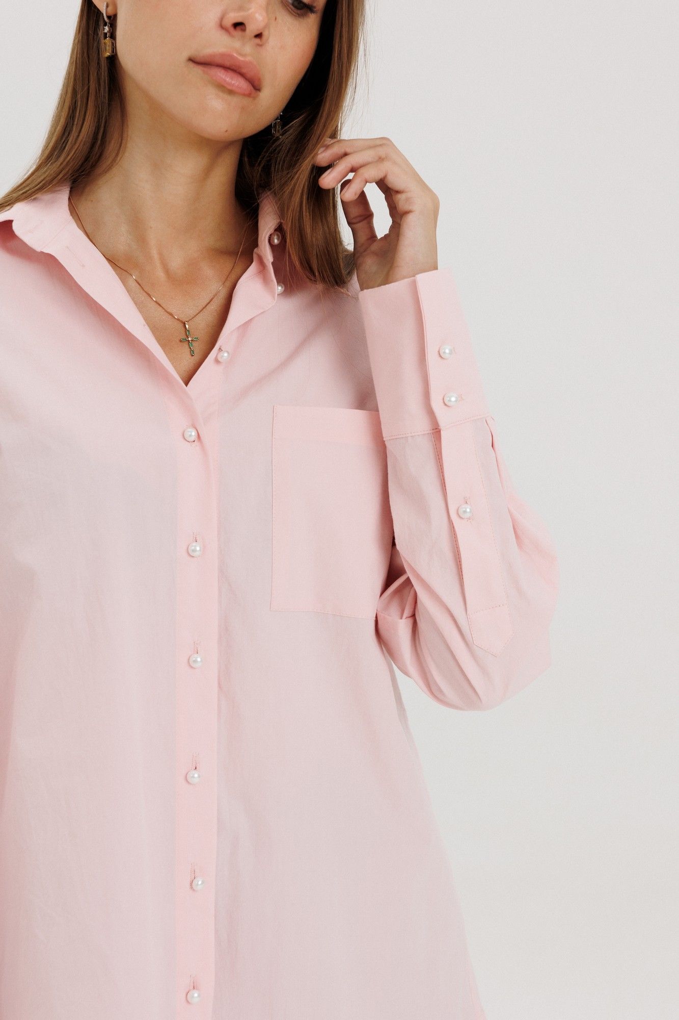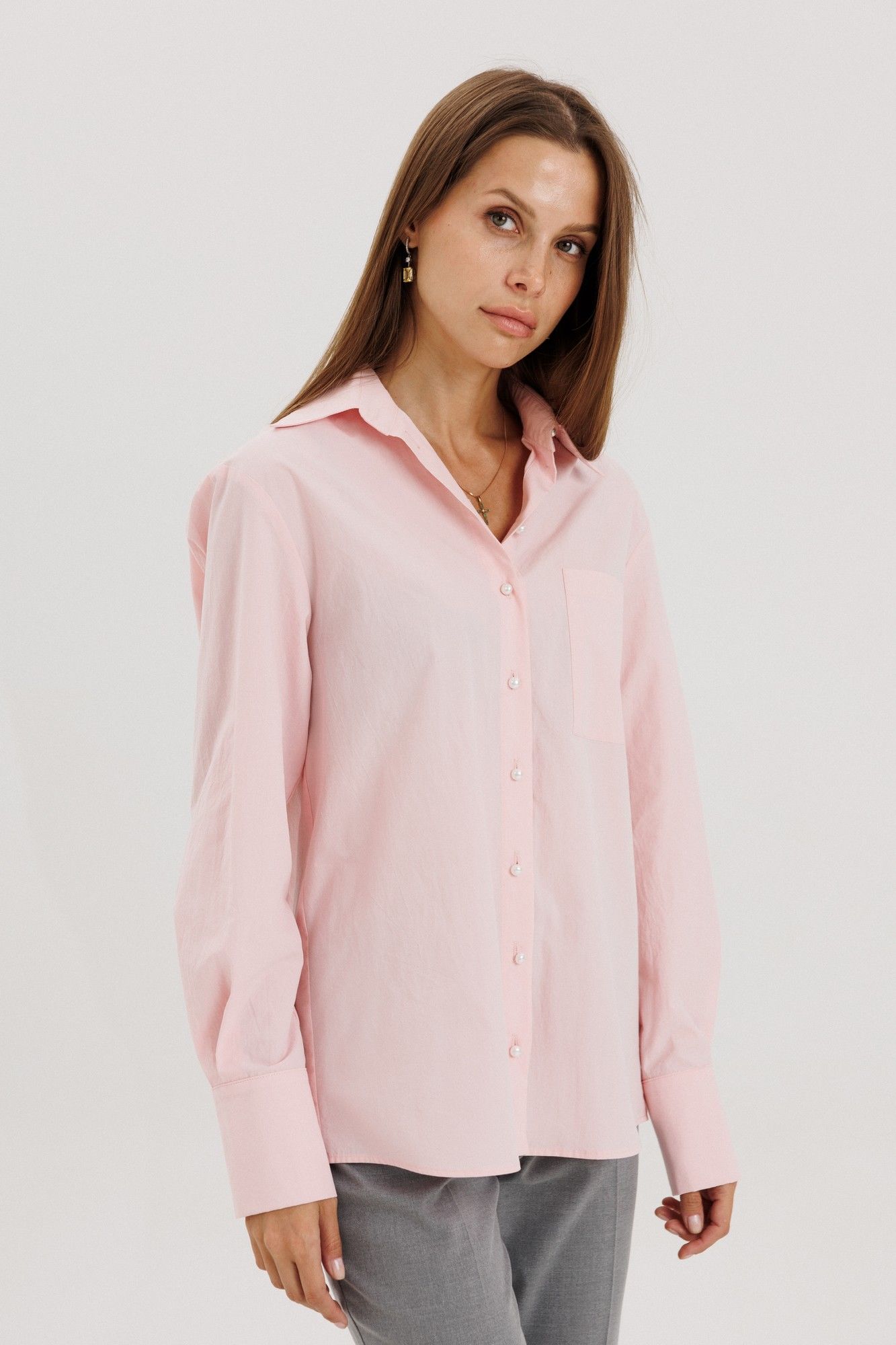 Классическая рубашка пудрового розового цвета , V-образным вырезом и длинными рукавами, линия плеча немного спущена, рукав притачной,по переду нагрудный накладной карман квадратной формы Застёжка центральная на петли - пуговицы. Низ блузки фигурной формы. Блузка выполнена из рубашечной ткани - жатка с легким эффектом мятости. Акцентная деталь -- жемчужные пуговицы. на манжете застежка на три петли-пуговицы. Длина по спинке 71см, длина рукава от линии шва 60 см, высота манжеты 11 см. Рост модели на фото 178 см.