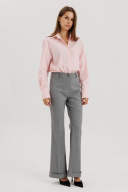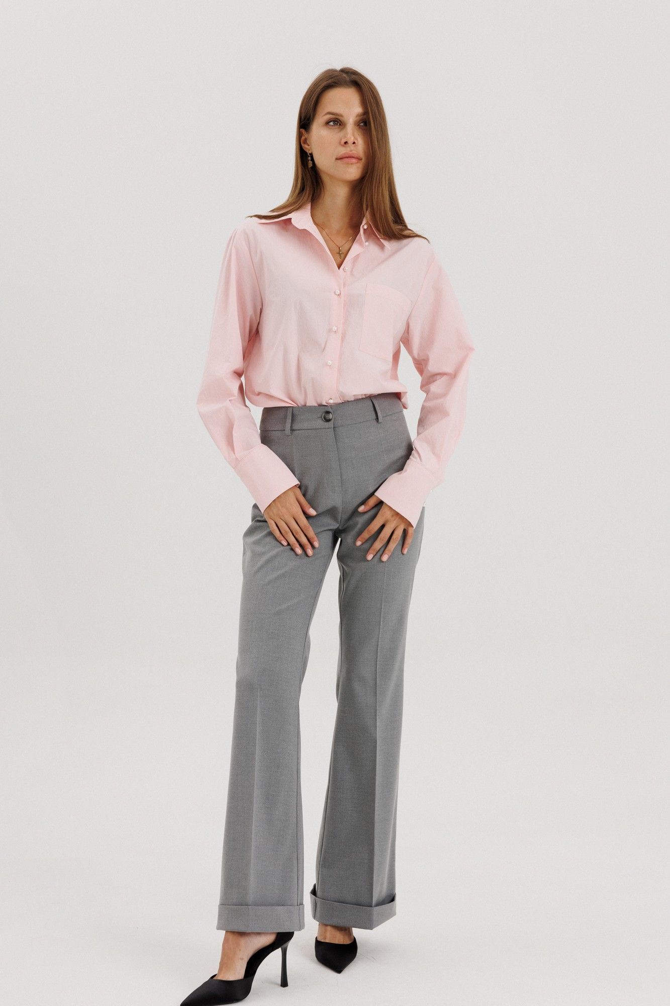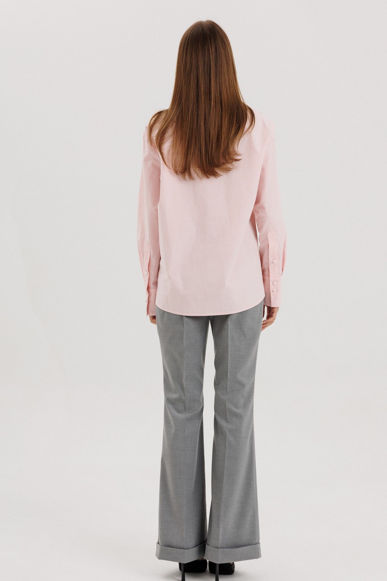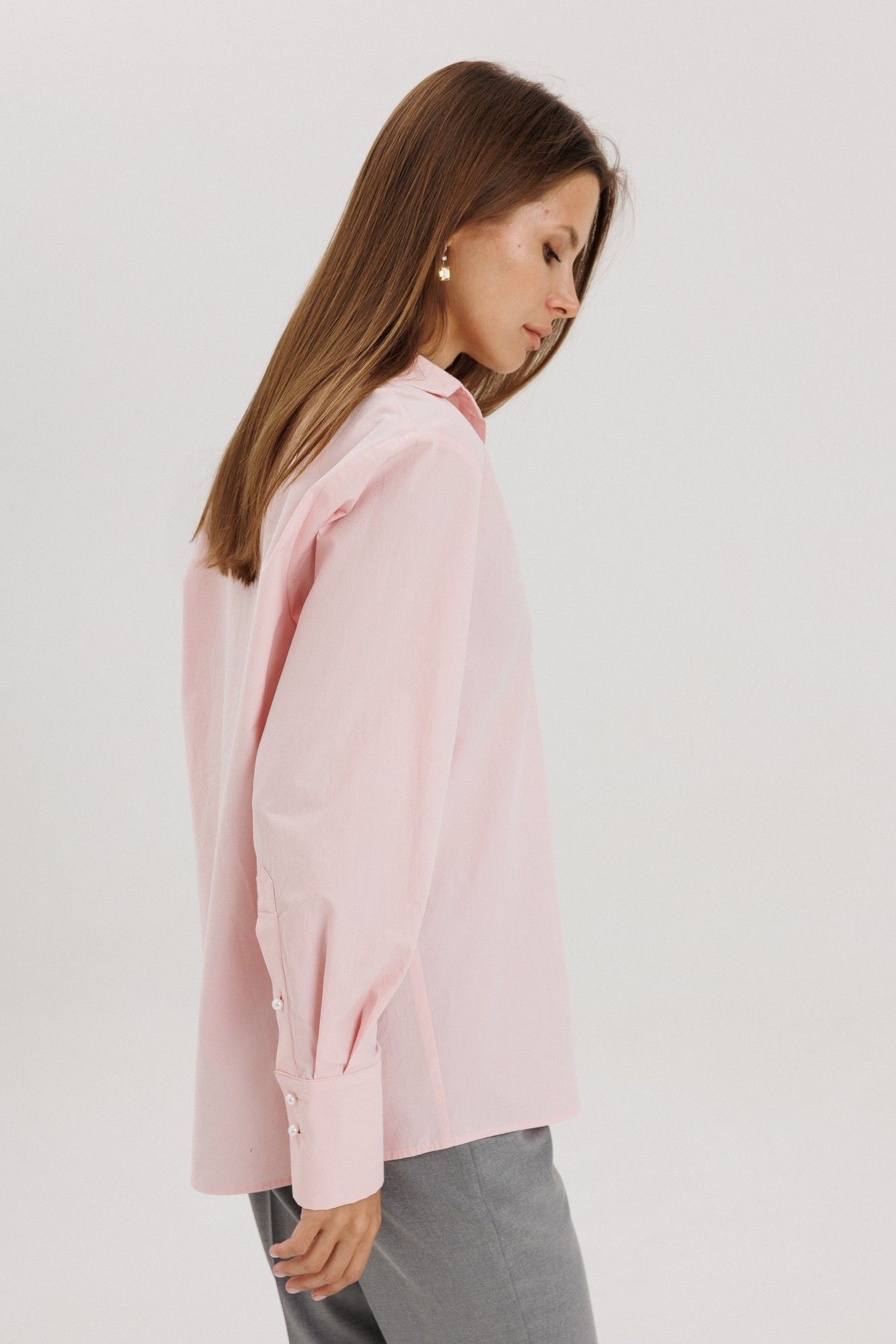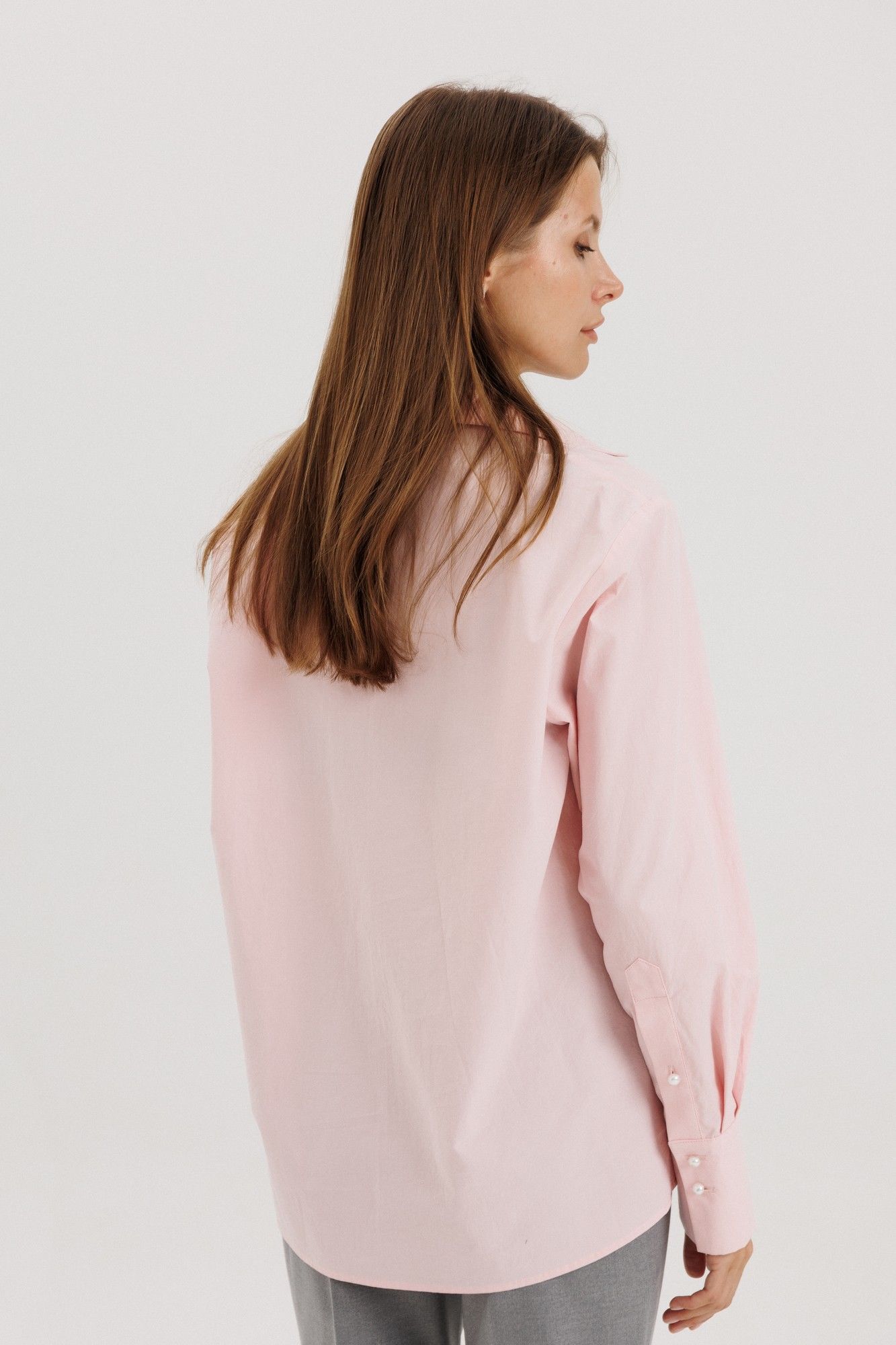 Классическая рубашка пудрового розового цвета , V-образным вырезом и длинными рукавами, линия плеча немного спущена, рукав притачной,по переду нагрудный накладной карман квадратной формы Застёжка центральная на петли - пуговицы. Низ блузки фигурной формы. Блузка выполнена из рубашечной ткани - жатка с легким эффектом мятости. Акцентная деталь -- жемчужные пуговицы. на манжете застежка на три петли-пуговицы. Длина по спинке 71см, длина рукава от линии шва 60 см, высота манжеты 11 см. Рост модели на фото 178 см.