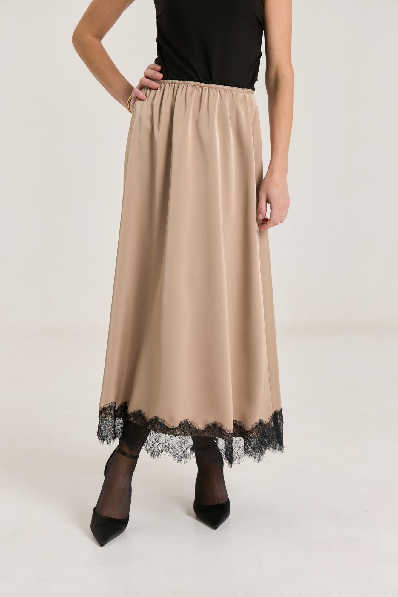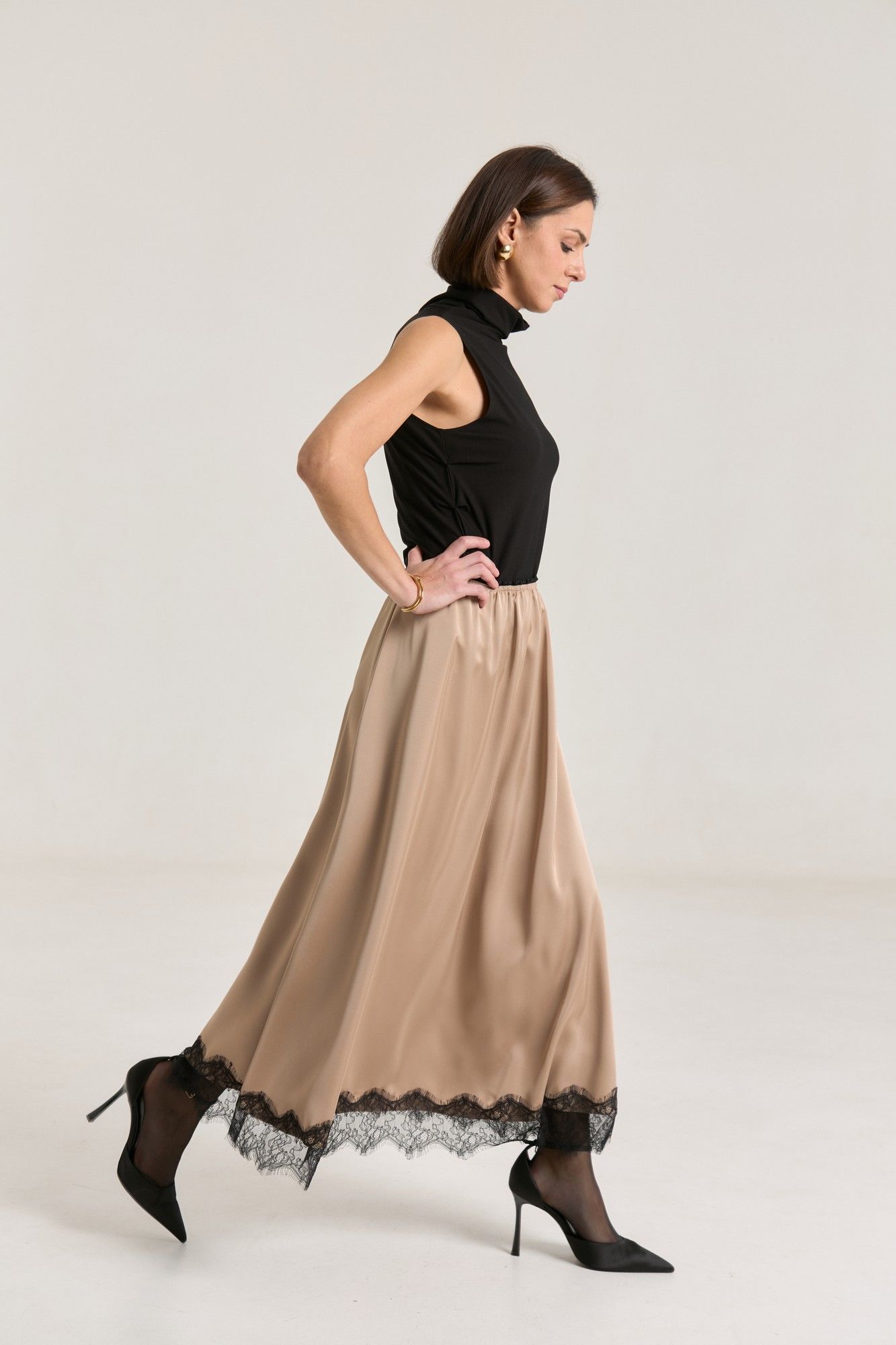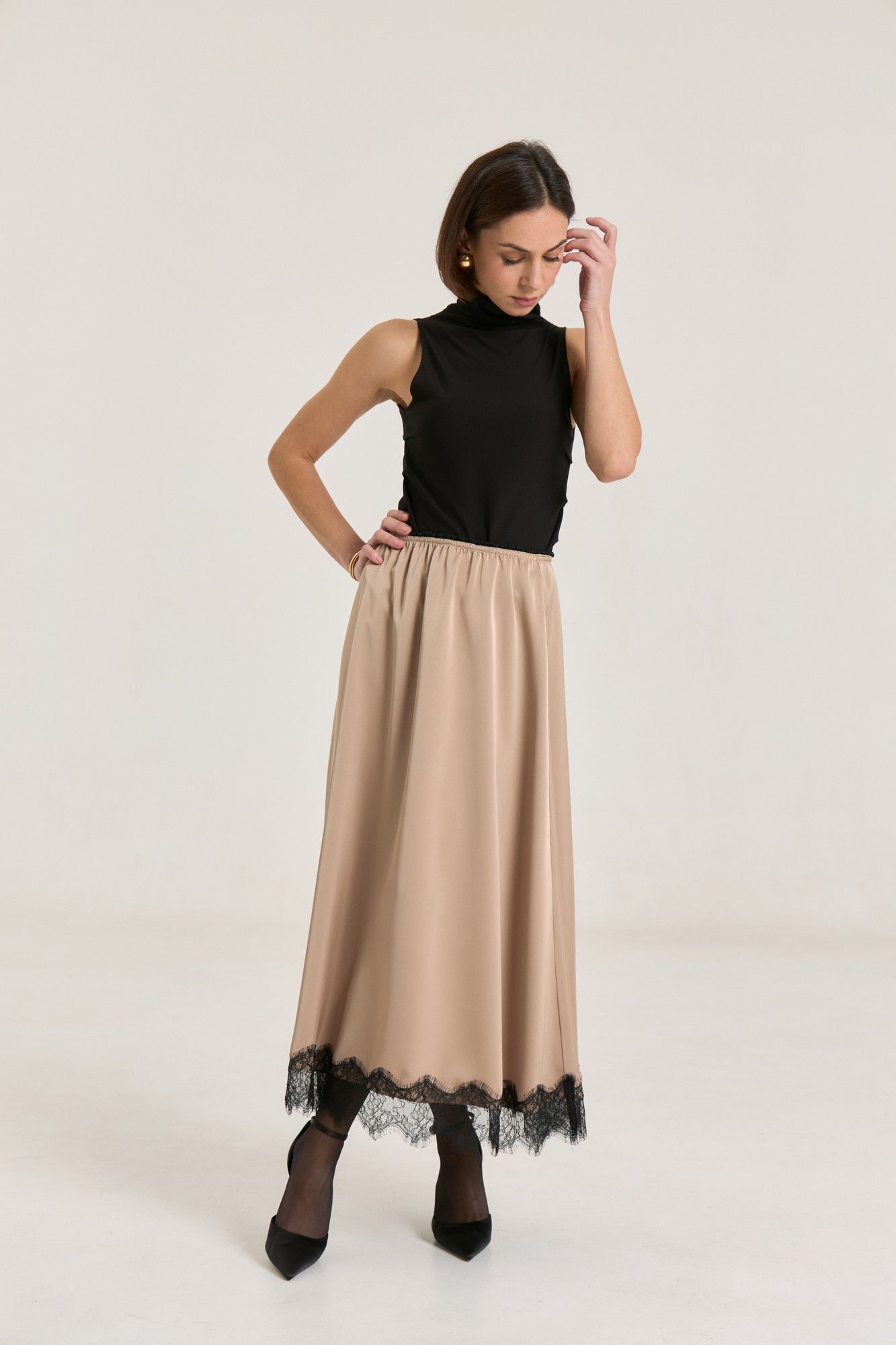 Юбка А-силуэта, на резинке, сверху отстроченая декоративной тесьмой по поясу, по низу- французким коужевом. Выполнена из плотной атласной ткани. Юбка без подкладки. Длина юбки вместе с кружевом 89 см , по талии 30 см в 42-м размере. Рост модели на фото 168 см.