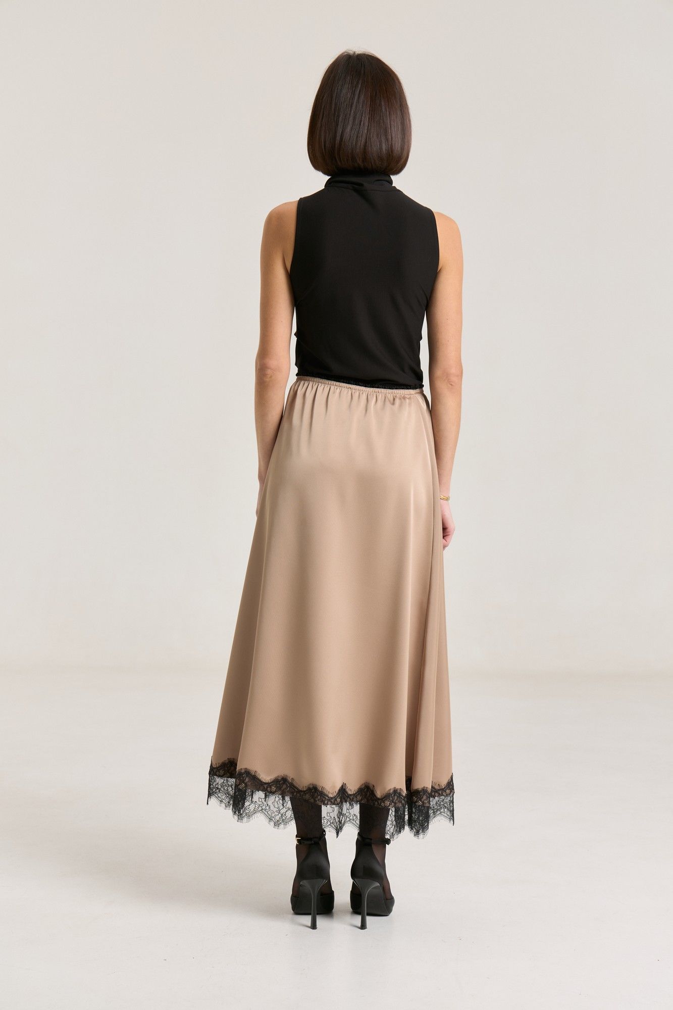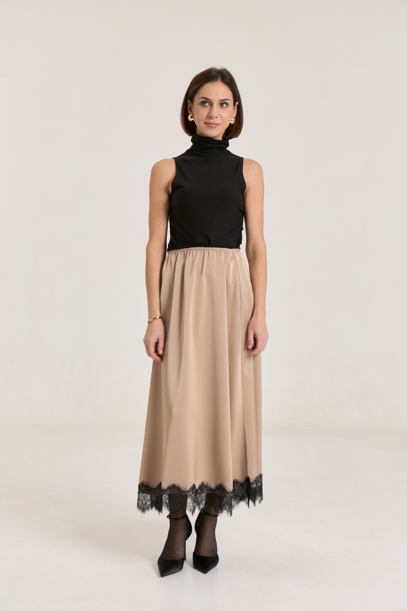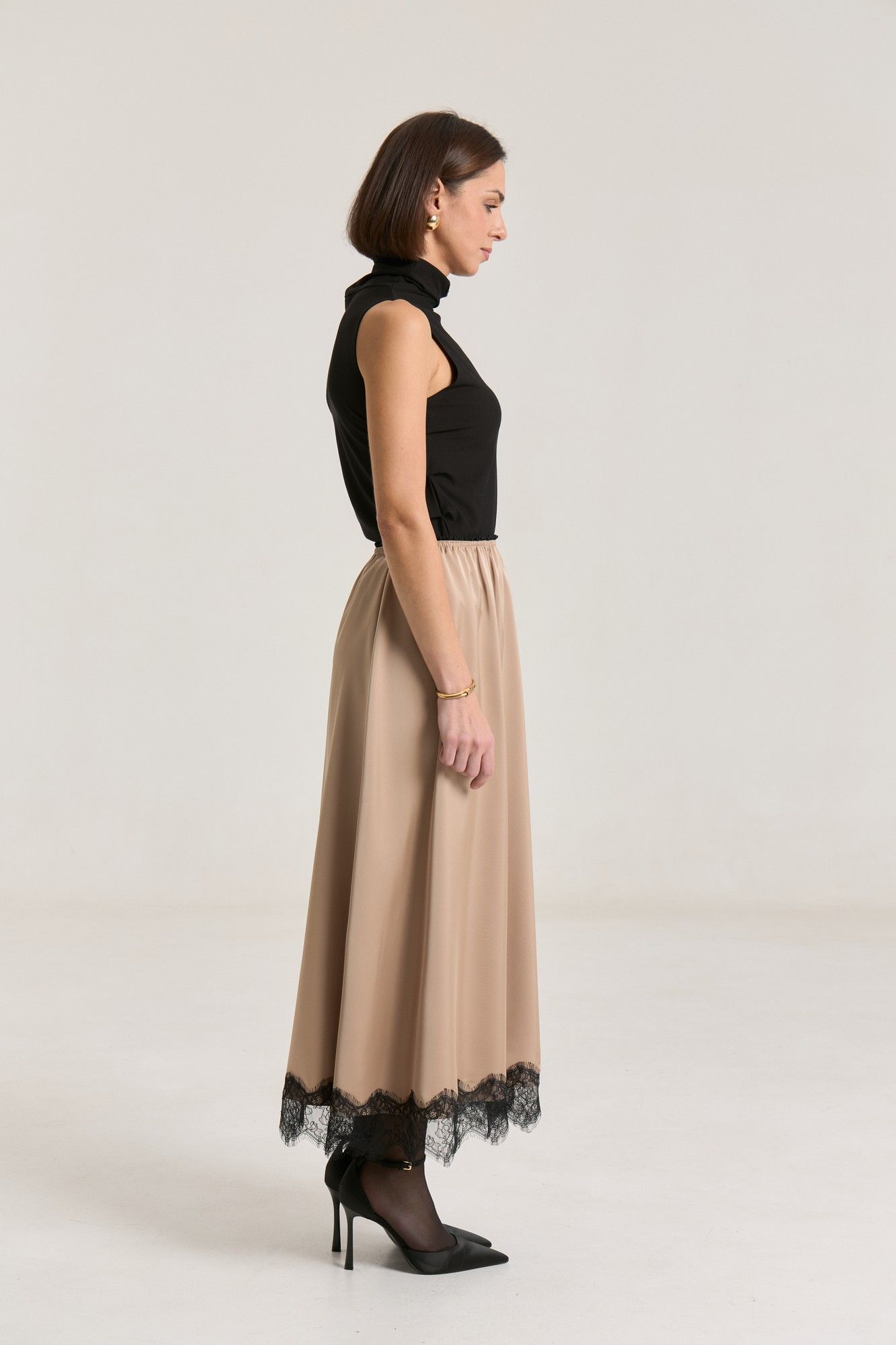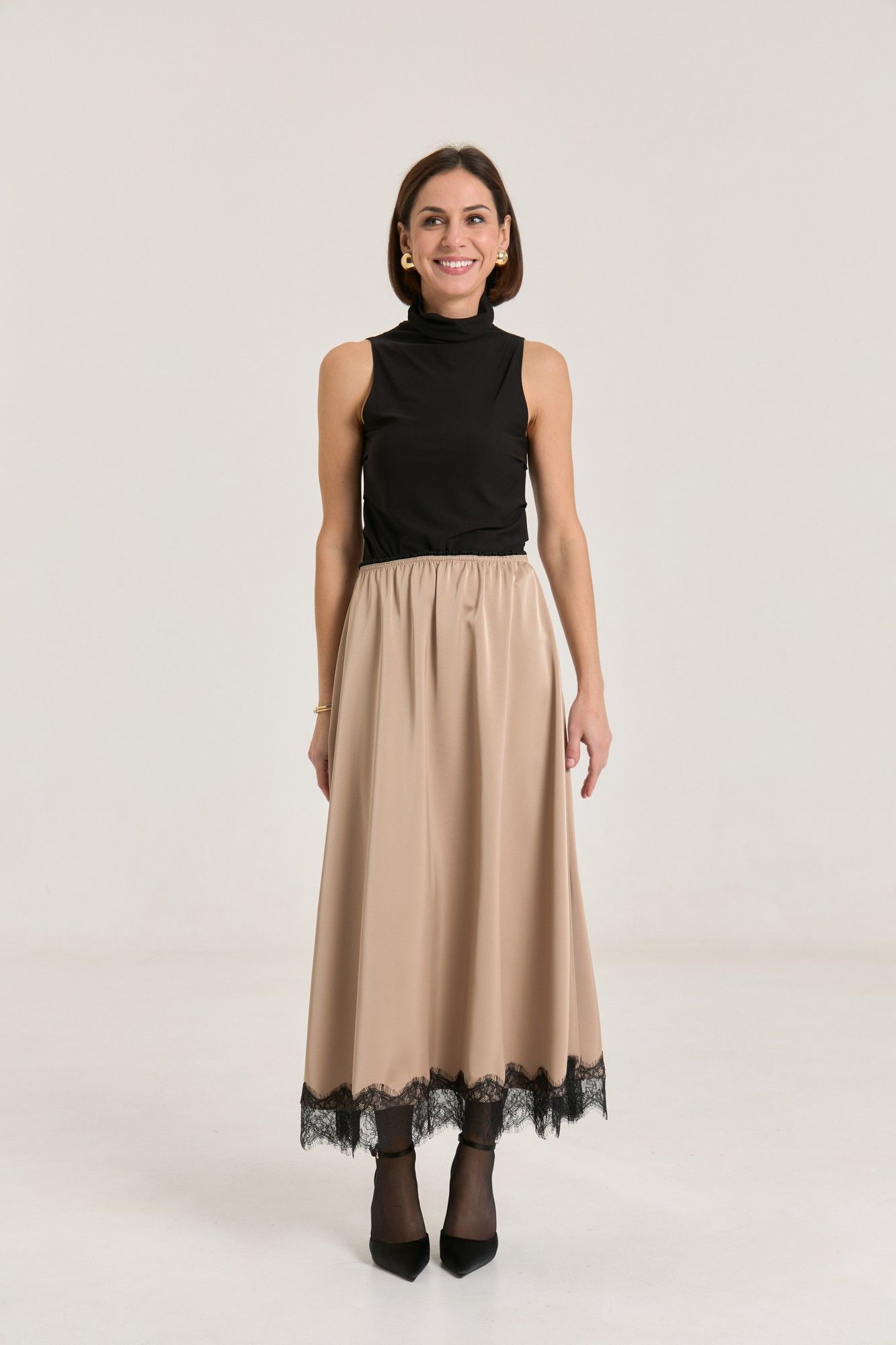Юбка А-силуэта, на резинке, сверху отстроченая декоративной тесьмой по поясу, по низу- французким коужевом. Выполнена из плотной атласной ткани. Юбка без подкладки. Длина юбки вместе с кружевом 89 см , по талии 30 см в 42-м размере. Рост модели на фото 168 см.