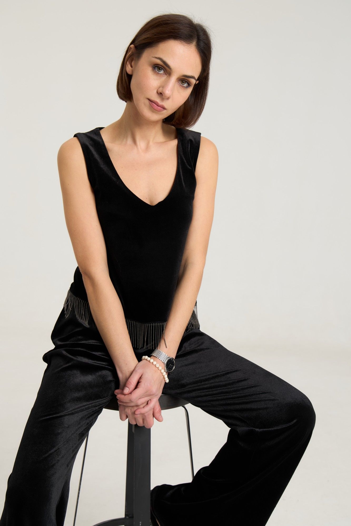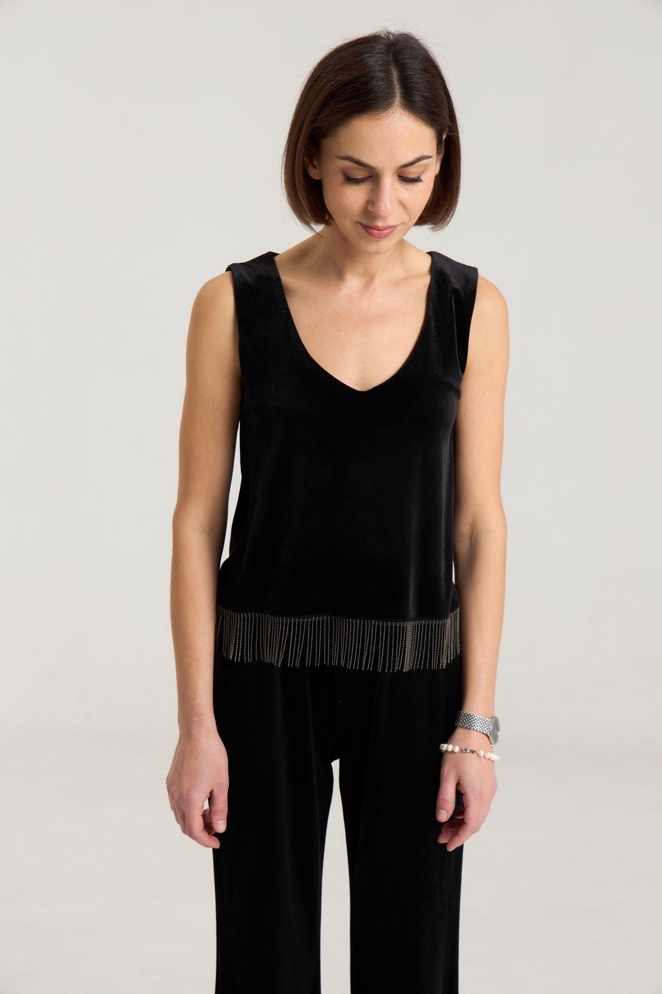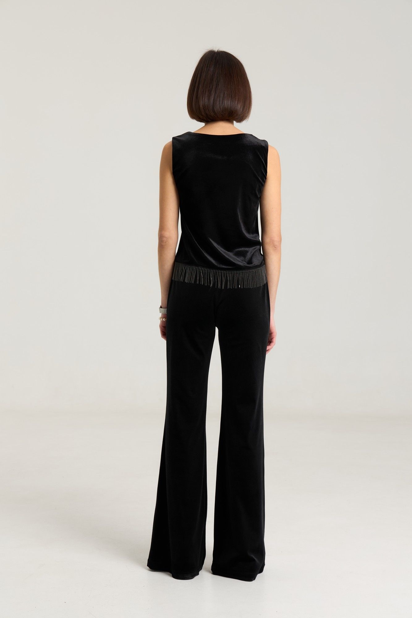 Топ свободного кроя выполнен из велюровой ткани черного цвета, на обтачке по переду и спинке, с углубленным вырезом. Длина по спинке 48 см, 6 см длина декора, полуобхват груди 43 см в 42-м размере. Топ красиво и лаконично смотрится с любым низом, за счет декора образ зрительно притягивает внимание. Рост модели на фото 168 см.