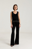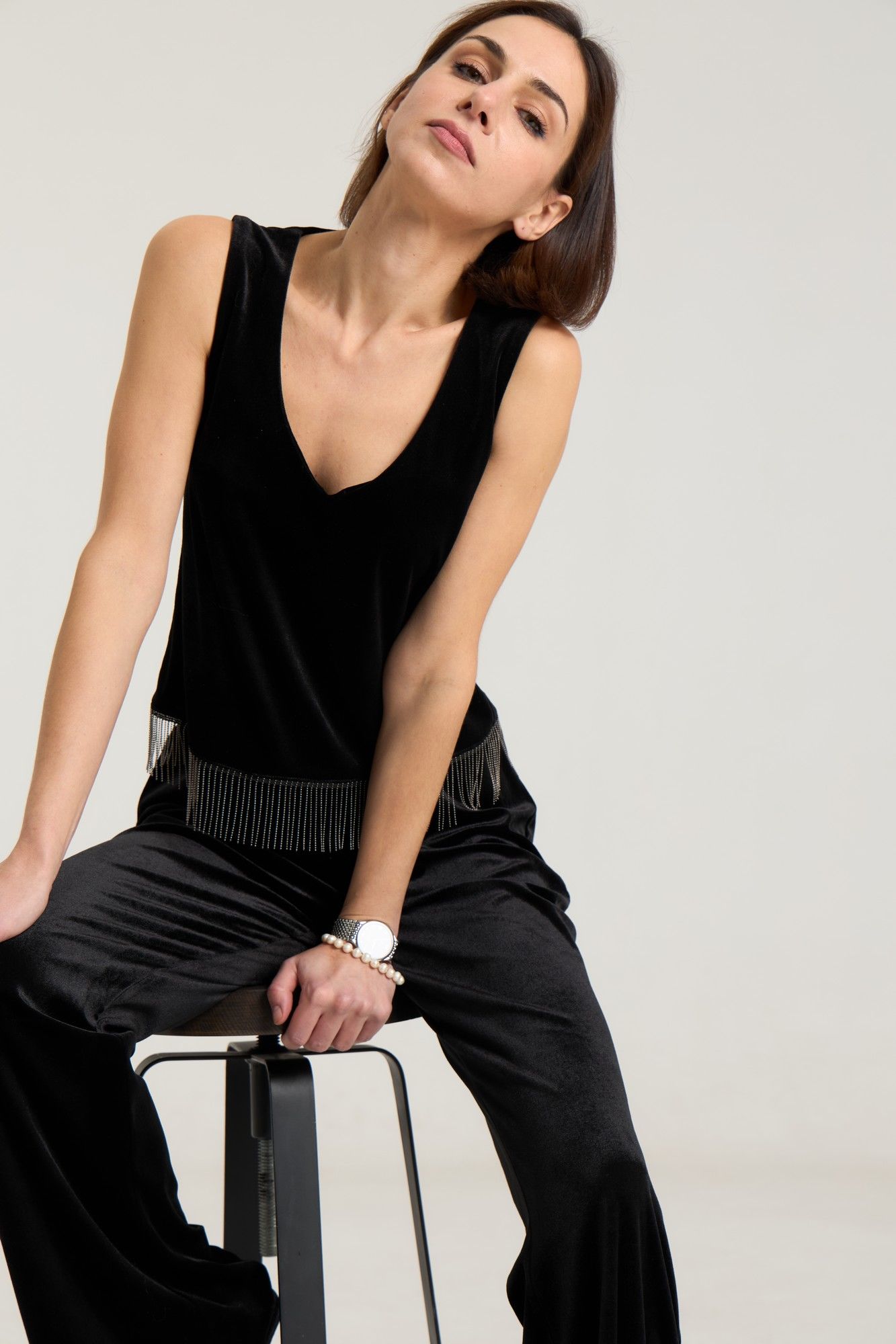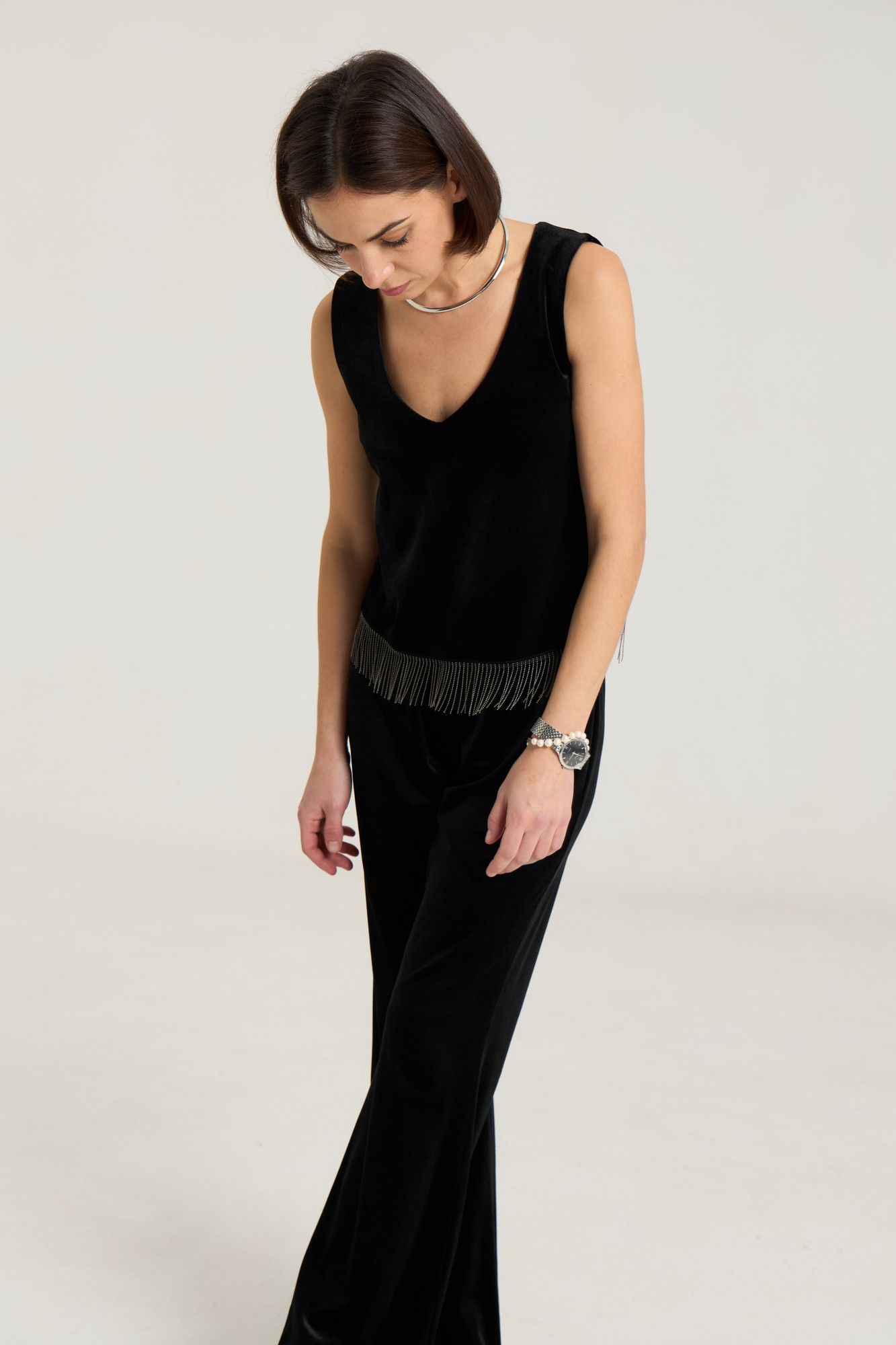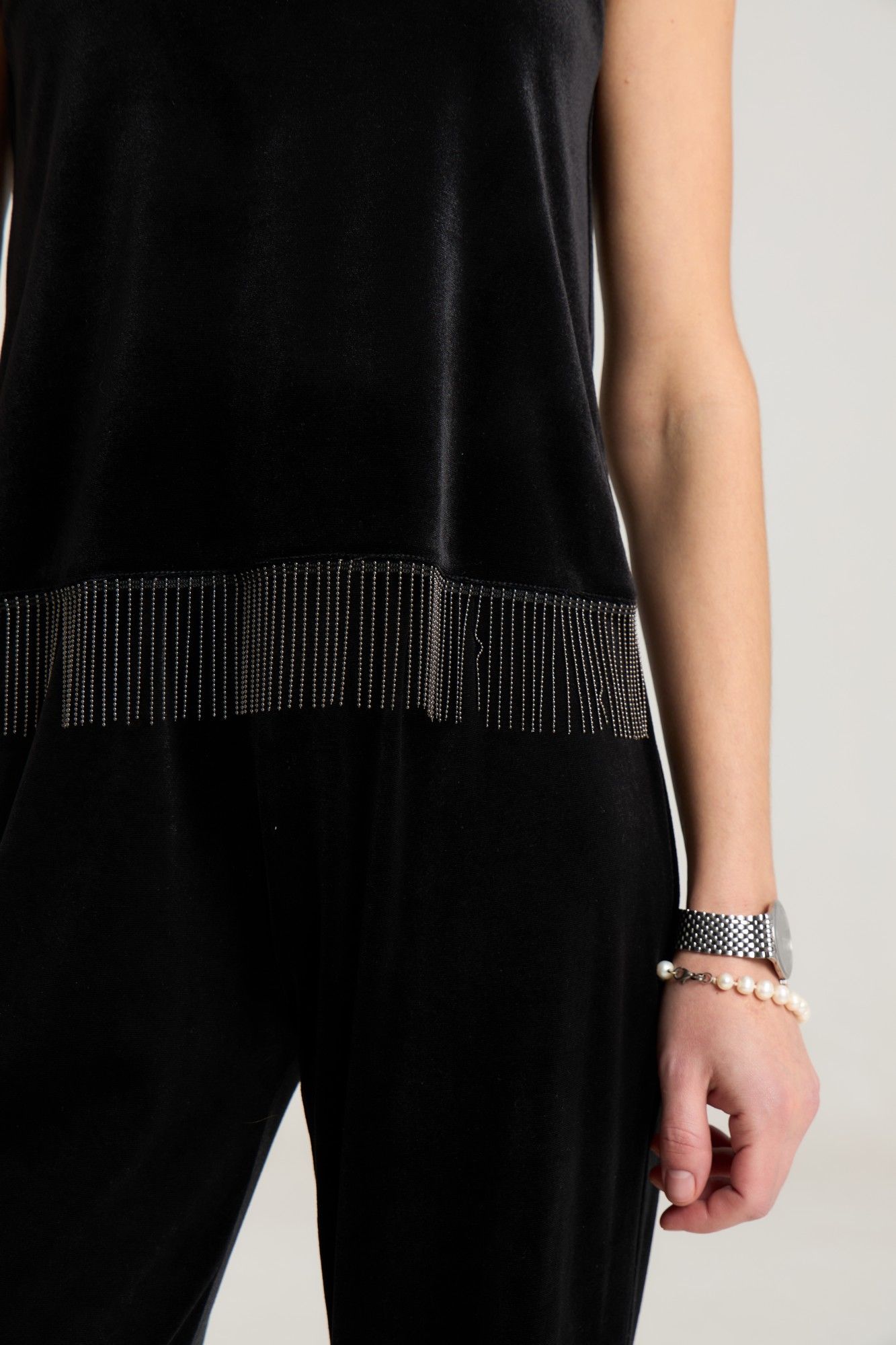 Топ свободного кроя выполнен из велюровой ткани черного цвета, на обтачке по переду и спинке, с углубленным вырезом. Длина по спинке 48 см, 6 см длина декора, полуобхват груди 43 см в 42-м размере. Топ красиво и лаконично смотрится с любым низом, за счет декора образ зрительно притягивает внимание. Рост модели на фото 168 см.
