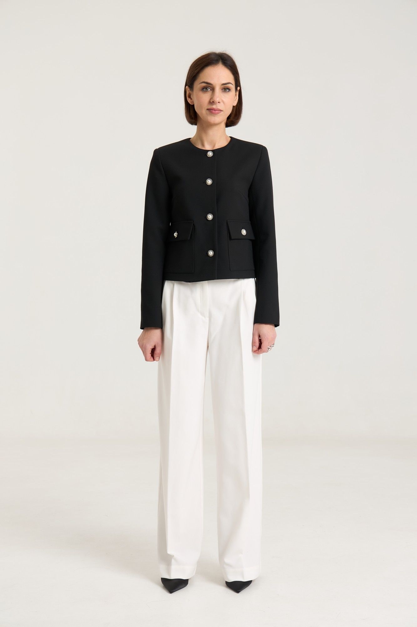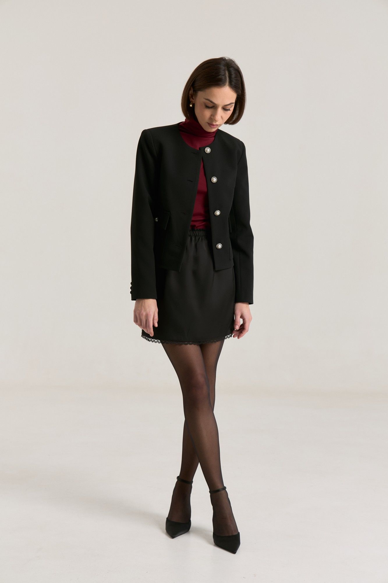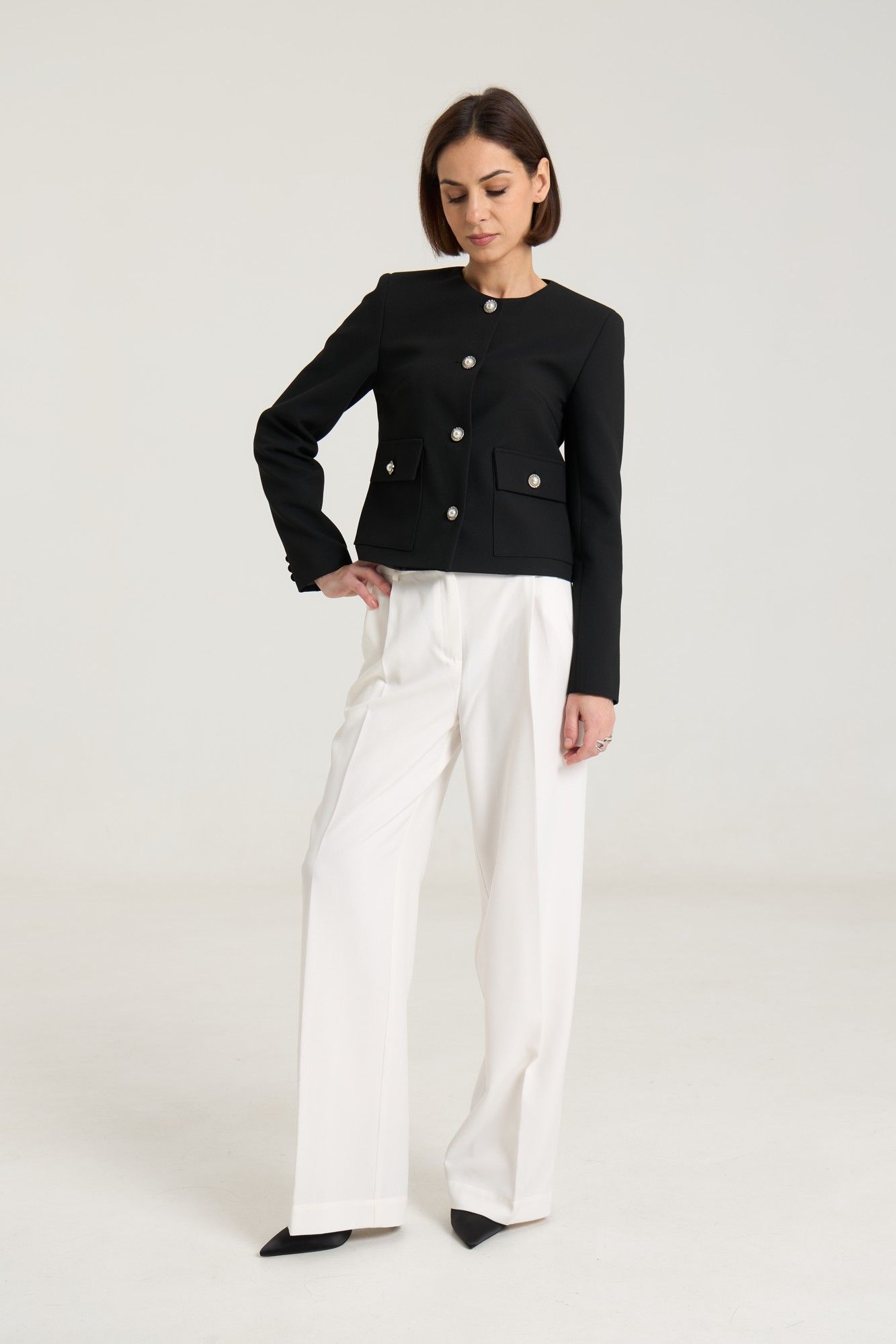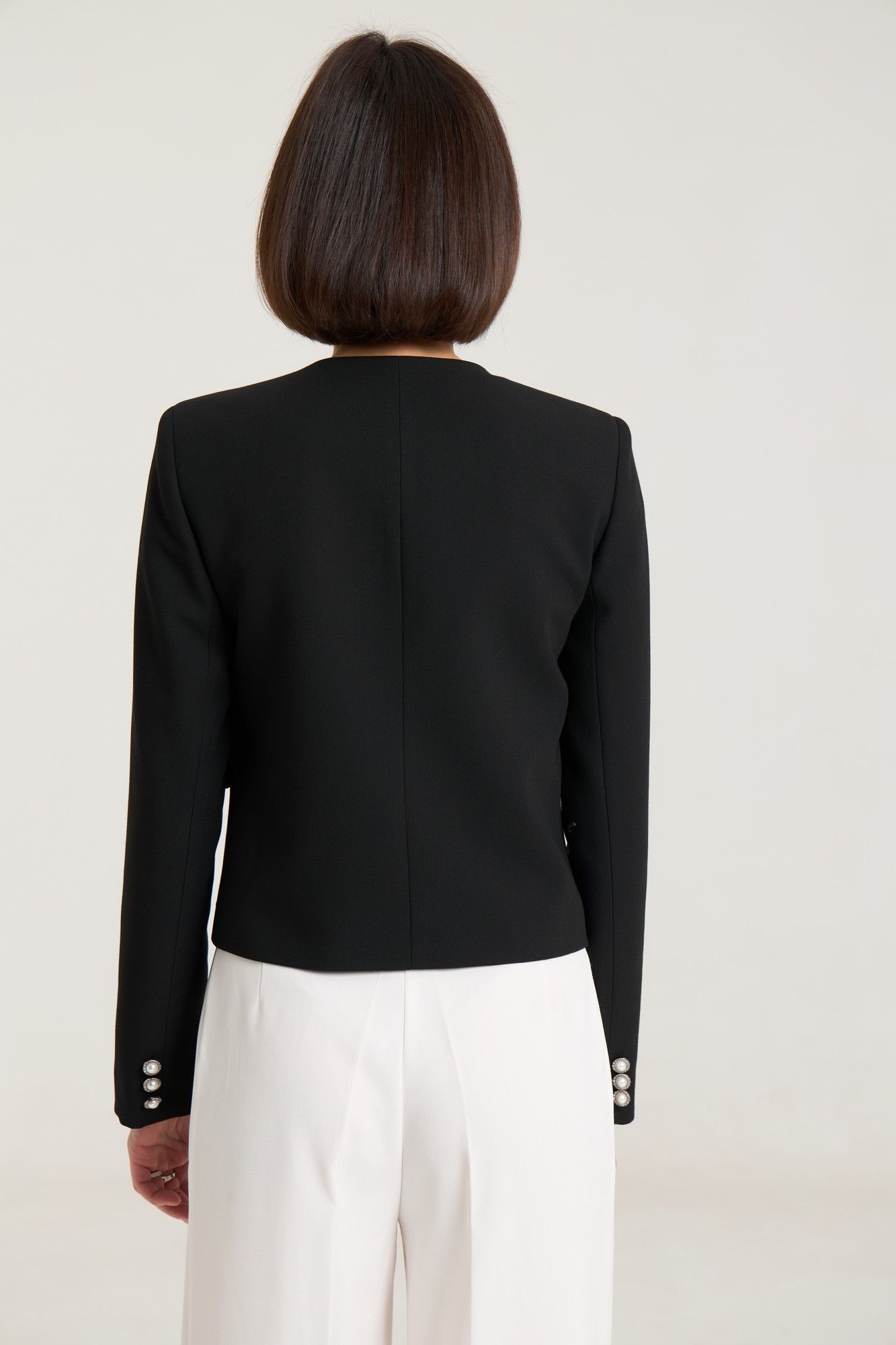 Жакет укороченный, прямого силуэта, с втачными рукавами , горловина округлой формы, без воротника.По бокам накладные функциональные карманы с застежкой на петлю-пуговицу. Застёжка жакета центральная однабортная на петли и пуговицы. спинка со средним швом и рельефами без шлиц и пуговиц. Жакет на подкладке. Длина по спинке 50 см, Длина рукава 59 см .