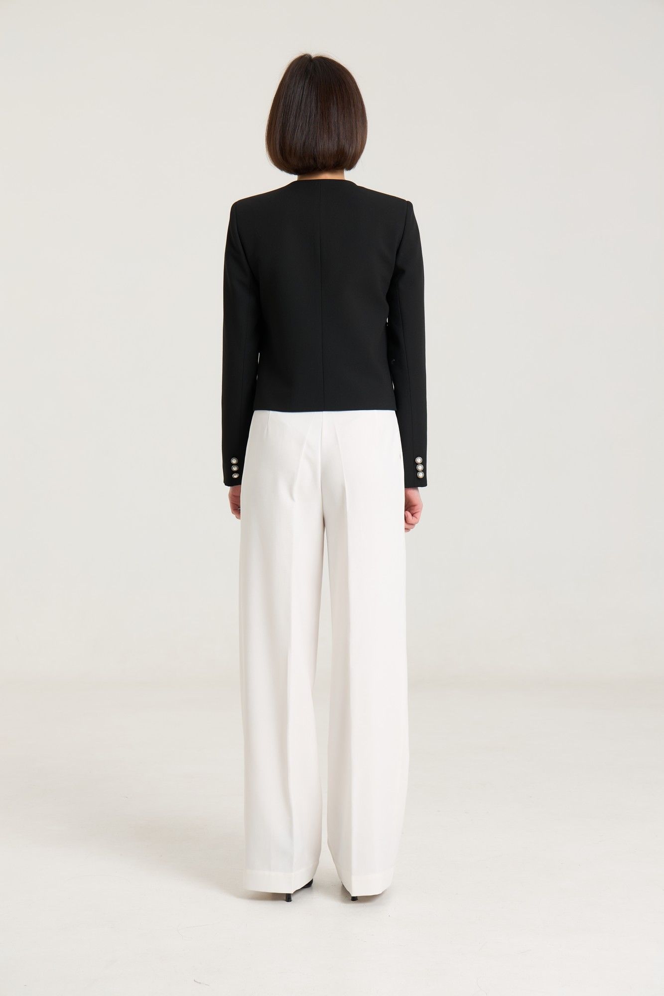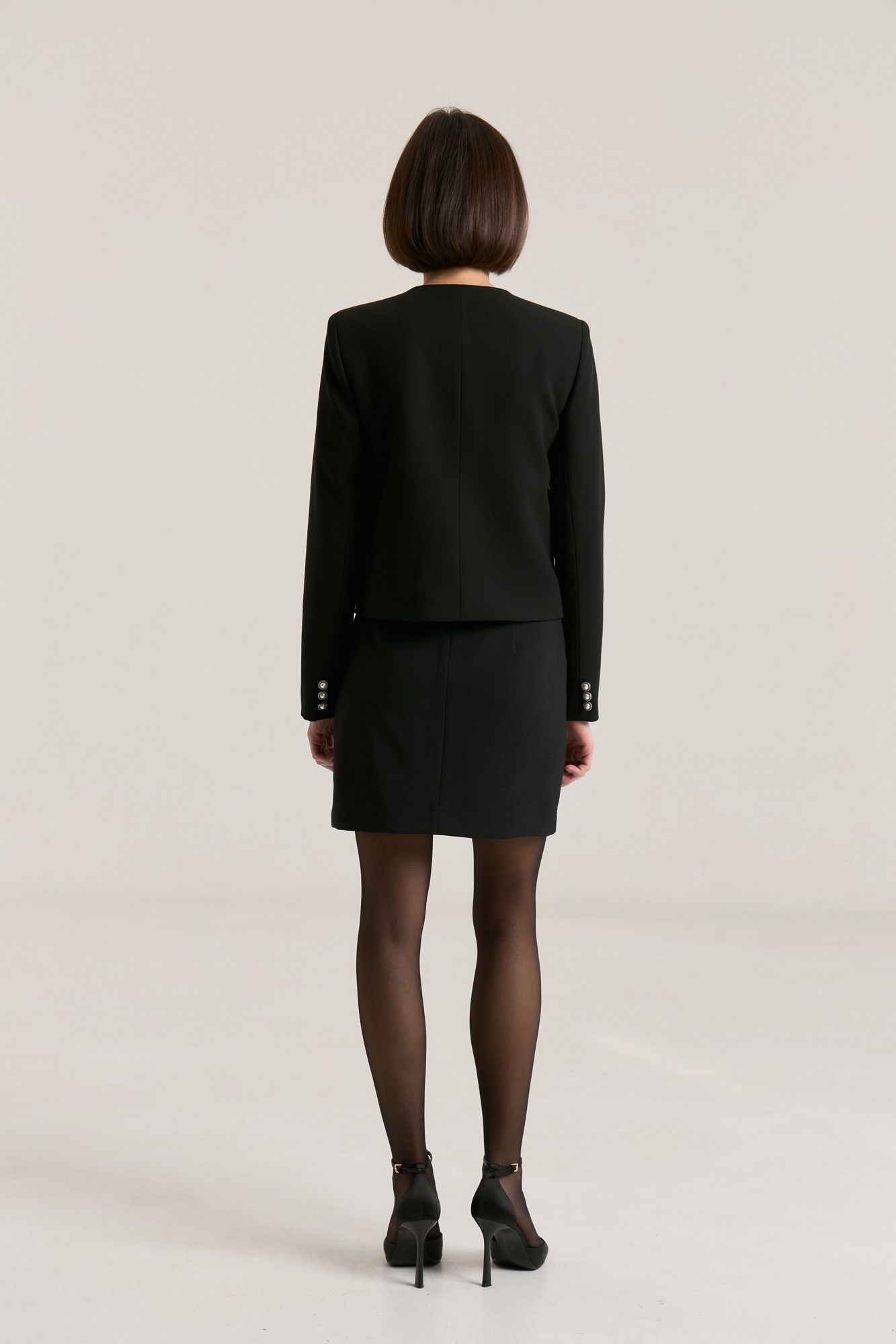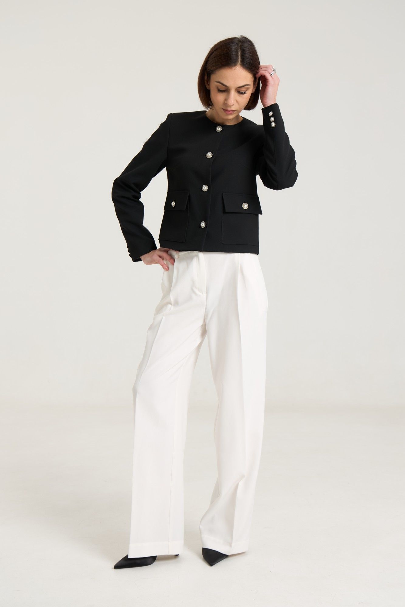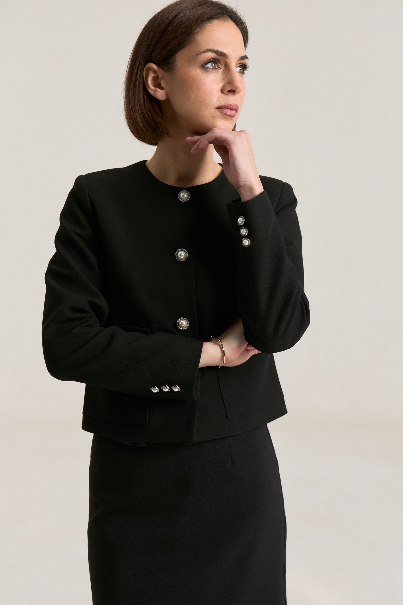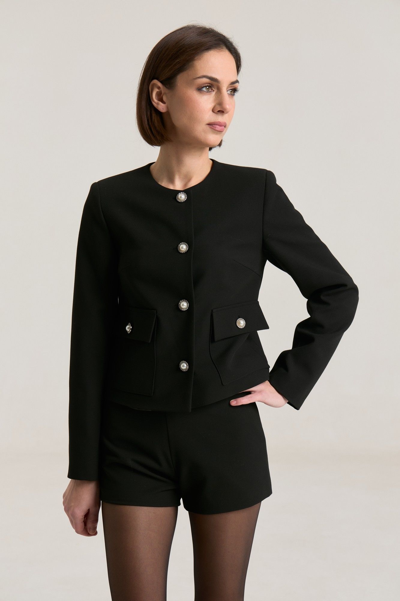 Жакет укороченный, прямого силуэта, с втачными рукавами , горловина округлой формы, без воротника.По бокам накладные функциональные карманы с застежкой на петлю-пуговицу. Застёжка жакета центральная однабортная на петли и пуговицы. спинка со средним швом и рельефами без шлиц и пуговиц. Жакет на подкладке. Длина по спинке 50 см, Длина рукава 59 см .