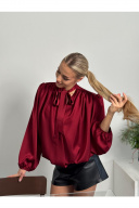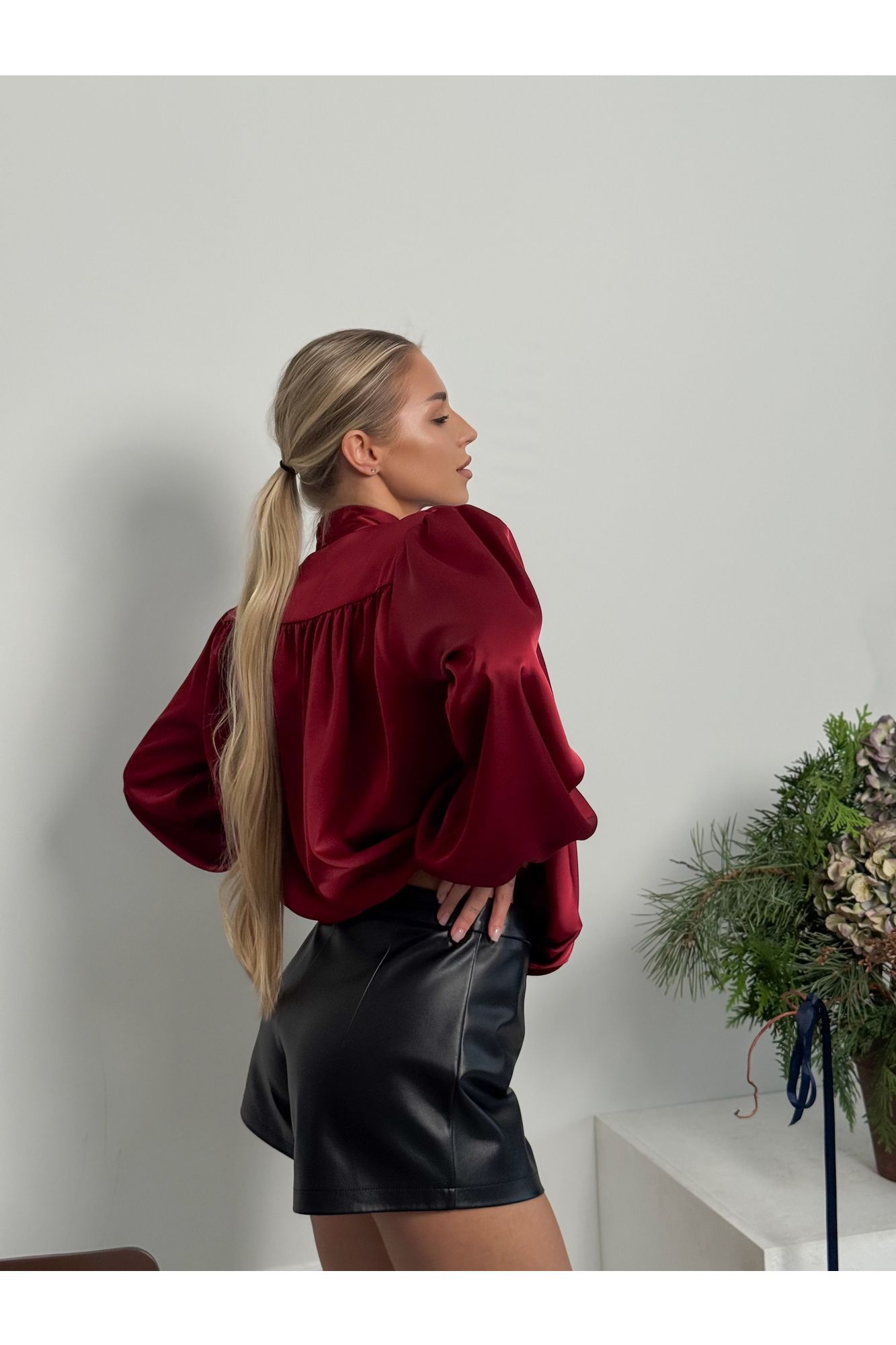 Блузка из невесомой струящейся ткани, с объемными плечами, по низу и на рукавах резинка. Рост модели 168 см. Длина-59 см, рукав-63 см, обхват груди-124 см.