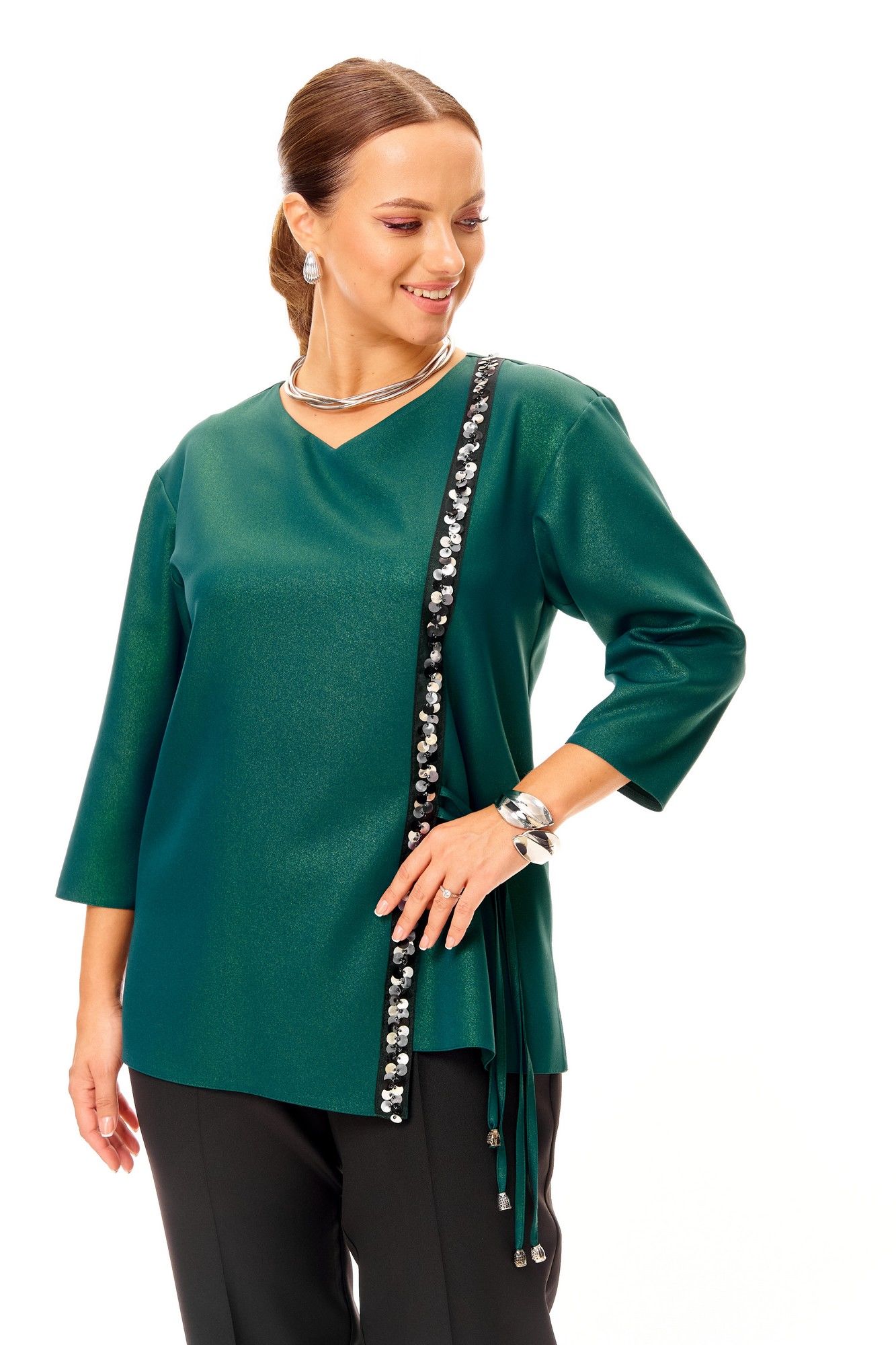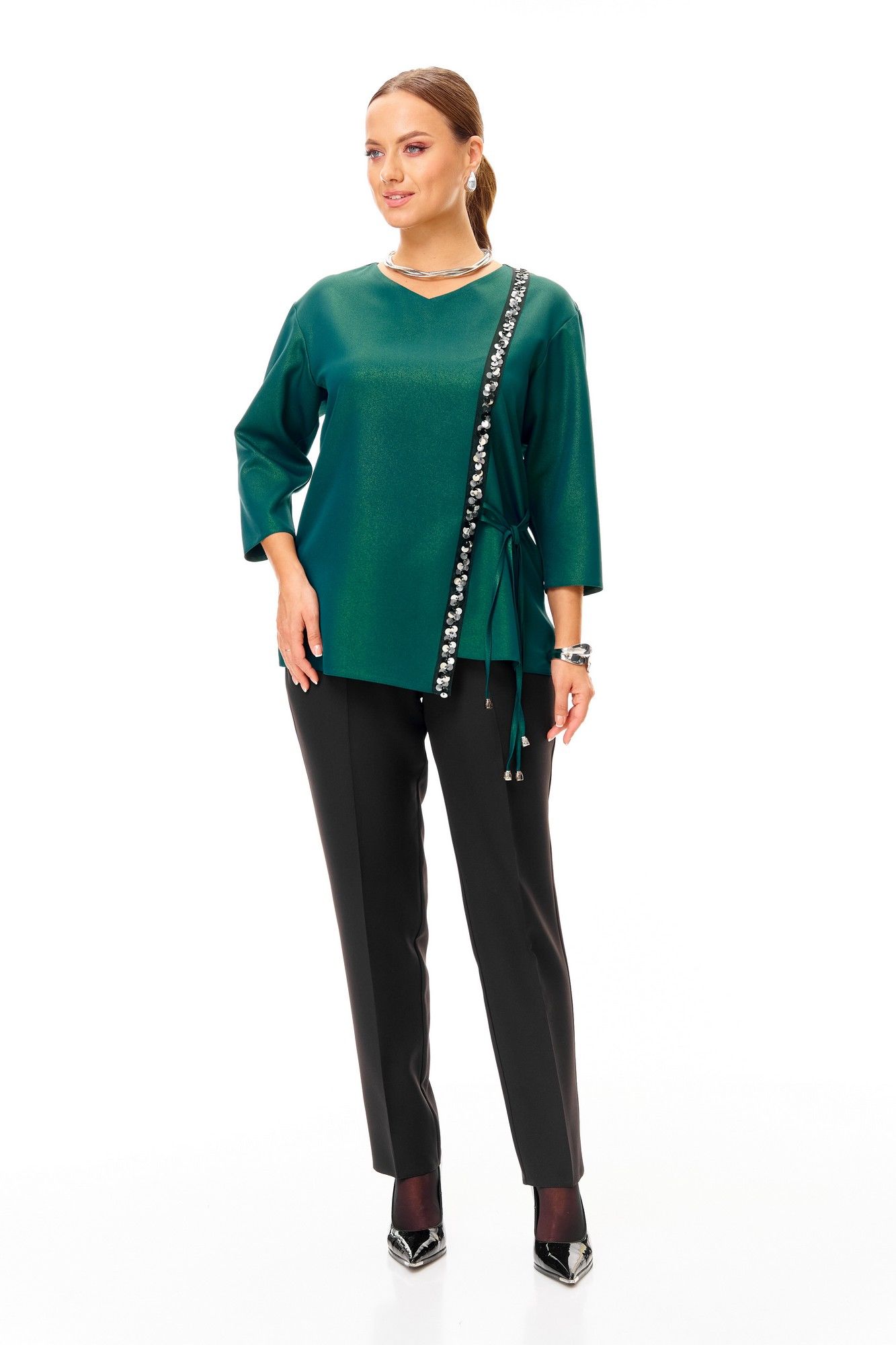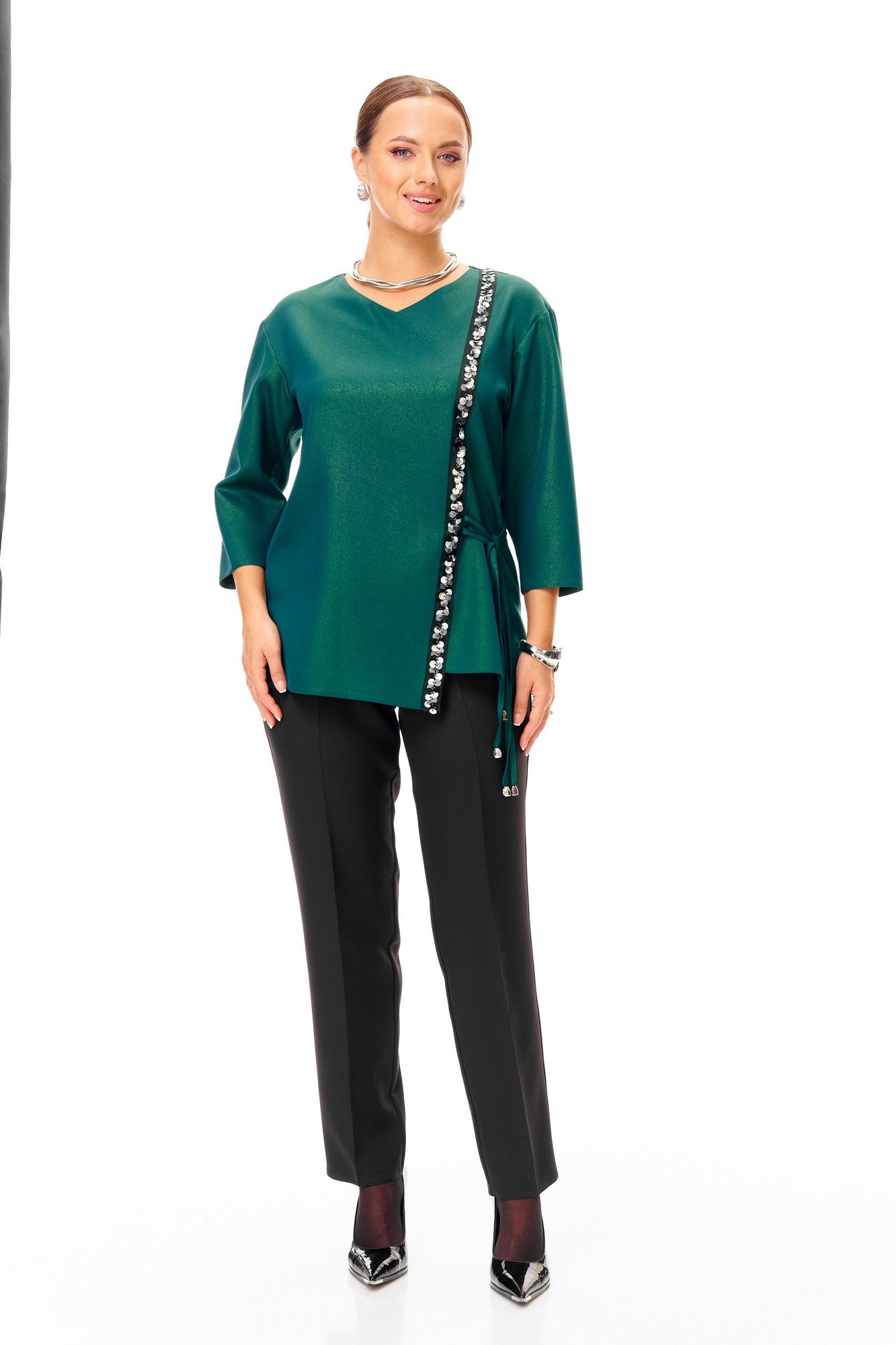Нарядный костюм состоит из туники и брюк . Выполнен из нарядной костюмной ткани с блеском. Туника свободного силуэта с декоративной тесьмой по переду. Горловина неглубокая V-образная. Плечо слегка спущено. Рукав зауженный к низу. Длина 66 см. Длина рукава с плечом 56 см. Окружность по груди размер 48-106 см 50-110 см 52-114 см 54-118 см 56-122 см Окружность по бедрам размер 48-110 см 50-114 см 52-118 см 54-122 см 56-126 см Удобные брюки с высокой посадкой на талии, с глубокими карманами, по поясу резинка. Длина брюк 100 см. Окружность по талии : размер 48-74 см-104 см 50-78 см-108 см 52-84 см-112 см 54-88 см-116 см 56-94 см-120 см