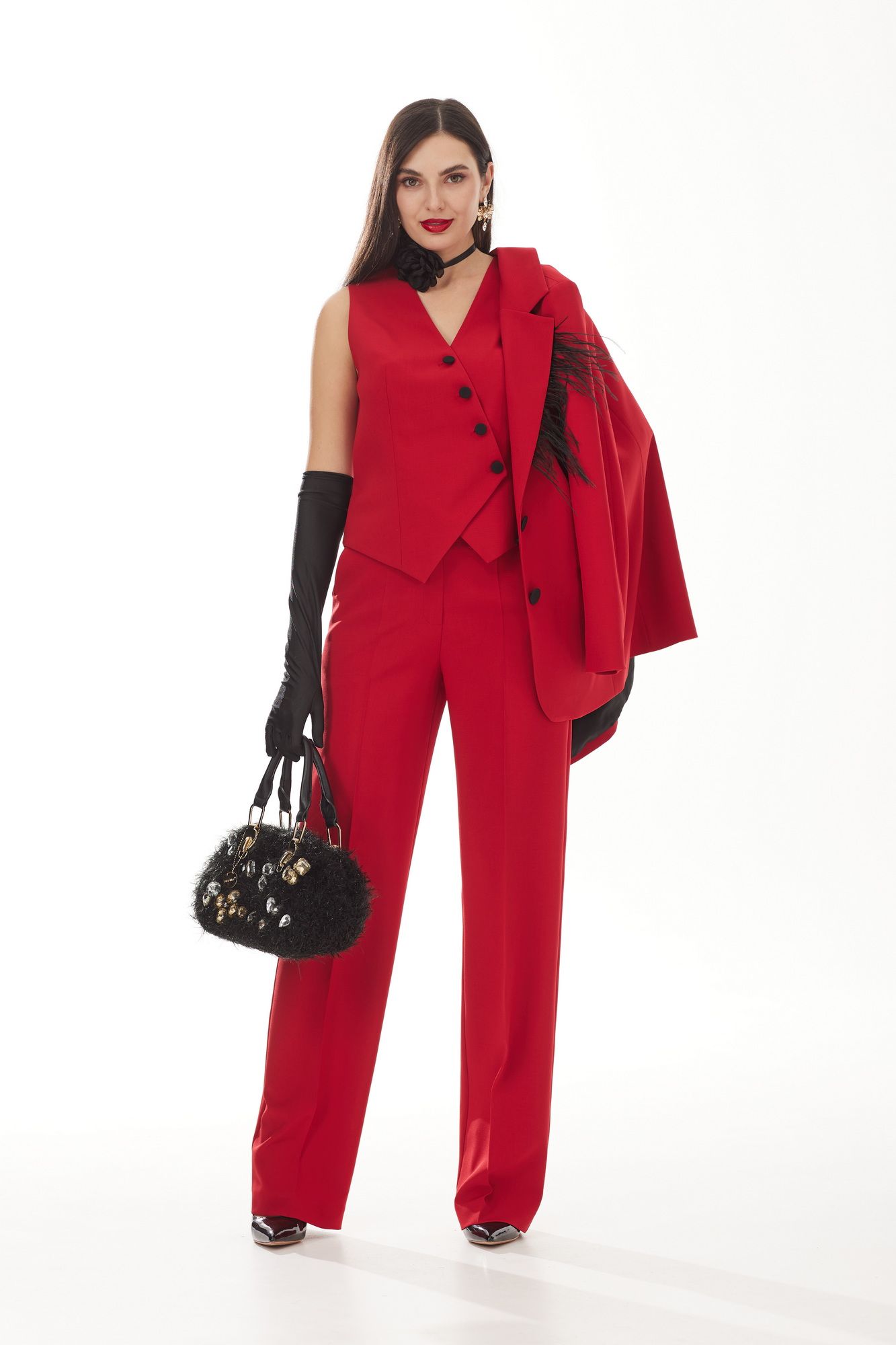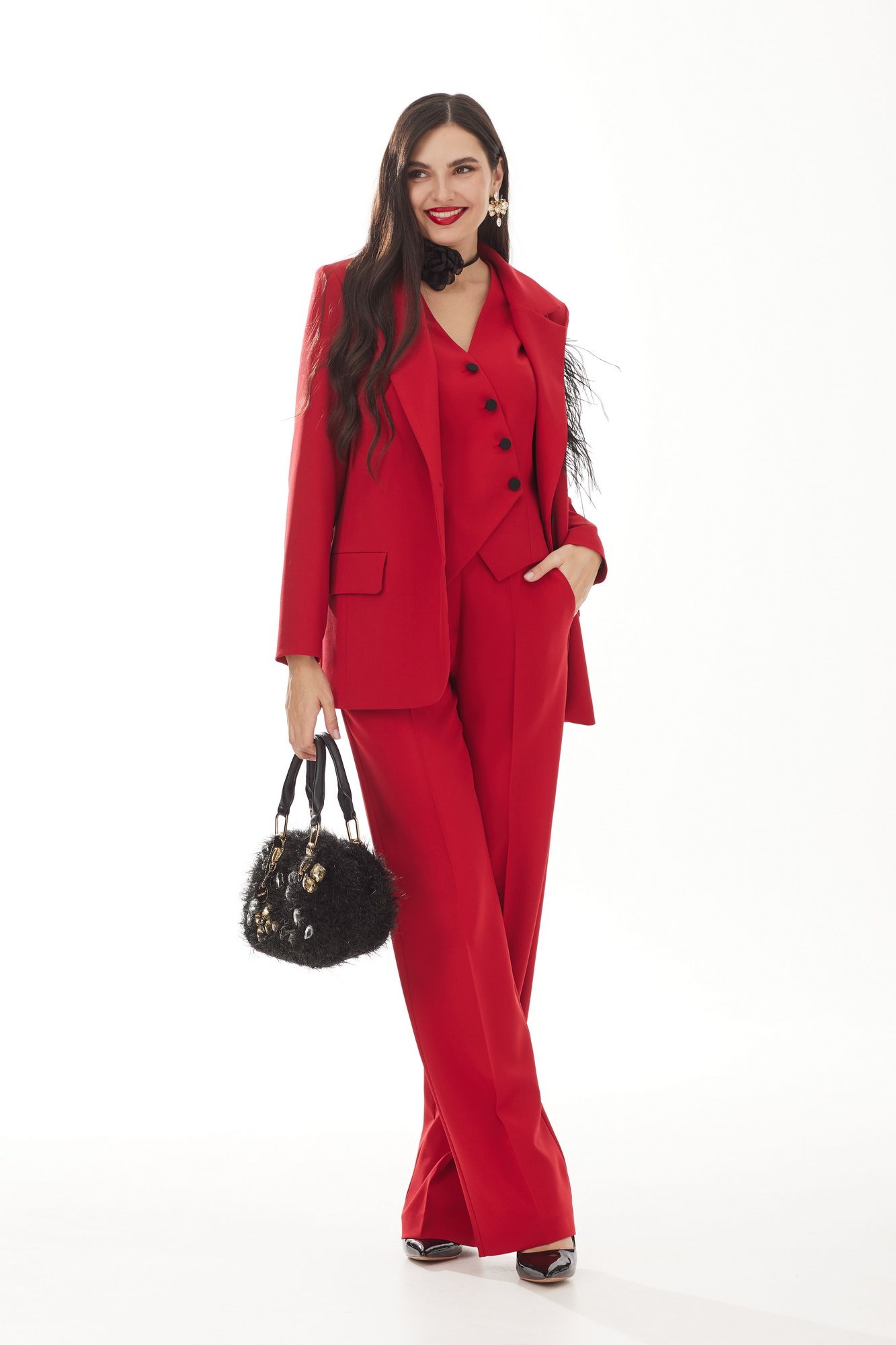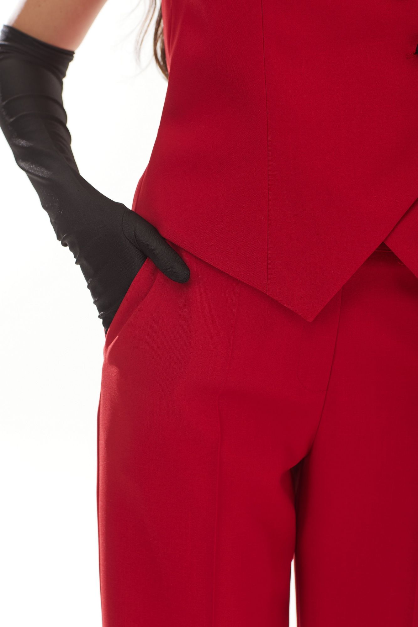 Красные брюки – идеальный выбор для женщин, которые ценят классическую моду с характером. Если вы из их числа, вам понравятся брюки из нашей новой коллекции. У этой модели много преимуществ: насыщенный цвет придает энергии и излучает уверенность в себе, а неподвластный времени крой всегда идеален. Брюки классической формы, прямого силуэта, со стрелками по передним и задним половинкам. Верхний срез обработан обтачным поясом, дополнена практичными шлевками для ремня. На задних половинках расположены талиевые вытачки, с настрочными декоративными листочками. В боковых швах брюк обработаны наклонные карманы. Застёжка центральная на тесьму молнию и крючок. Элегантные брюки не обязательно должны быть скучными, а деловая или формальная стилизации могут удивить своей неповторимостью.