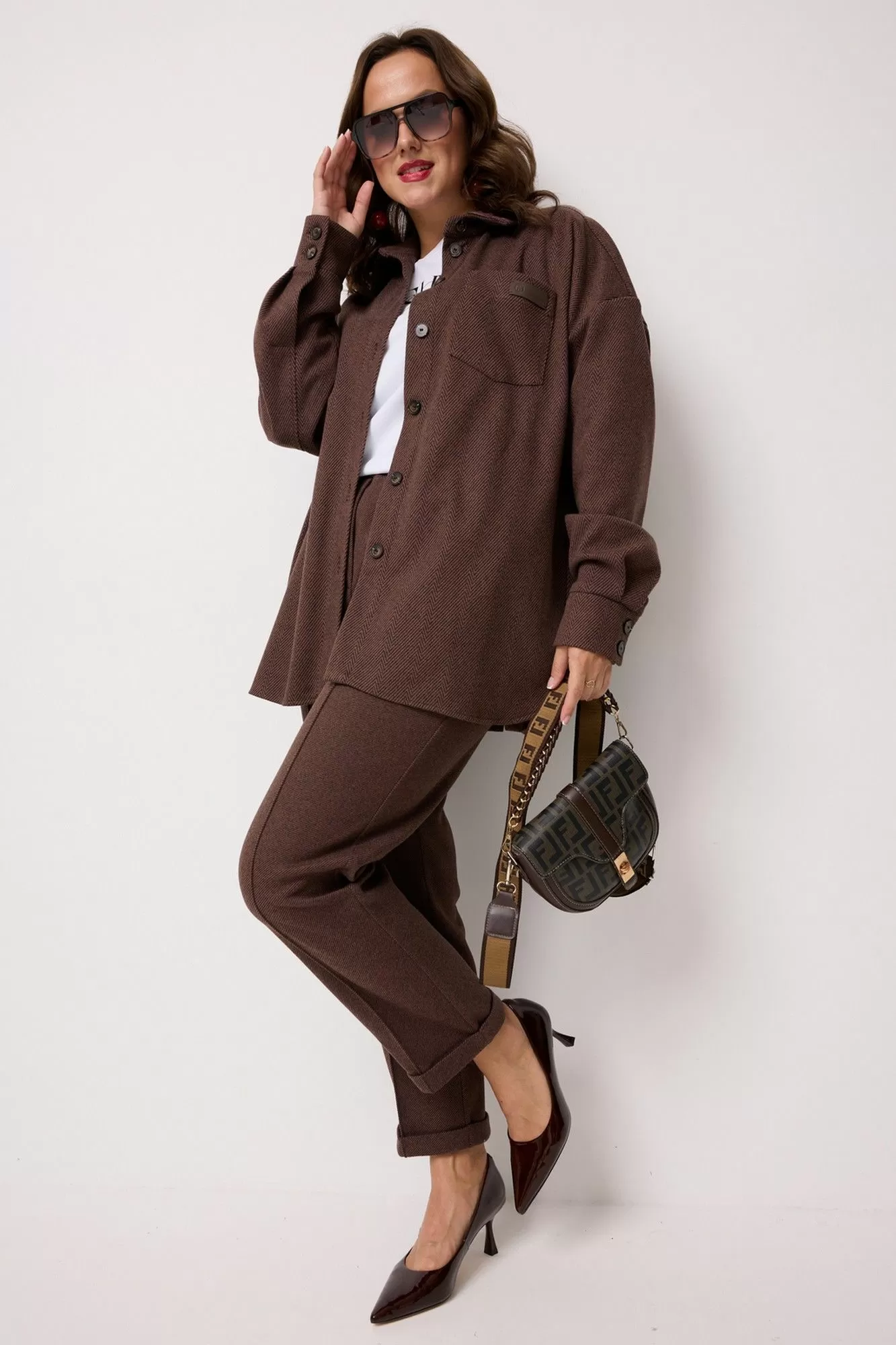 Комплект женский 2-х предметный, состоящий из рубашки и брюк. Рубашка выполнена из поливискозы с принтом "елочка". Рубашка длиной до середины бедра, прямого силуэта, с центральной застёжкой на петли и пуговицы. Горловина рубашечного типа. Блуза со спущенной линией плеч. Рукава длинные, по низу обработана шлица и притачные манжеты, которые застёгиваются на 2 петли и пуговицы. На одной манжете настрочена декоративная нашивка. В области груди, с одной стороны, накладной карман с декоративной нашивкой. Спинка с кокеткой и со средним швом, в котором обработана шлица, застегивающаяся на 3 петли и пуговицы. Низ рубашки закруглен. Брюки выполнены из поливискозы однотонного компаньона. Брюки прямого силуэта, слегка заужены к низу. Низ брюк с цельнокроеной манжетой. Брюки с отстроченными по переду стрелками и заутюженными по задним половинкам. Верхний срез обработан притачным поясом, в который вставлена резинка. По центру переда - застёжка-обманка. В боковых швах расположены наклонные карманы.