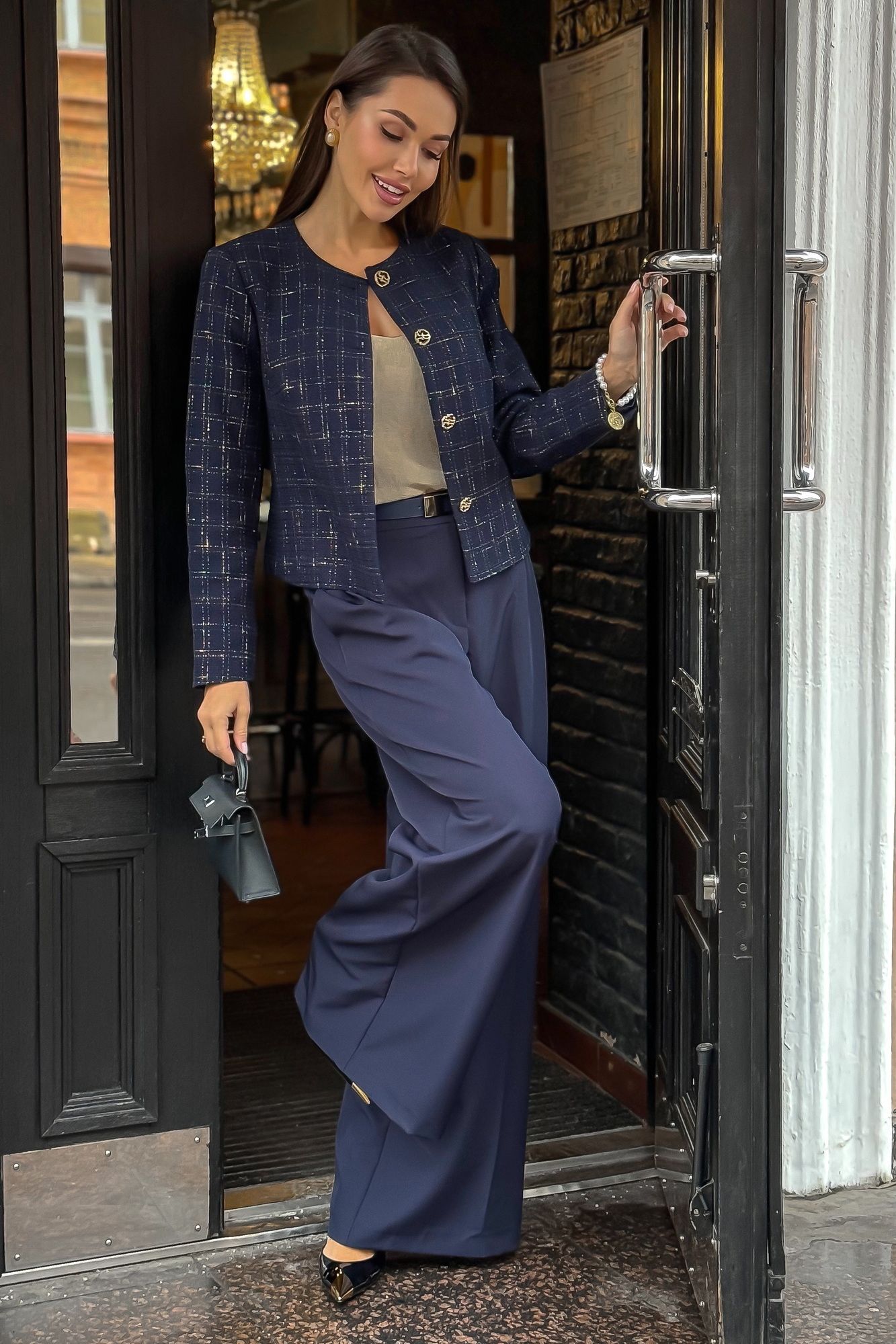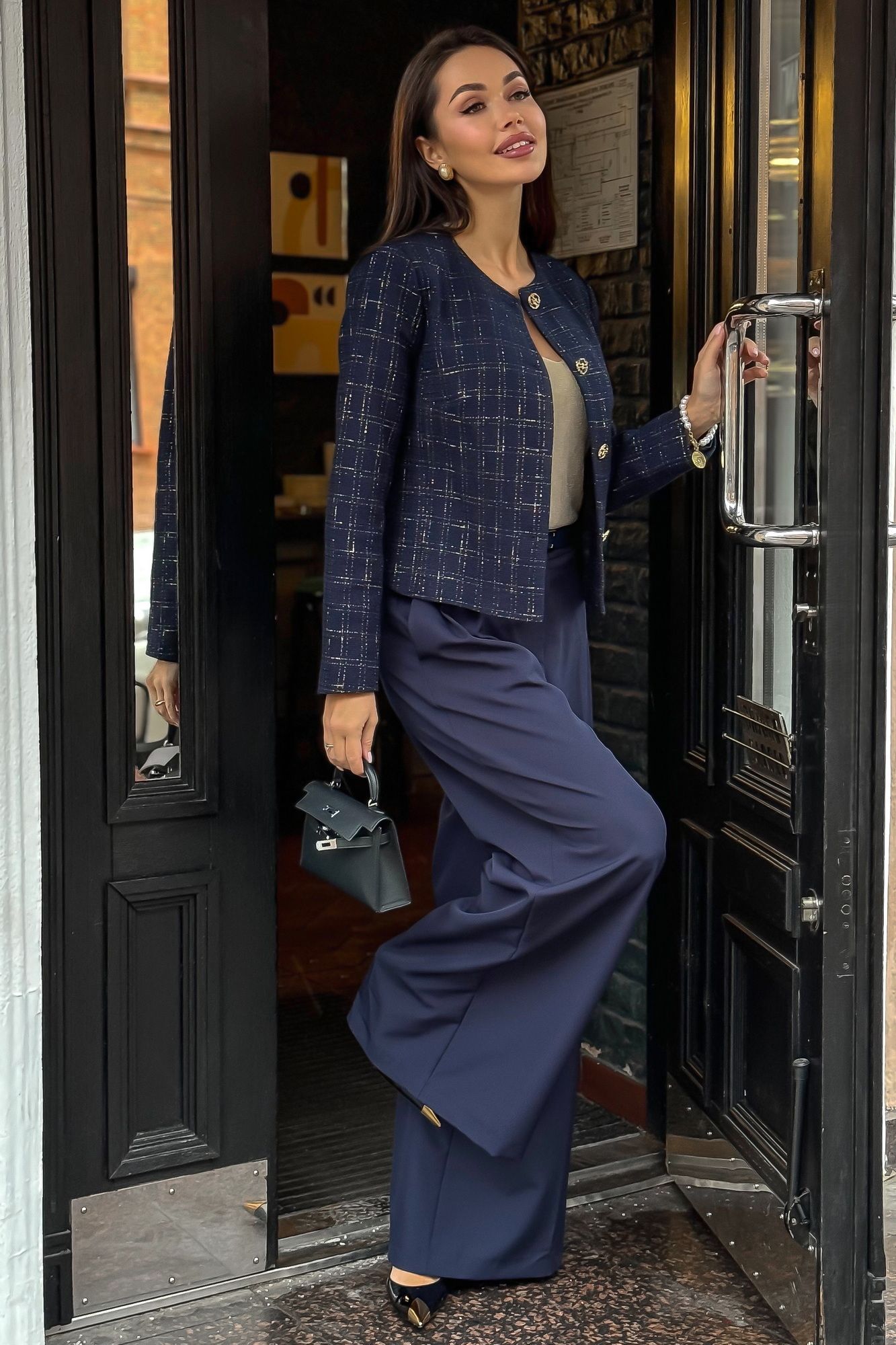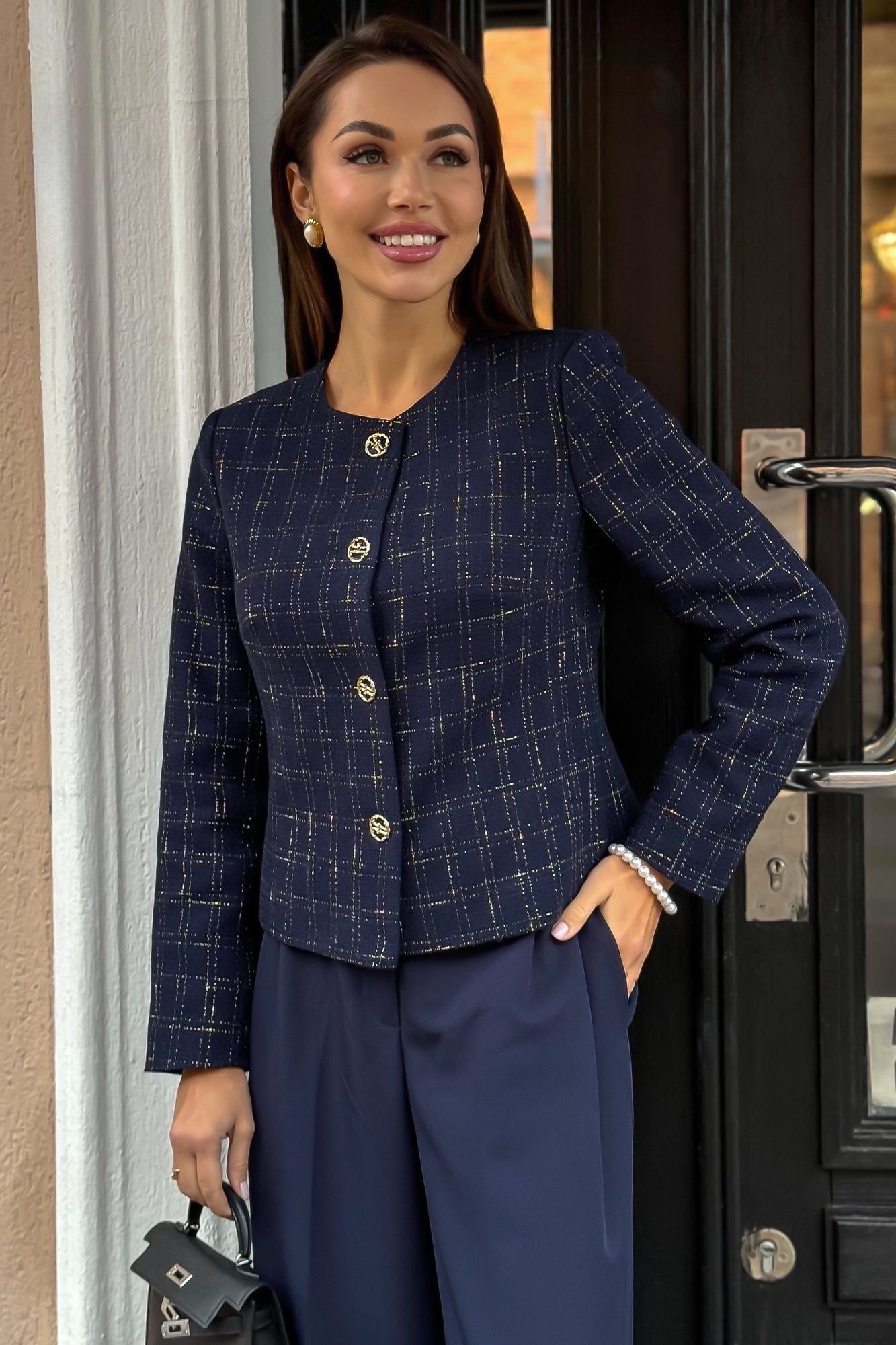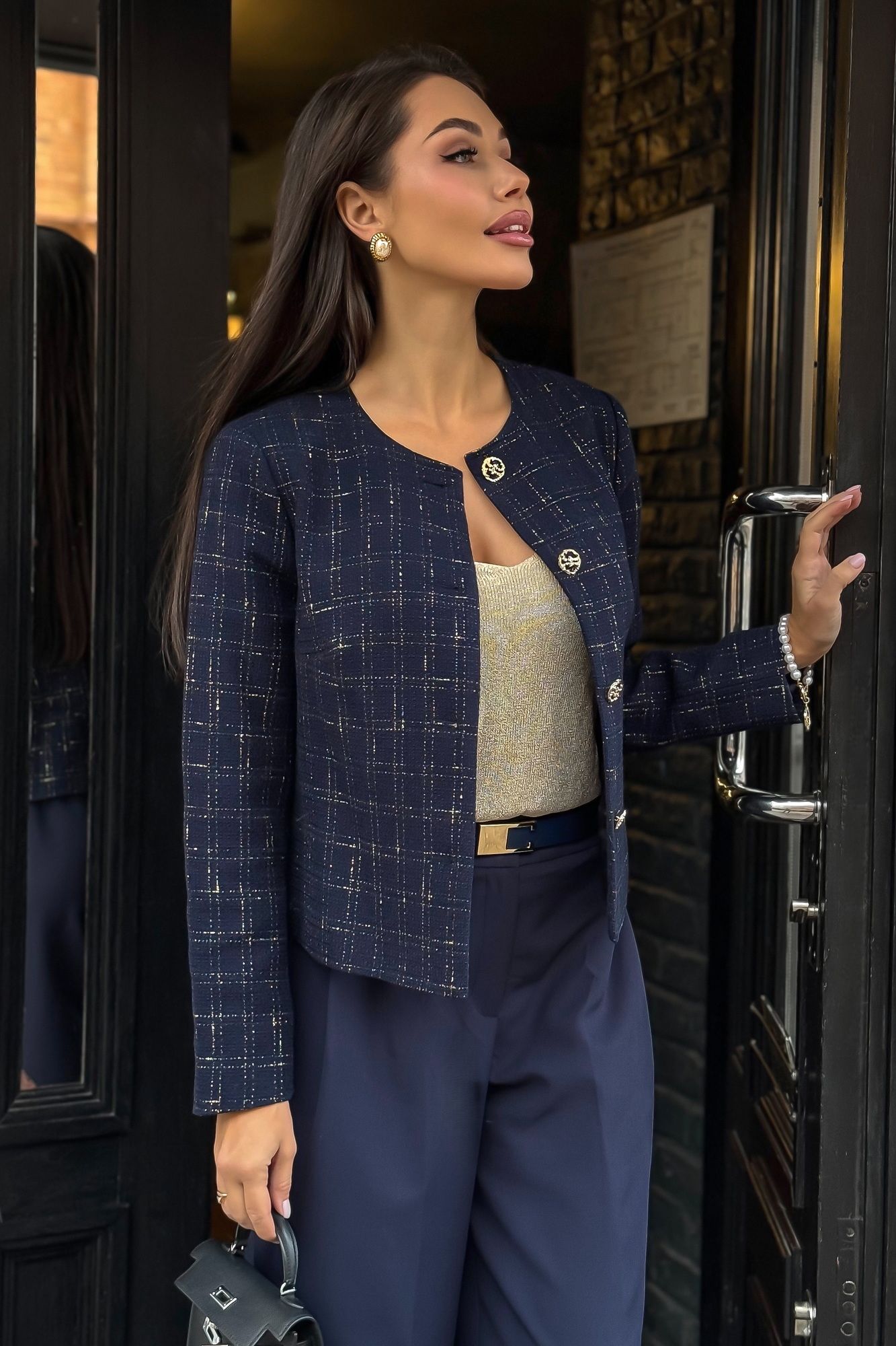 Элегантный твидовый жакет в глубоких синих тонах — воплощение утончённого стиля и современной женственности. Золотистая клетка придаёт изделию изысканности, а классический крой подчёркивает изящность фигуры. Этот жакет станет ключевым элементом вашего гардероба, подходящим как для офиса, так и для вечерних прогулок. Ощутите себя уверенной и стильной в любой ситуации! Жакет женский, выполнен из костюмной твидовой ткани, предназначен для повседневной носки. Жакет полуприлегающего силуэта, на подкладке, с центральной бортовой застежкой до верха на 4 петли и 4 пуговицы (размер и цвет фурнитуры может незначительно отличаться от фото). Перед с отрезными бочками, с нагрудными вытачками, идущими от бочков. Спинка со средним швом, с рельефными швами, идущими от пройм вниз. Рукава втачные, двухшовные, длинные. Горловина переда и спинки обтачная, округлой формы. Жакет с плечевыми накладками. Состав: полиэстер - 44%, хлопок - 34%, акрил - 20%, люрекс - 2% Состав подкладки: полиэстер - 55%, вискоза 45%. "42 размер Длина по среднему шву спинки - 50,0 см (±2,0 см), Ширина на уровне глубины проймы - 46,0 см (±1,0 см), Ширина на уровне линии талии - 41,0 см (±1,0 см), Длина рукава - 60,0 см (±1,0 см), Ширина рукава вверху - 16,0 см (±1,0 см), Ширина рукава по низу - 12,3 см (±0,5 см), Длина плеча - 11,2 см (±0,5 см). 44 размер Длина по среднему шву спинки - 50,0 см (±2,0 см), Ширина на уровне глубины проймы - 48,0 см (±1,0 см), Ширина на уровне линии талии - 43,0 см (±1,0 см), Длина рукава - 60,0 см (±1,0 см), Ширина рукава вверху - 17,0 см (±1,0 см), Ширина рукава по низу - 12,3 см (±0,5 см), Длина плеча - 11,2 см (±0,5 см). 46 размер Длина по среднему шву спинки - 50,0 см (±2,0 см), Ширина на уровне глубины проймы - 50,0 см (±1,0 см), Ширина на уровне линии талии - 46,0 см (±1,0 см), Длина рукава - 60,0 см (±1,0 см), Ширина рукава вверху - 17,0 см (±1,0 см), Ширина рукава по низу - 13,0 см (±0,5 см), Длина плеча - 11,3 см (±0,5 см). 48 размер Длина по среднему шву спинки - 50,0 см (±2,0 см), Ширина на уровне глубины проймы - 52,0 см (±1,0 см), Ширина на уровне линии талии - 48,0 см (±1,0 см), Длина рукава - 60,0 см (±1,0 см), Ширина рукава вверху - 18,0 см (±1,0 см), Ширина рукава по низу - 13,0 см (±0,5 см), Длина плеча - 11,3 см (±0,5 см). 50 размер Длина по среднему шву спинки - 51,5 см (±2,0 см), Ширина на уровне глубины проймы - 54,0 см (±1,0 см), Ширина на уровне линии талии - 50,0 см (±1,0 см), Длина рукава - 60,5 см (±1,0 см), Ширина рукава вверху - 19,5 см (±1,0 см), Ширина рукава по низу - 14,0 см (±0,5 см), Длина плеча - 11,7 см (±0,5 см). 52 размер Длина по среднему шву спинки - 51,5 см (±2,0 см), Ширина на уровне глубины проймы - 56,0 см (±1,0 см), Ширина на уровне линии талии - 52,0 см (±1,0 см), Длина рукава - 60,5 см (±1,0 см), Ширина рукава вверху - 20,5 см (±1,0 см), Ширина рукава по низу - 14,0 см (±0,5 см), Длина плеча - 11,7 см (±0,5 см). 54 размер Длина по среднему шву спинки - 52,0 см (±2,0 см), Ширина на уровне глубины проймы - 58,0 см (±1,0 см), Ширина на уровне линии талии - 55,5 см (±1,0 см), Длина рукава - 60,5 см (±1,0 см), Ширина рукава вверху - 20,5 см (±1,0 см), Ширина рукава по низу - 14,5 см (±0,5 см), Длина плеча - 12,2см (±0,5 см). 56 размер Длина по среднему шву спинки - 52,0 см (±2,0 см), Ширина на уровне глубины проймы - 60,0 см (±1,0 см), Ширина на уровне линии талии - 57,5 см (±1,0 см), Длина рукава - 60,5 см (±1,0 см), Ширина рукава вверху - 21,5 см (±1,0 см), Ширина рукава по низу - 14,5 см (±0,5 см), Длина плеча - 12,2см (±0,5 см)."