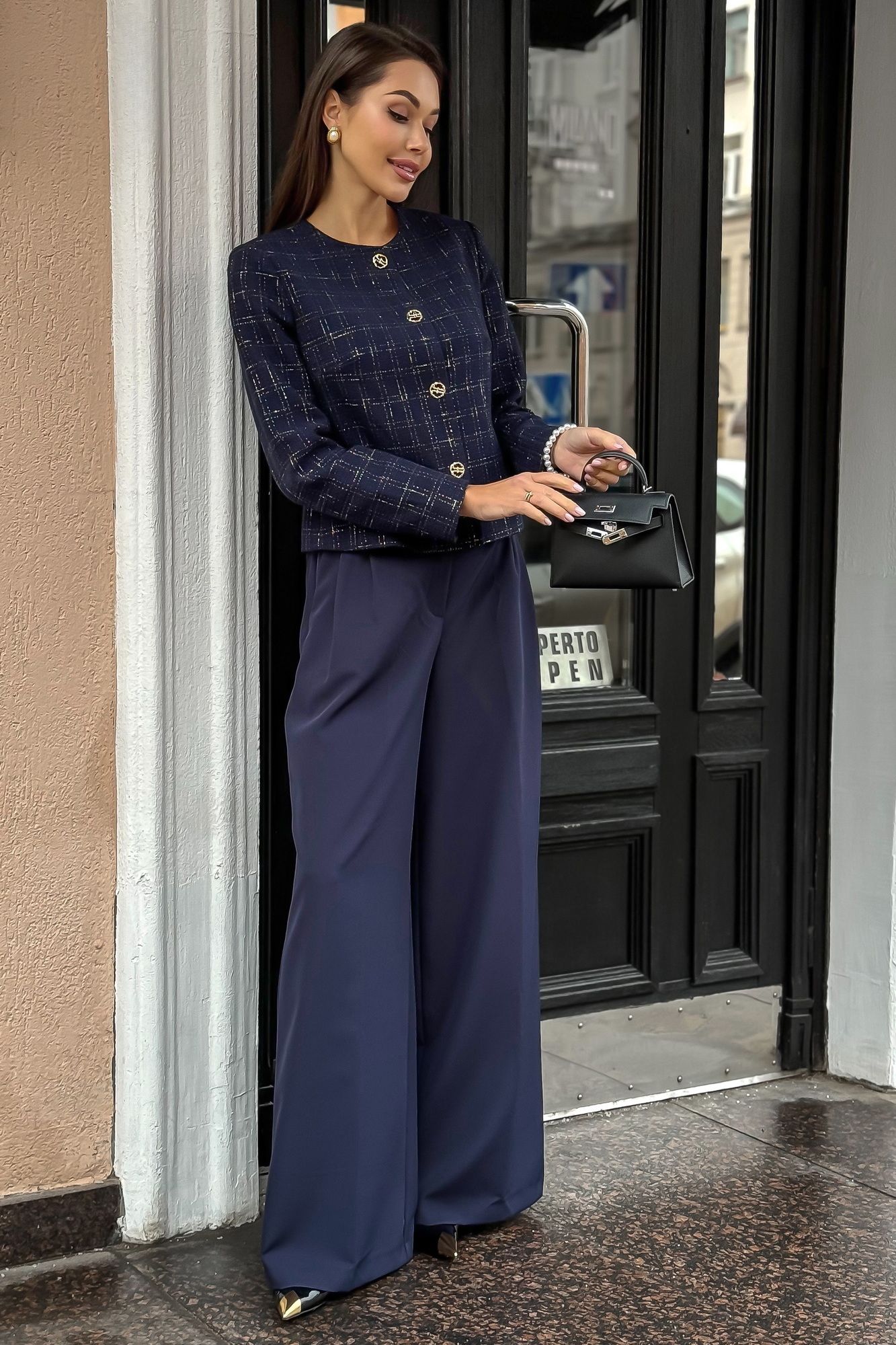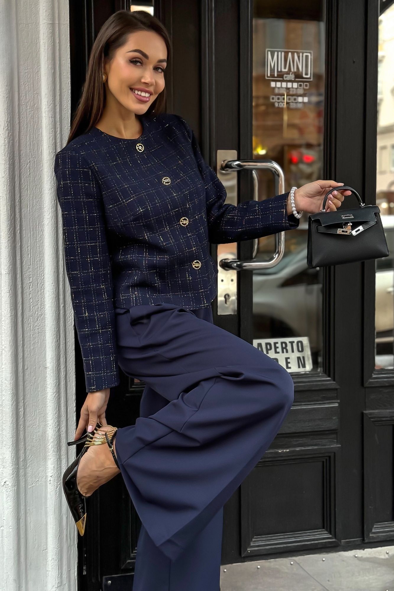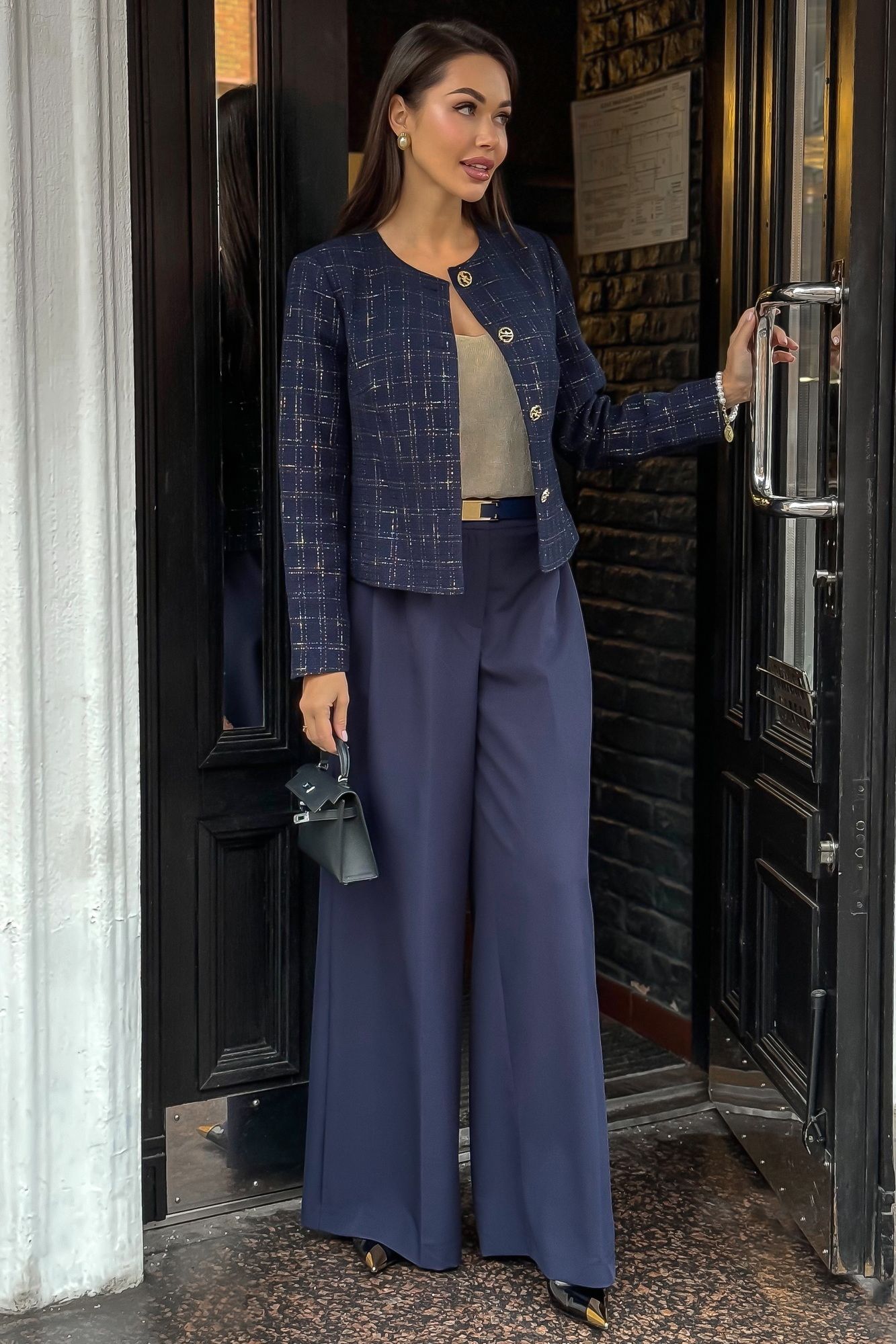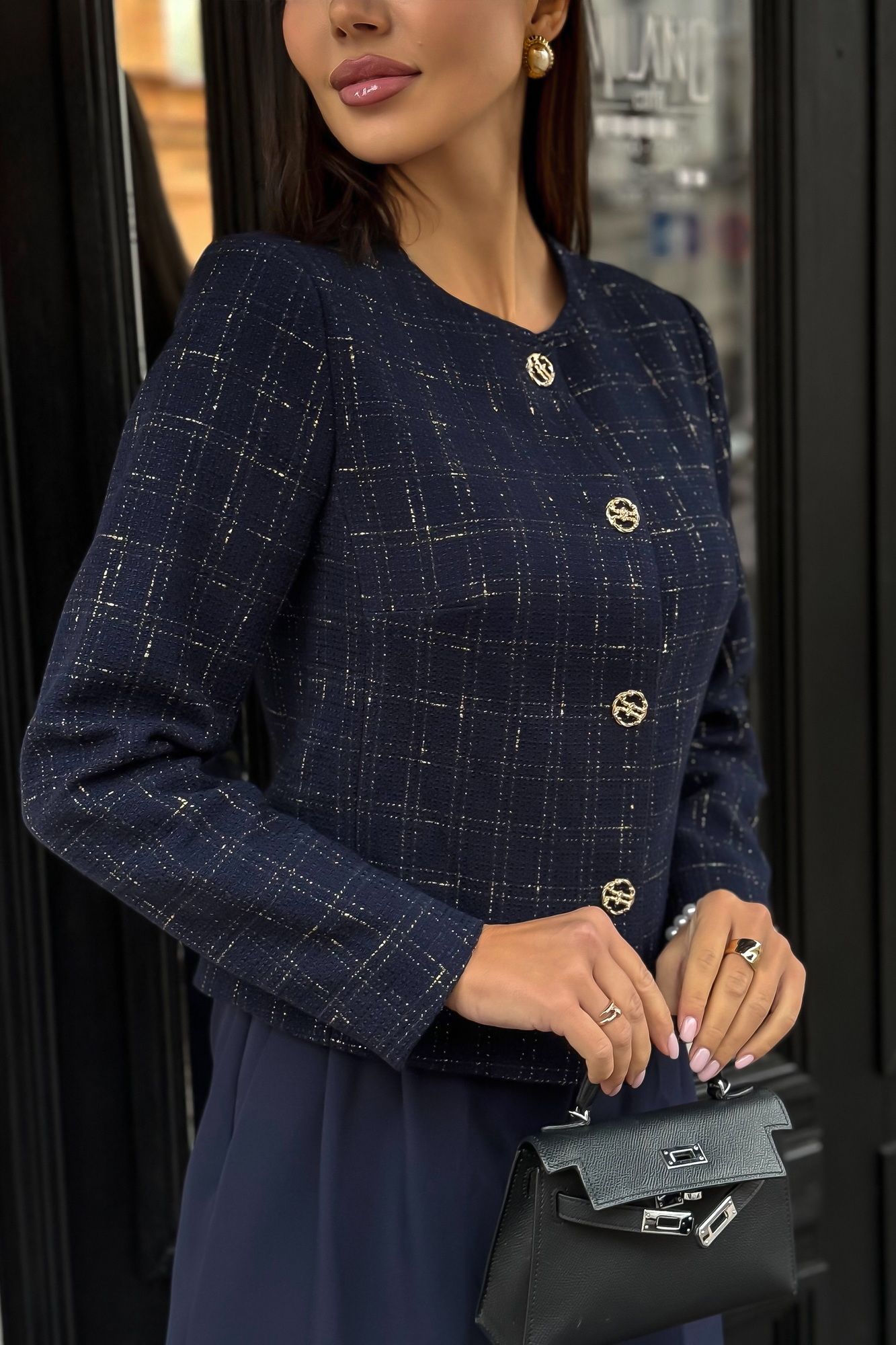 Элегантный твидовый жакет в глубоких синих тонах — воплощение утончённого стиля и современной женственности. Золотистая клетка придаёт изделию изысканности, а классический крой подчёркивает изящность фигуры. Этот жакет станет ключевым элементом вашего гардероба, подходящим как для офиса, так и для вечерних прогулок. Ощутите себя уверенной и стильной в любой ситуации! Жакет женский, выполнен из костюмной твидовой ткани, предназначен для повседневной носки. Жакет полуприлегающего силуэта, на подкладке, с центральной бортовой застежкой до верха на 4 петли и 4 пуговицы (размер и цвет фурнитуры может незначительно отличаться от фото). Перед с отрезными бочками, с нагрудными вытачками, идущими от бочков. Спинка со средним швом, с рельефными швами, идущими от пройм вниз. Рукава втачные, двухшовные, длинные. Горловина переда и спинки обтачная, округлой формы. Жакет с плечевыми накладками. Состав: полиэстер - 44%, хлопок - 34%, акрил - 20%, люрекс - 2% Состав подкладки: полиэстер - 55%, вискоза 45%. "42 размер Длина по среднему шву спинки - 50,0 см (±2,0 см), Ширина на уровне глубины проймы - 46,0 см (±1,0 см), Ширина на уровне линии талии - 41,0 см (±1,0 см), Длина рукава - 60,0 см (±1,0 см), Ширина рукава вверху - 16,0 см (±1,0 см), Ширина рукава по низу - 12,3 см (±0,5 см), Длина плеча - 11,2 см (±0,5 см). 44 размер Длина по среднему шву спинки - 50,0 см (±2,0 см), Ширина на уровне глубины проймы - 48,0 см (±1,0 см), Ширина на уровне линии талии - 43,0 см (±1,0 см), Длина рукава - 60,0 см (±1,0 см), Ширина рукава вверху - 17,0 см (±1,0 см), Ширина рукава по низу - 12,3 см (±0,5 см), Длина плеча - 11,2 см (±0,5 см). 46 размер Длина по среднему шву спинки - 50,0 см (±2,0 см), Ширина на уровне глубины проймы - 50,0 см (±1,0 см), Ширина на уровне линии талии - 46,0 см (±1,0 см), Длина рукава - 60,0 см (±1,0 см), Ширина рукава вверху - 17,0 см (±1,0 см), Ширина рукава по низу - 13,0 см (±0,5 см), Длина плеча - 11,3 см (±0,5 см). 48 размер Длина по среднему шву спинки - 50,0 см (±2,0 см), Ширина на уровне глубины проймы - 52,0 см (±1,0 см), Ширина на уровне линии талии - 48,0 см (±1,0 см), Длина рукава - 60,0 см (±1,0 см), Ширина рукава вверху - 18,0 см (±1,0 см), Ширина рукава по низу - 13,0 см (±0,5 см), Длина плеча - 11,3 см (±0,5 см). 50 размер Длина по среднему шву спинки - 51,5 см (±2,0 см), Ширина на уровне глубины проймы - 54,0 см (±1,0 см), Ширина на уровне линии талии - 50,0 см (±1,0 см), Длина рукава - 60,5 см (±1,0 см), Ширина рукава вверху - 19,5 см (±1,0 см), Ширина рукава по низу - 14,0 см (±0,5 см), Длина плеча - 11,7 см (±0,5 см). 52 размер Длина по среднему шву спинки - 51,5 см (±2,0 см), Ширина на уровне глубины проймы - 56,0 см (±1,0 см), Ширина на уровне линии талии - 52,0 см (±1,0 см), Длина рукава - 60,5 см (±1,0 см), Ширина рукава вверху - 20,5 см (±1,0 см), Ширина рукава по низу - 14,0 см (±0,5 см), Длина плеча - 11,7 см (±0,5 см). 54 размер Длина по среднему шву спинки - 52,0 см (±2,0 см), Ширина на уровне глубины проймы - 58,0 см (±1,0 см), Ширина на уровне линии талии - 55,5 см (±1,0 см), Длина рукава - 60,5 см (±1,0 см), Ширина рукава вверху - 20,5 см (±1,0 см), Ширина рукава по низу - 14,5 см (±0,5 см), Длина плеча - 12,2см (±0,5 см). 56 размер Длина по среднему шву спинки - 52,0 см (±2,0 см), Ширина на уровне глубины проймы - 60,0 см (±1,0 см), Ширина на уровне линии талии - 57,5 см (±1,0 см), Длина рукава - 60,5 см (±1,0 см), Ширина рукава вверху - 21,5 см (±1,0 см), Ширина рукава по низу - 14,5 см (±0,5 см), Длина плеча - 12,2см (±0,5 см)."