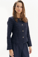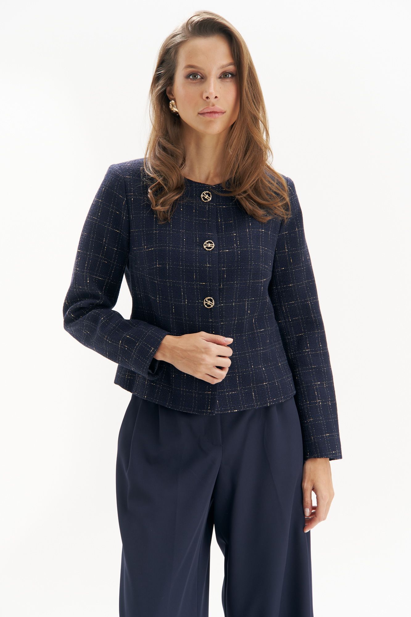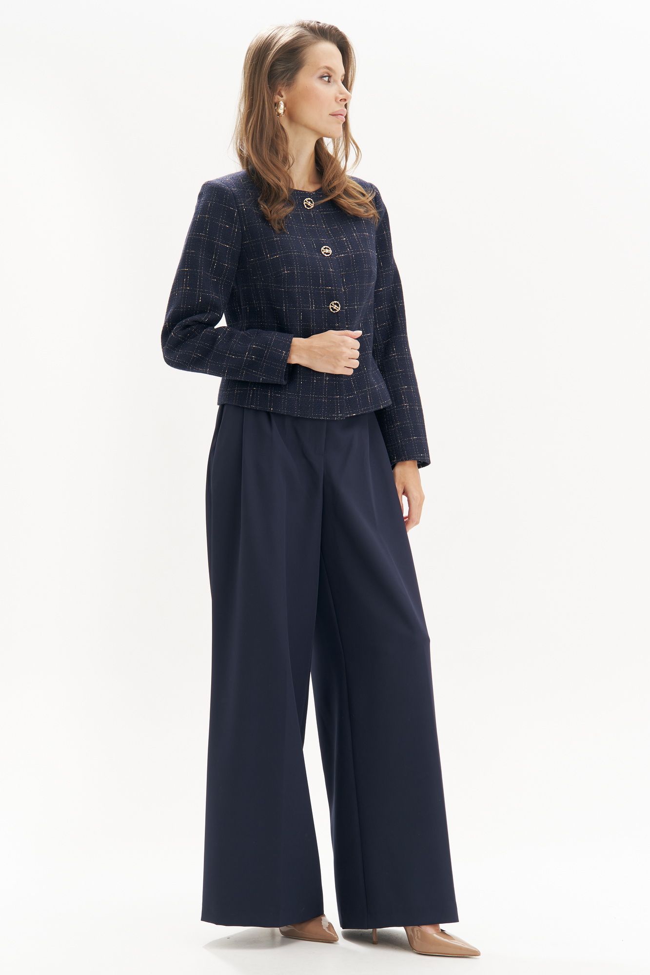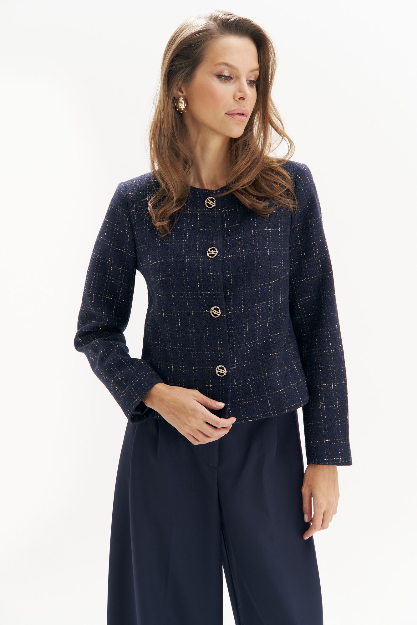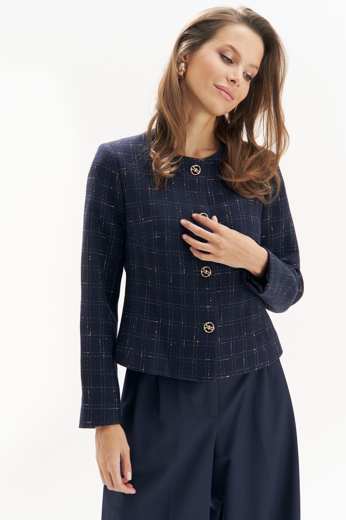 Элегантный твидовый жакет в глубоких синих тонах — воплощение утончённого стиля и современной женственности. Золотистая клетка придаёт изделию изысканности, а классический крой подчёркивает изящность фигуры. Этот жакет станет ключевым элементом вашего гардероба, подходящим как для офиса, так и для вечерних прогулок. Ощутите себя уверенной и стильной в любой ситуации! Жакет женский, выполнен из костюмной твидовой ткани, предназначен для повседневной носки. Жакет полуприлегающего силуэта, на подкладке, с центральной бортовой застежкой до верха на 4 петли и 4 пуговицы (размер и цвет фурнитуры может незначительно отличаться от фото). Перед с отрезными бочками, с нагрудными вытачками, идущими от бочков. Спинка со средним швом, с рельефными швами, идущими от пройм вниз. Рукава втачные, двухшовные, длинные. Горловина переда и спинки обтачная, округлой формы. Жакет с плечевыми накладками. Состав: полиэстер - 44%, хлопок - 34%, акрил - 20%, люрекс - 2% Состав подкладки: полиэстер - 55%, вискоза 45%. "42 размер Длина по среднему шву спинки - 50,0 см (±2,0 см), Ширина на уровне глубины проймы - 46,0 см (±1,0 см), Ширина на уровне линии талии - 41,0 см (±1,0 см), Длина рукава - 60,0 см (±1,0 см), Ширина рукава вверху - 16,0 см (±1,0 см), Ширина рукава по низу - 12,3 см (±0,5 см), Длина плеча - 11,2 см (±0,5 см). 44 размер Длина по среднему шву спинки - 50,0 см (±2,0 см), Ширина на уровне глубины проймы - 48,0 см (±1,0 см), Ширина на уровне линии талии - 43,0 см (±1,0 см), Длина рукава - 60,0 см (±1,0 см), Ширина рукава вверху - 17,0 см (±1,0 см), Ширина рукава по низу - 12,3 см (±0,5 см), Длина плеча - 11,2 см (±0,5 см). 46 размер Длина по среднему шву спинки - 50,0 см (±2,0 см), Ширина на уровне глубины проймы - 50,0 см (±1,0 см), Ширина на уровне линии талии - 46,0 см (±1,0 см), Длина рукава - 60,0 см (±1,0 см), Ширина рукава вверху - 17,0 см (±1,0 см), Ширина рукава по низу - 13,0 см (±0,5 см), Длина плеча - 11,3 см (±0,5 см). 48 размер Длина по среднему шву спинки - 50,0 см (±2,0 см), Ширина на уровне глубины проймы - 52,0 см (±1,0 см), Ширина на уровне линии талии - 48,0 см (±1,0 см), Длина рукава - 60,0 см (±1,0 см), Ширина рукава вверху - 18,0 см (±1,0 см), Ширина рукава по низу - 13,0 см (±0,5 см), Длина плеча - 11,3 см (±0,5 см). 50 размер Длина по среднему шву спинки - 51,5 см (±2,0 см), Ширина на уровне глубины проймы - 54,0 см (±1,0 см), Ширина на уровне линии талии - 50,0 см (±1,0 см), Длина рукава - 60,5 см (±1,0 см), Ширина рукава вверху - 19,5 см (±1,0 см), Ширина рукава по низу - 14,0 см (±0,5 см), Длина плеча - 11,7 см (±0,5 см). 52 размер Длина по среднему шву спинки - 51,5 см (±2,0 см), Ширина на уровне глубины проймы - 56,0 см (±1,0 см), Ширина на уровне линии талии - 52,0 см (±1,0 см), Длина рукава - 60,5 см (±1,0 см), Ширина рукава вверху - 20,5 см (±1,0 см), Ширина рукава по низу - 14,0 см (±0,5 см), Длина плеча - 11,7 см (±0,5 см). 54 размер Длина по среднему шву спинки - 52,0 см (±2,0 см), Ширина на уровне глубины проймы - 58,0 см (±1,0 см), Ширина на уровне линии талии - 55,5 см (±1,0 см), Длина рукава - 60,5 см (±1,0 см), Ширина рукава вверху - 20,5 см (±1,0 см), Ширина рукава по низу - 14,5 см (±0,5 см), Длина плеча - 12,2см (±0,5 см). 56 размер Длина по среднему шву спинки - 52,0 см (±2,0 см), Ширина на уровне глубины проймы - 60,0 см (±1,0 см), Ширина на уровне линии талии - 57,5 см (±1,0 см), Длина рукава - 60,5 см (±1,0 см), Ширина рукава вверху - 21,5 см (±1,0 см), Ширина рукава по низу - 14,5 см (±0,5 см), Длина плеча - 12,2см (±0,5 см)."