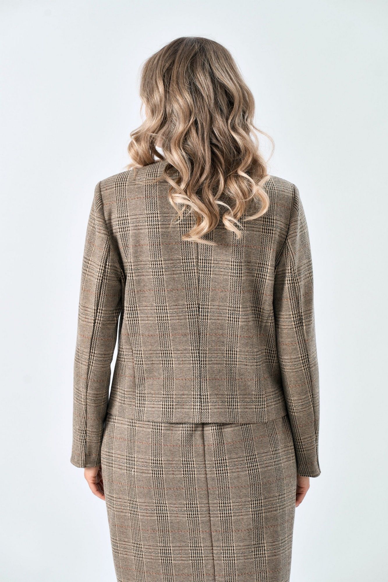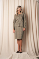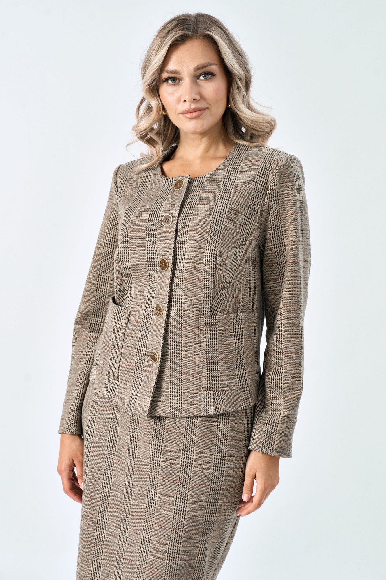 Комплект трикотажный состоящий из жакета и юбки. Жакет прямого силуэта, без подкладки с застёжкой на петли пуговицы. По переду накладные карманы. Юбка на подкладке, с высокой талией. Заднее полотнище со средним швом, застегивается на потайную молнию. Шов переходит книзу в шлицу.