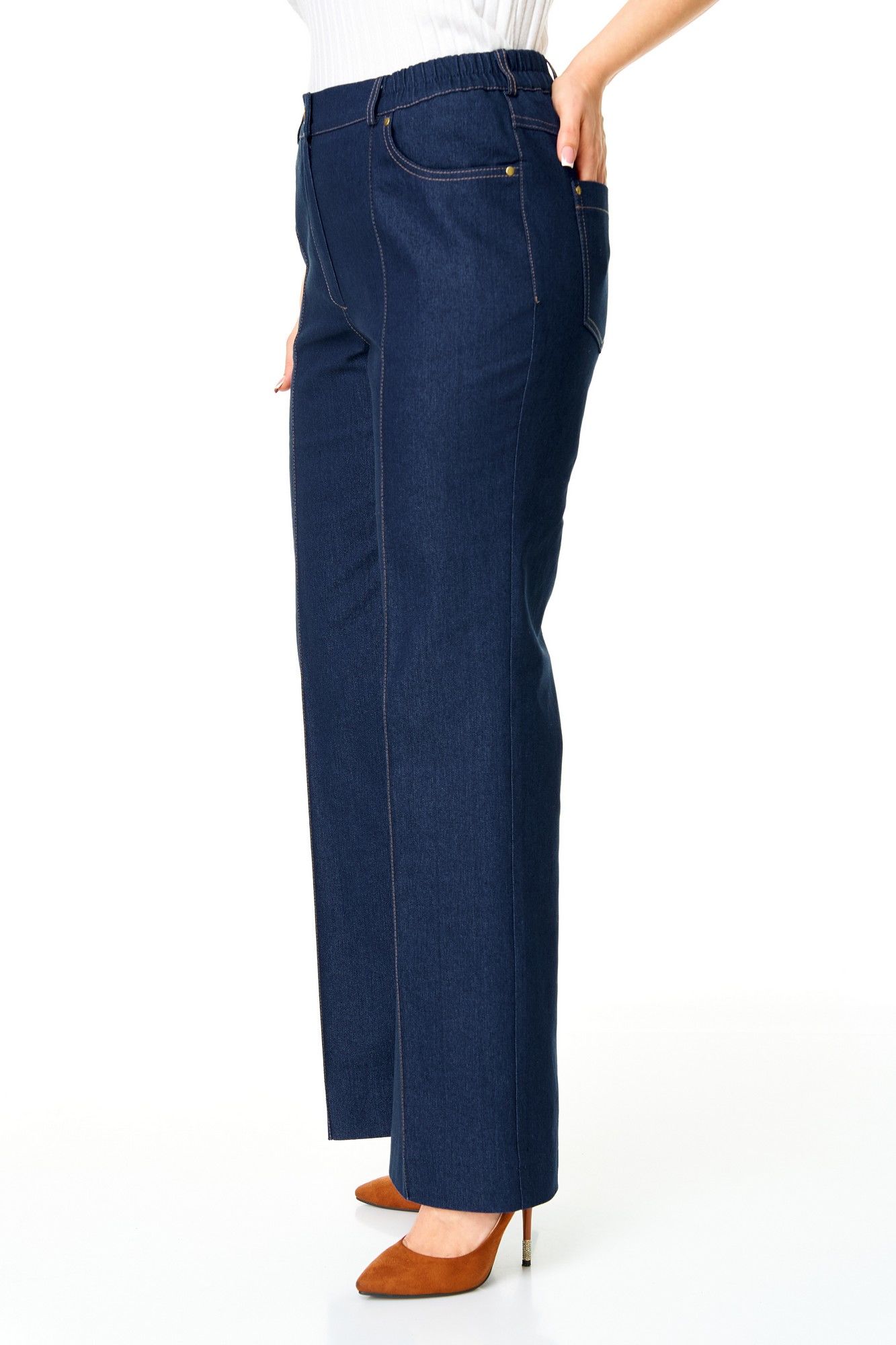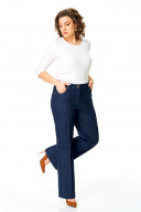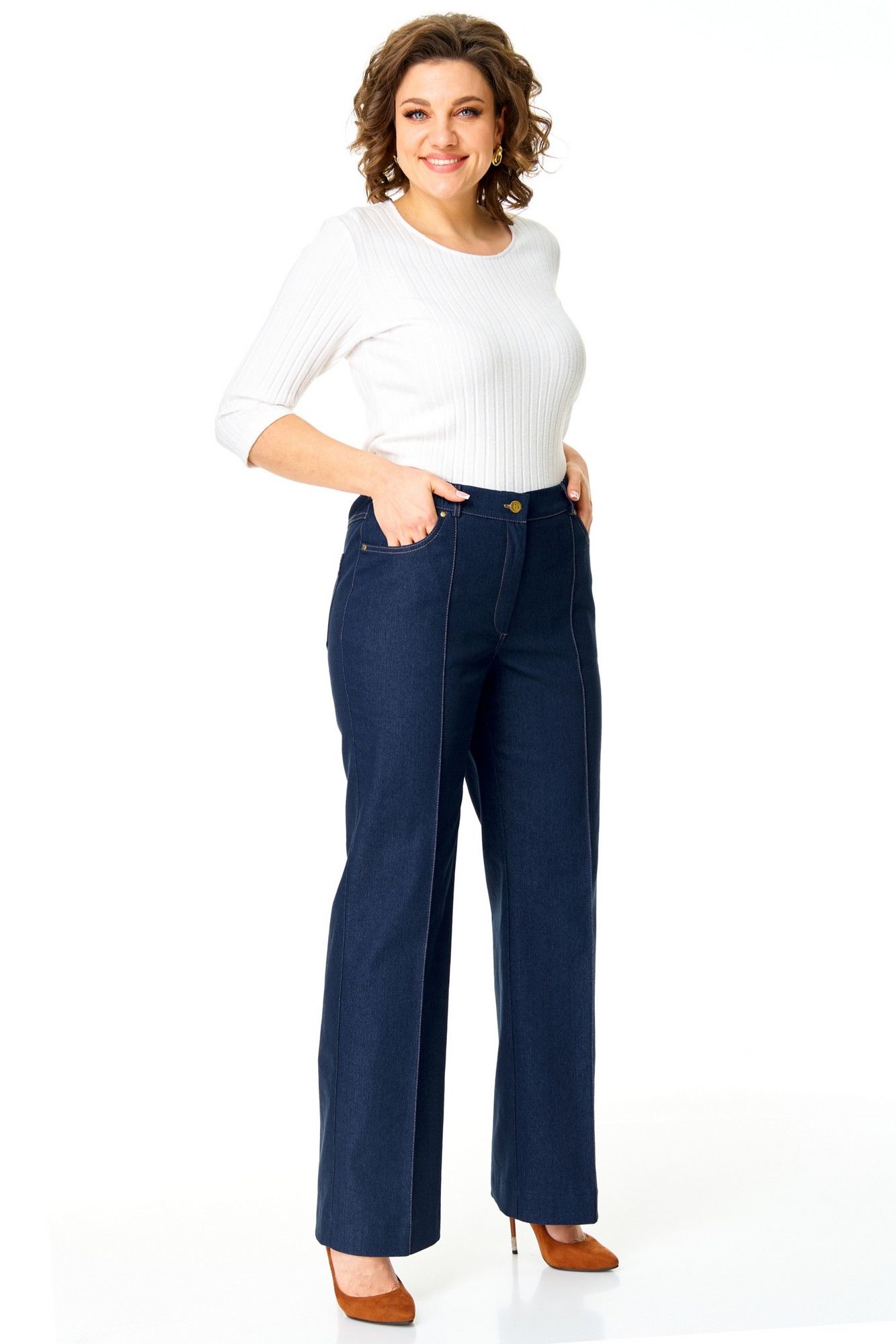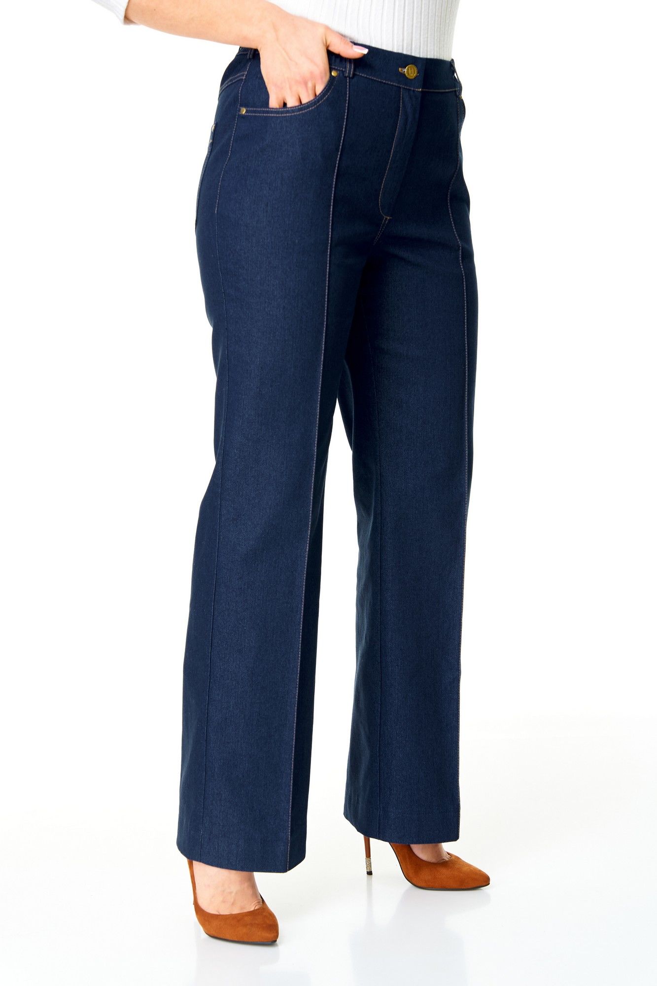 Брюки прямого силуэта с центральной застёжкой на молнию и петлю-пуговицу. По передним половинкам застрочены канты.В боковых швах карманы с отрезным бочком.Задние половинки с отрезными кокетками и накладными карманами. Застежка спереди на молнию и пуговицу. Пояс притачной с резинками по бокам. Отделочные строчки контрастного цвета
