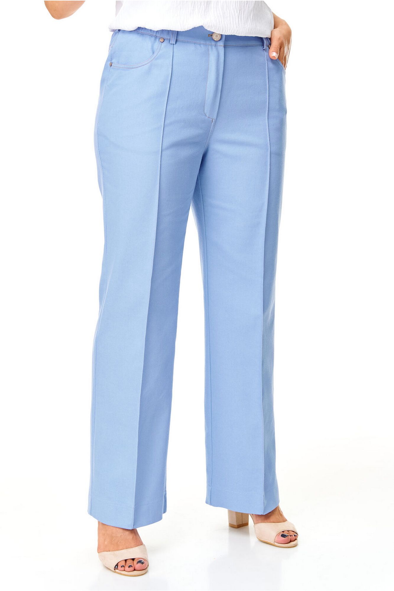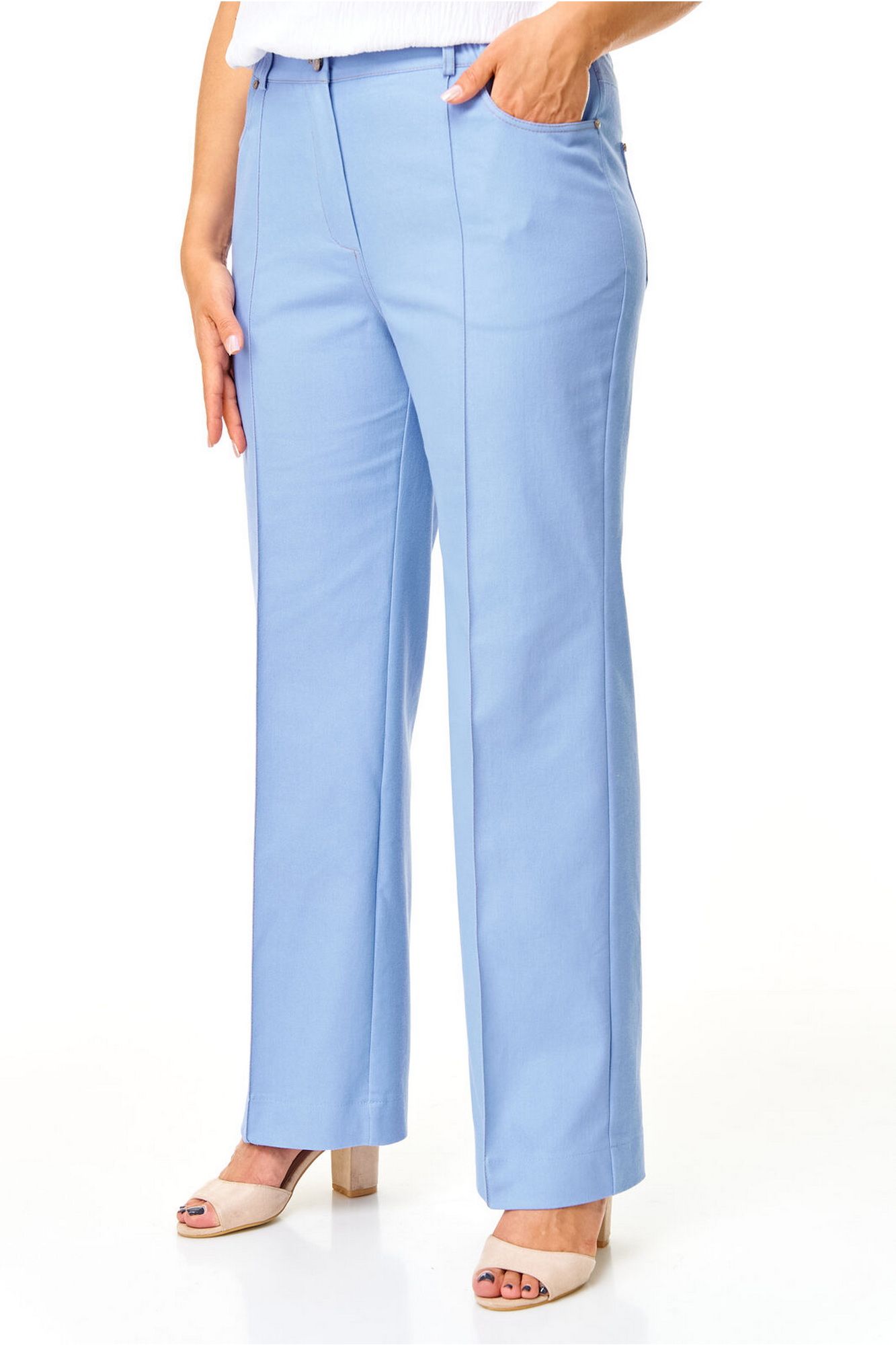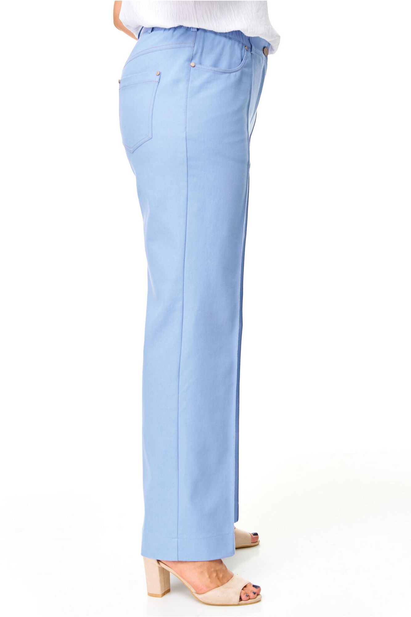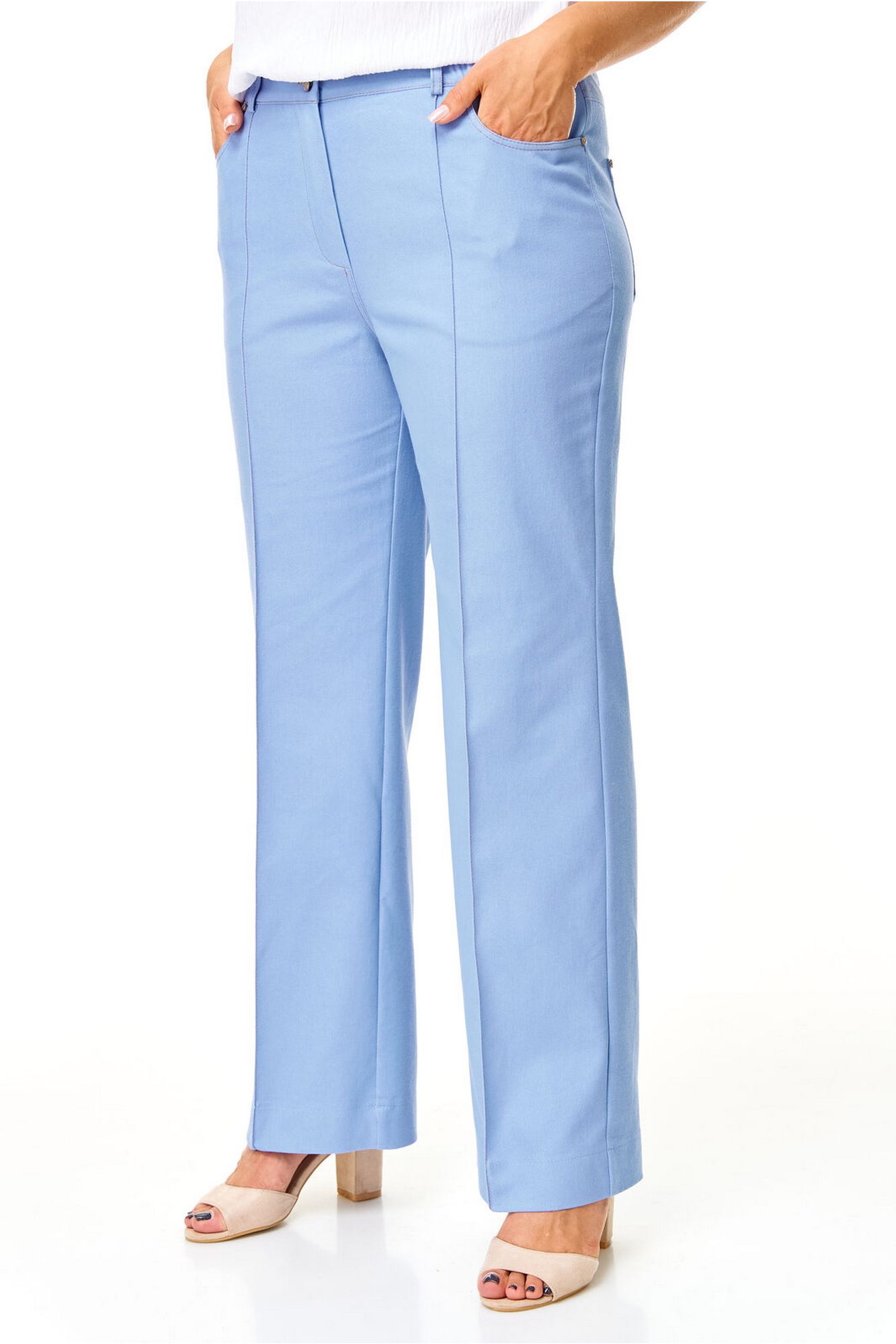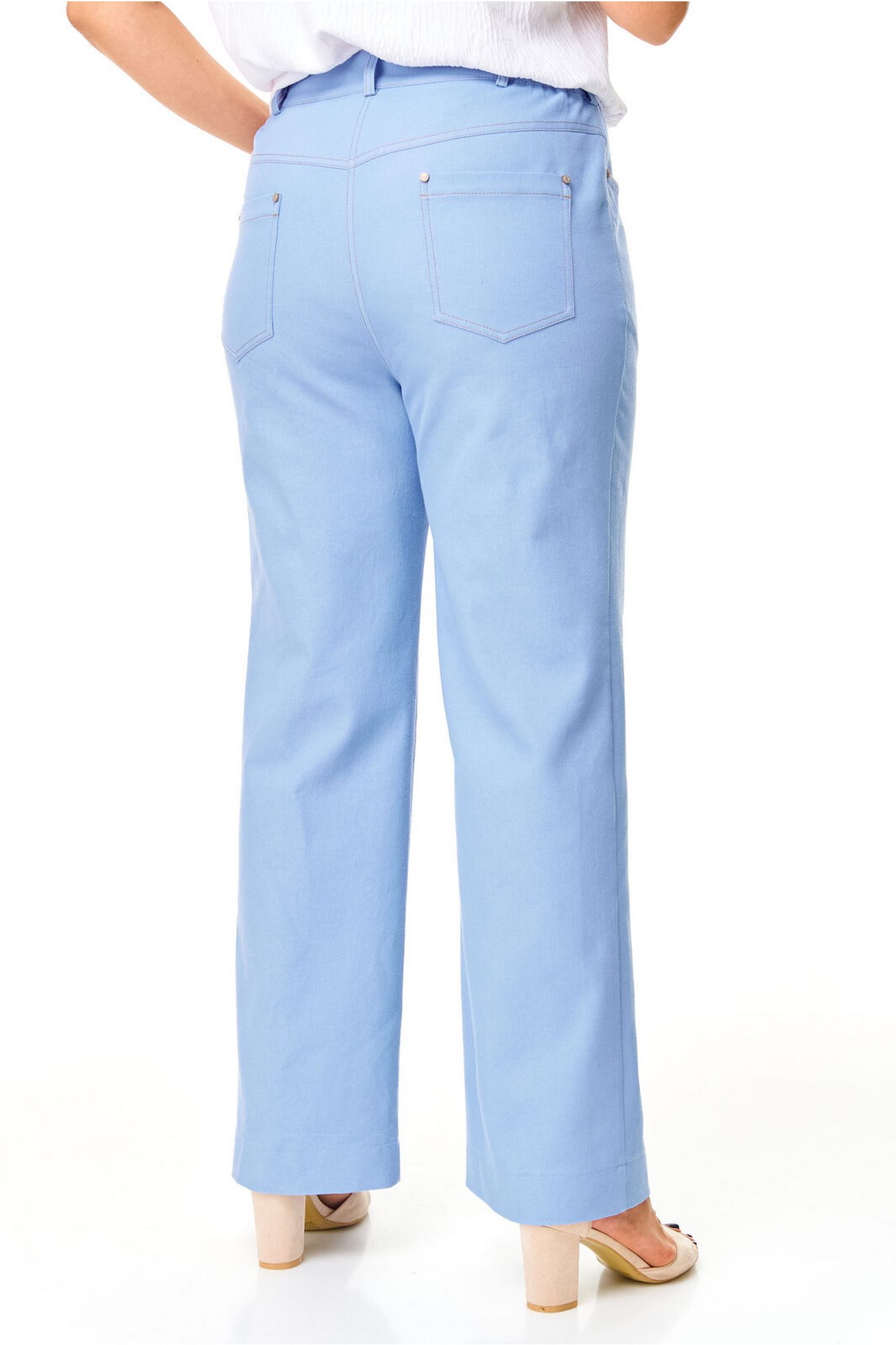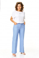 Брюки прямого силуэта с центральной застёжкой на молнию и петлю-пуговицу. По передним половинкам застрочены канты.В боковых швах карманы с отрезным бочком.Задние половинки с отрезными кокетками и накладными карманами. Застежка спереди на молнию и пуговицу. Пояс притачной с резинками по бокам. Отделочные строчки контрастного цвета
