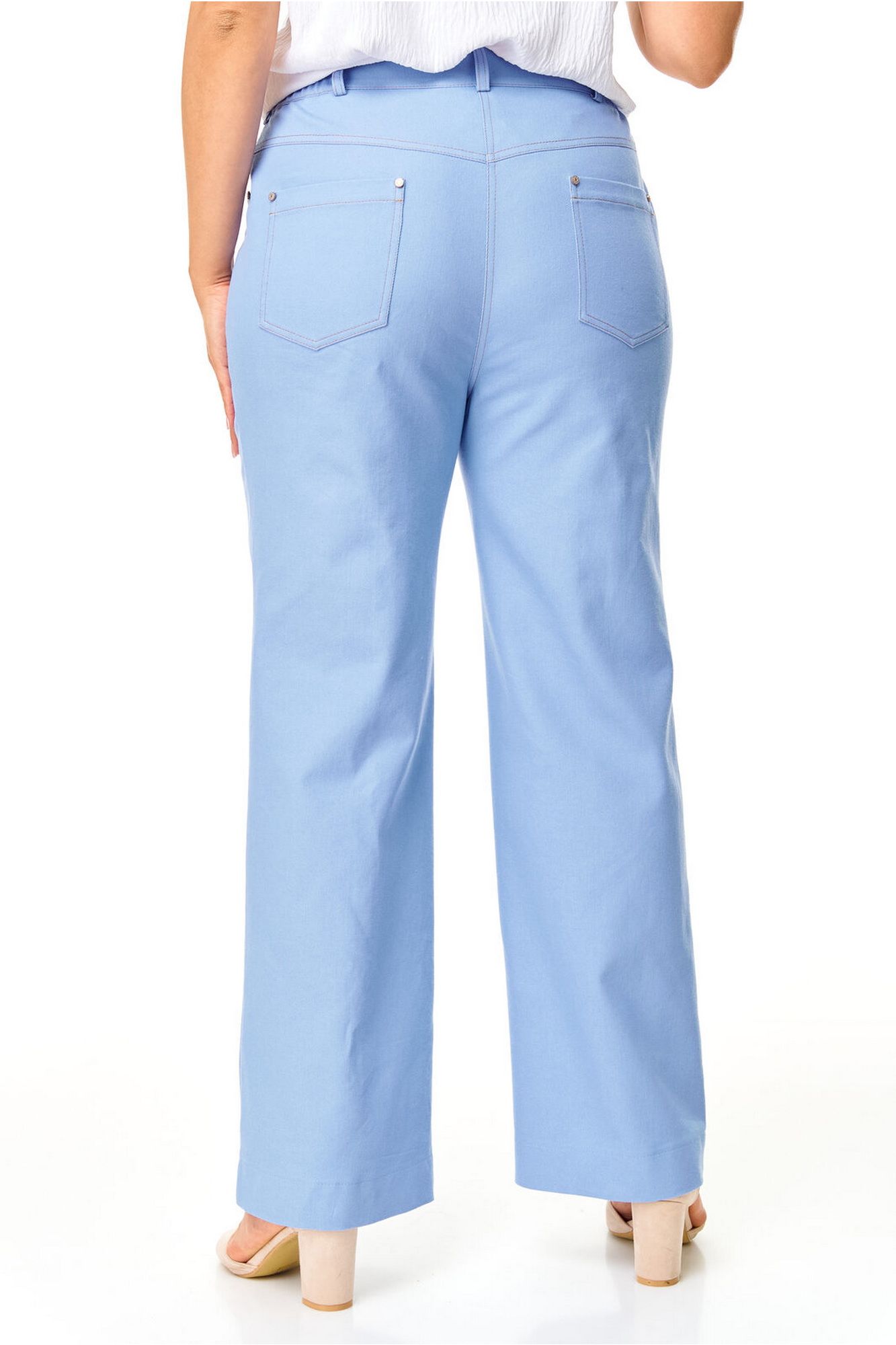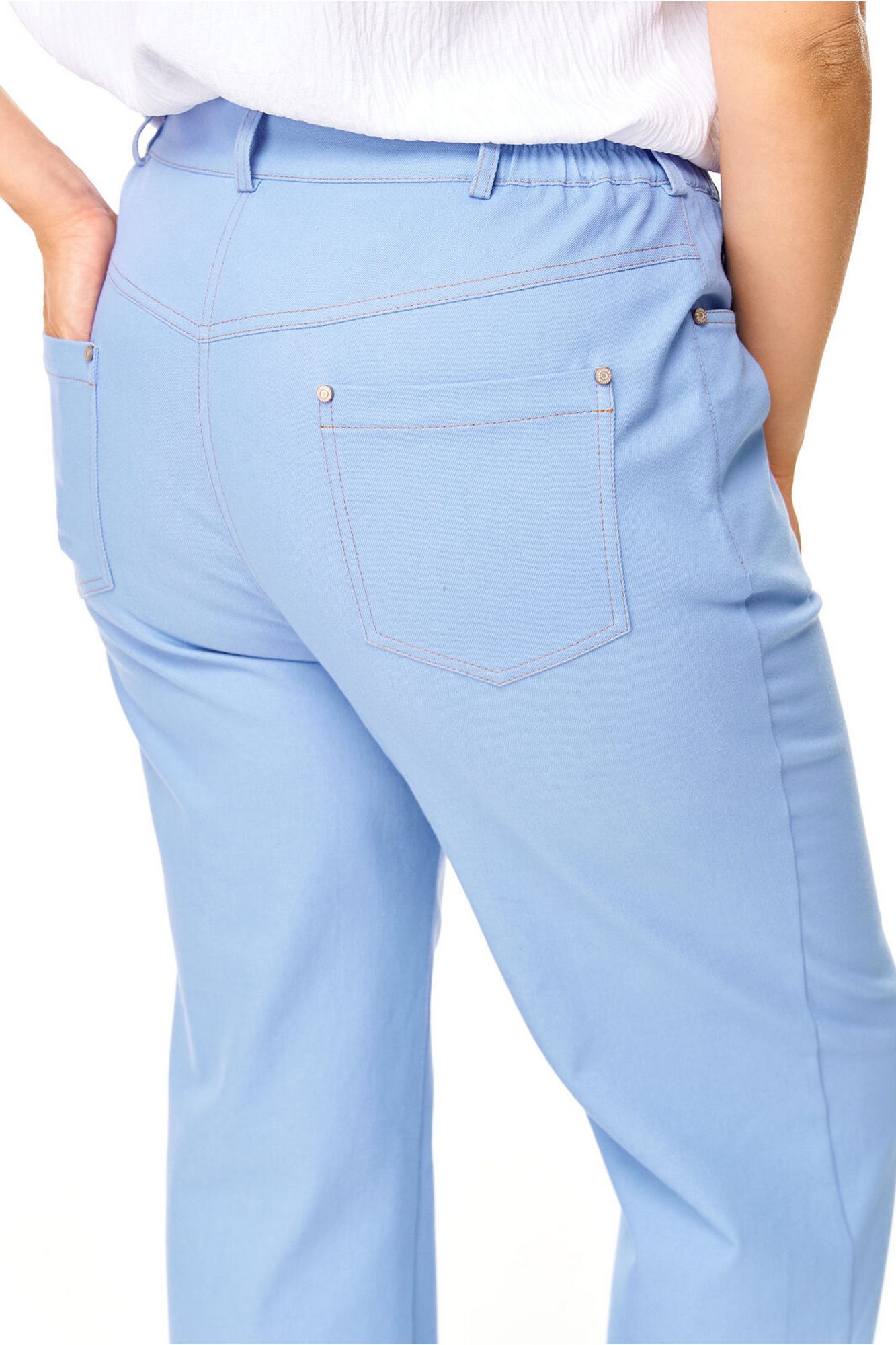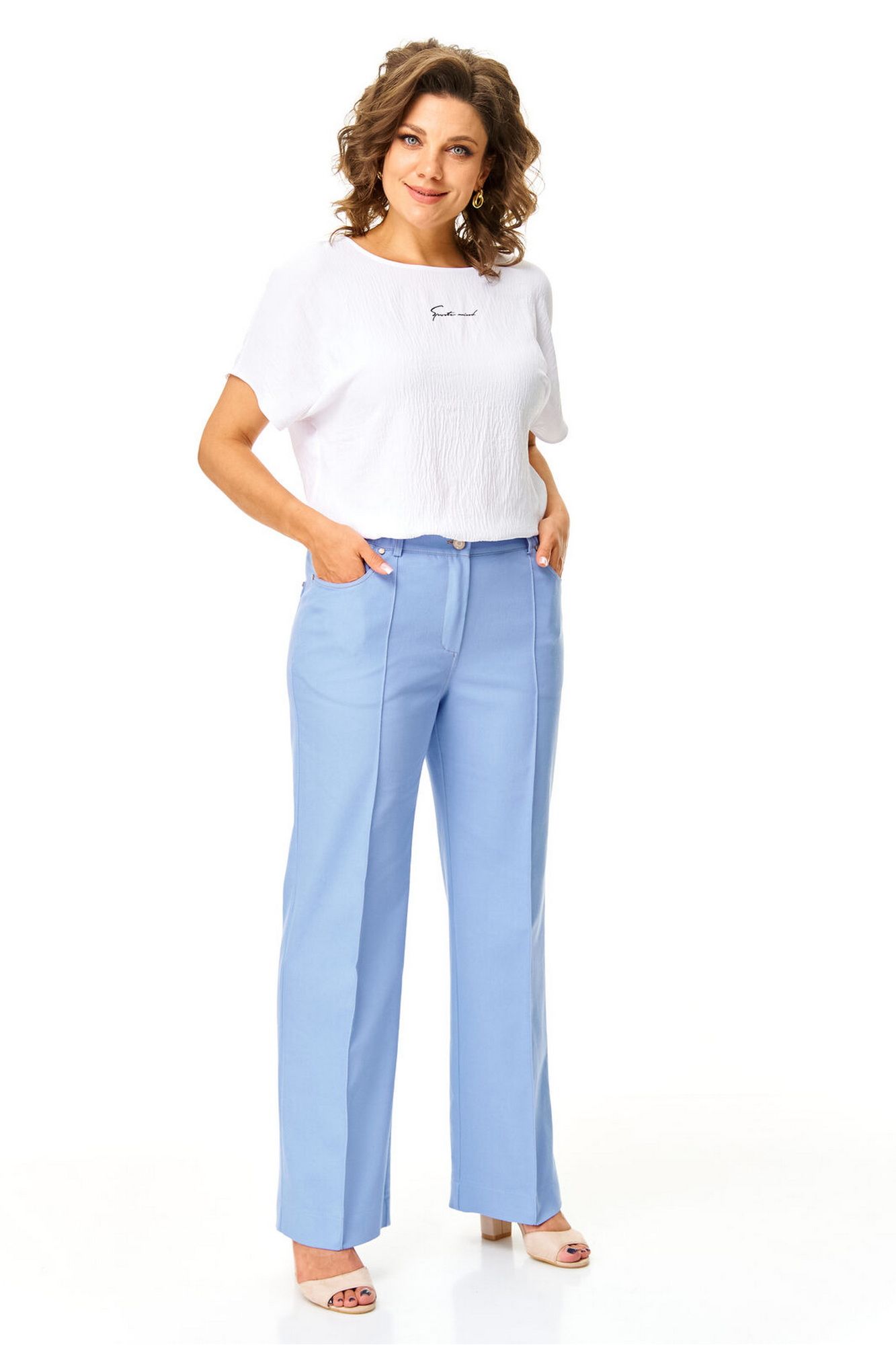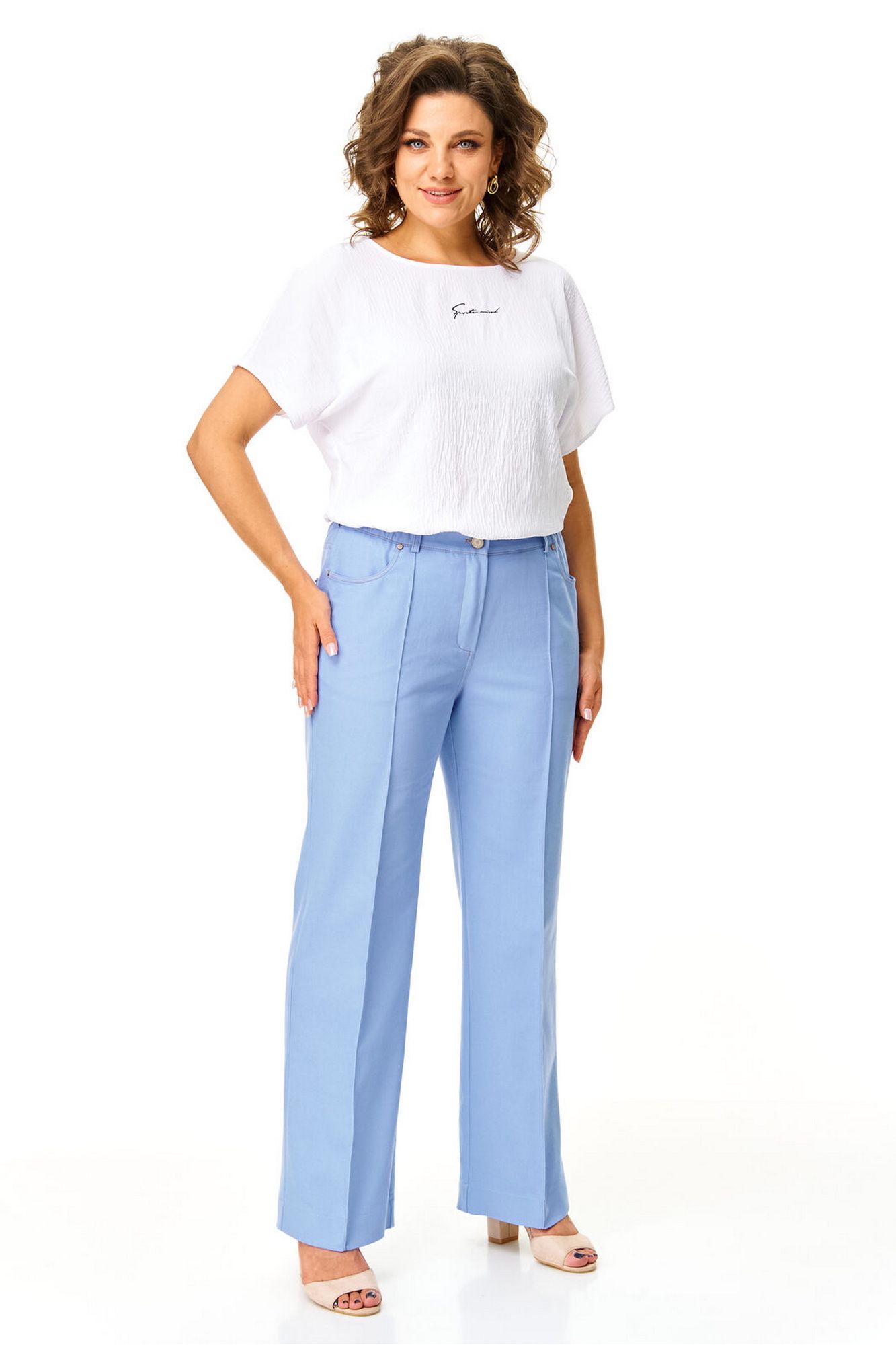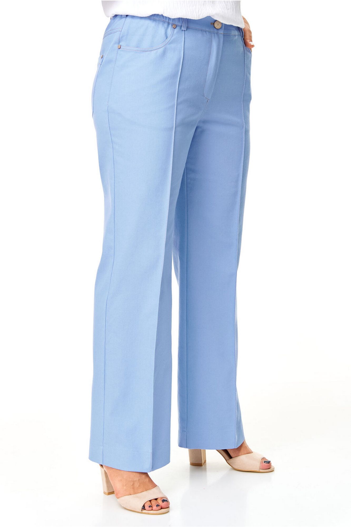Брюки прямого силуэта с центральной застёжкой на молнию и петлю-пуговицу. По передним половинкам застрочены канты.В боковых швах карманы с отрезным бочком.Задние половинки с отрезными кокетками и накладными карманами. Застежка спереди на молнию и пуговицу. Пояс притачной с резинками по бокам. Отделочные строчки контрастного цвета