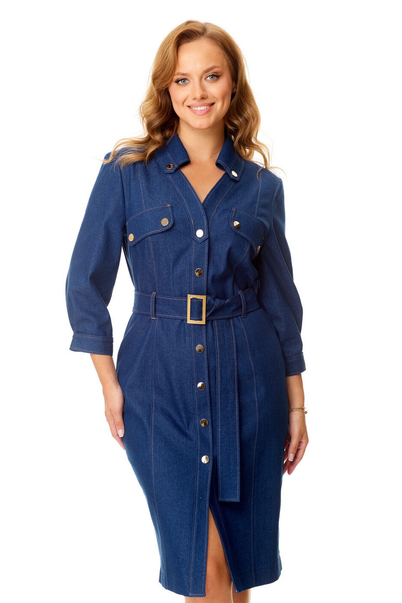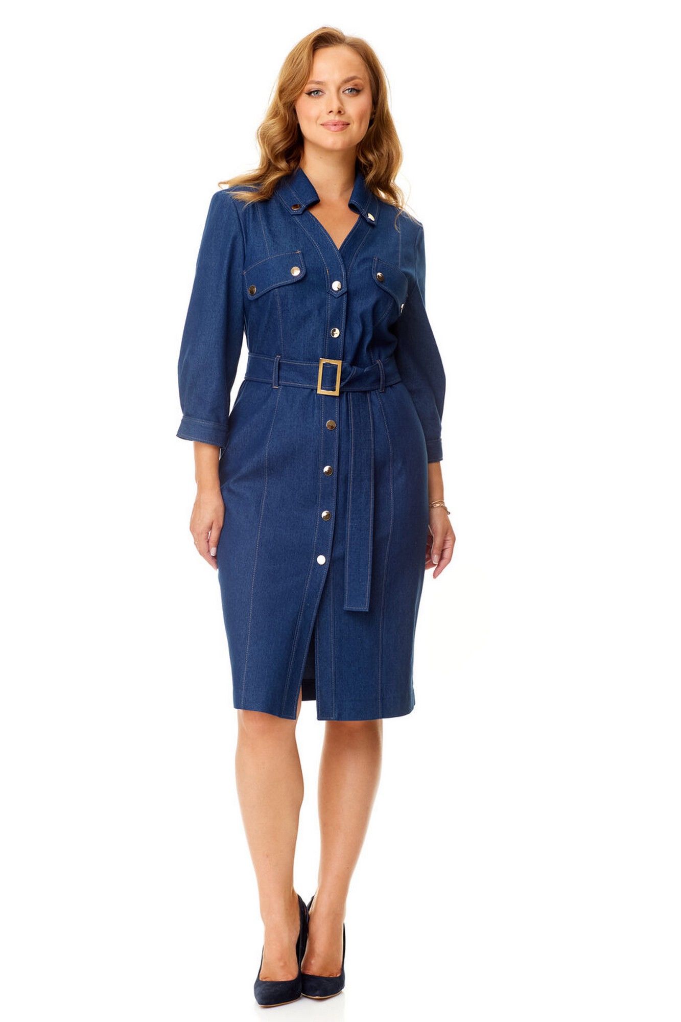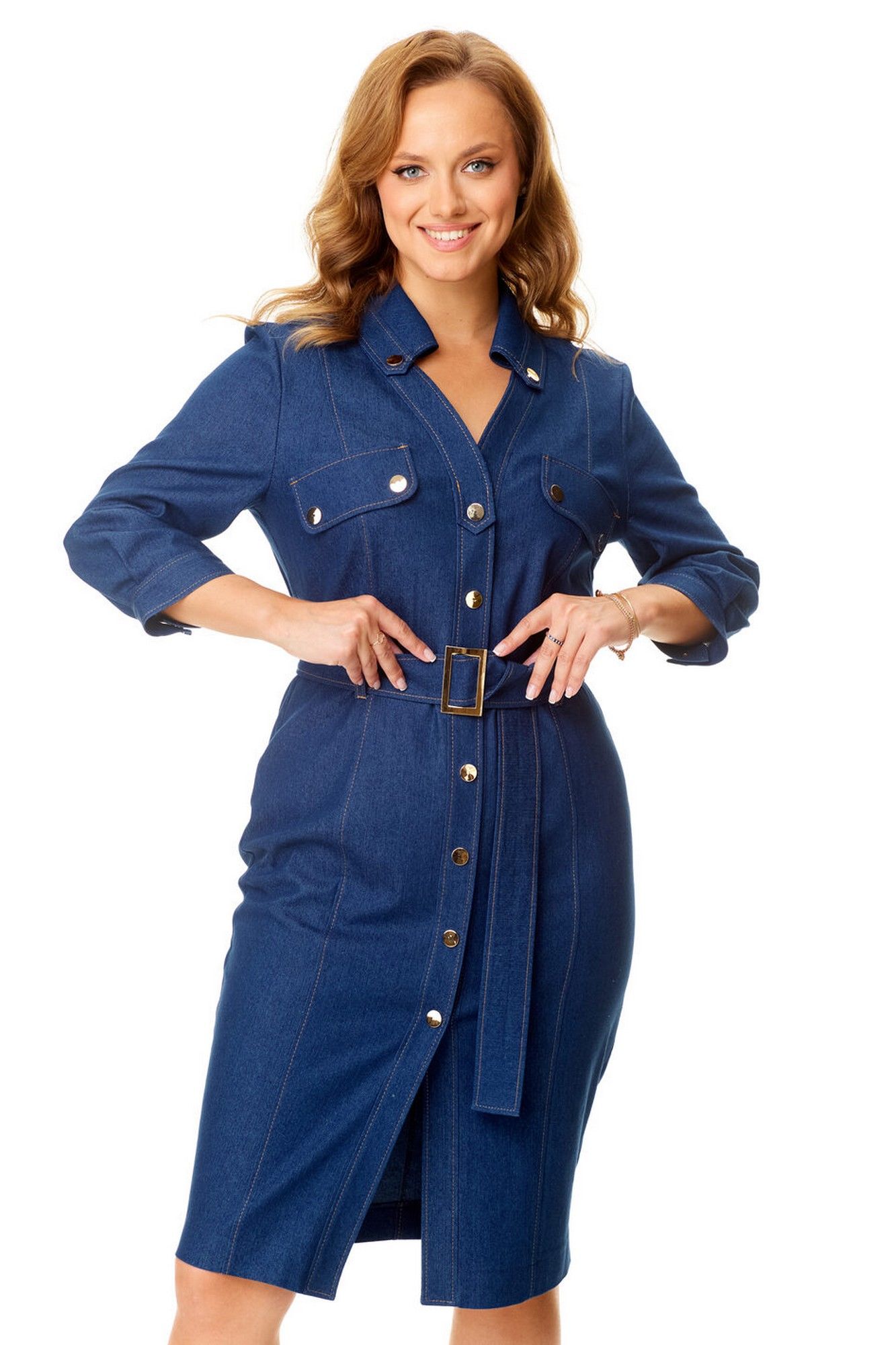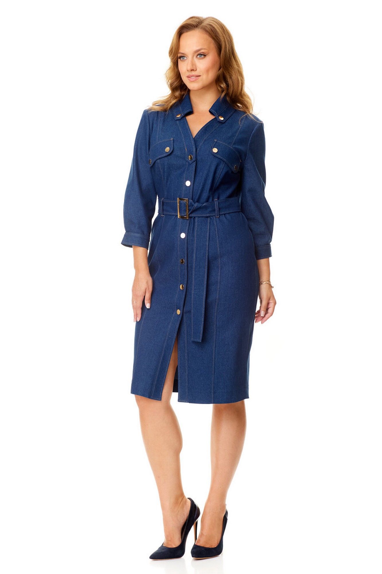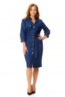Платье женское полуприталенного силуэта зауженное книзу. Центральная бортовая застёжка с планкой на кнопки. Полочка и спинка с рельефами и отделочными строчками. Полочка с накладными клапанами с застёжкой на кнопки. Воротник на отрезной стойке блузочного типа. Отлет воротника обработан планкой с застёжкой на кнопки. Рукав втачной одношовный. Низ рукава с манжетой и складками. Манжета с застёжкой на кнопку. Имеется навесной пояс с отделочной пряжкой. Для поддержания пояса имеются шлёвки.