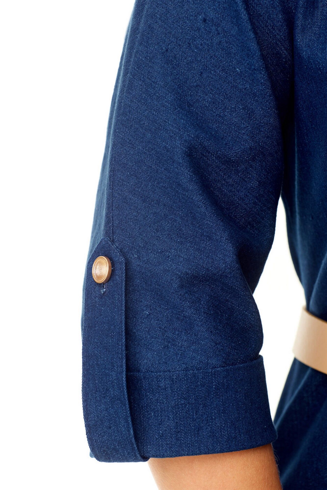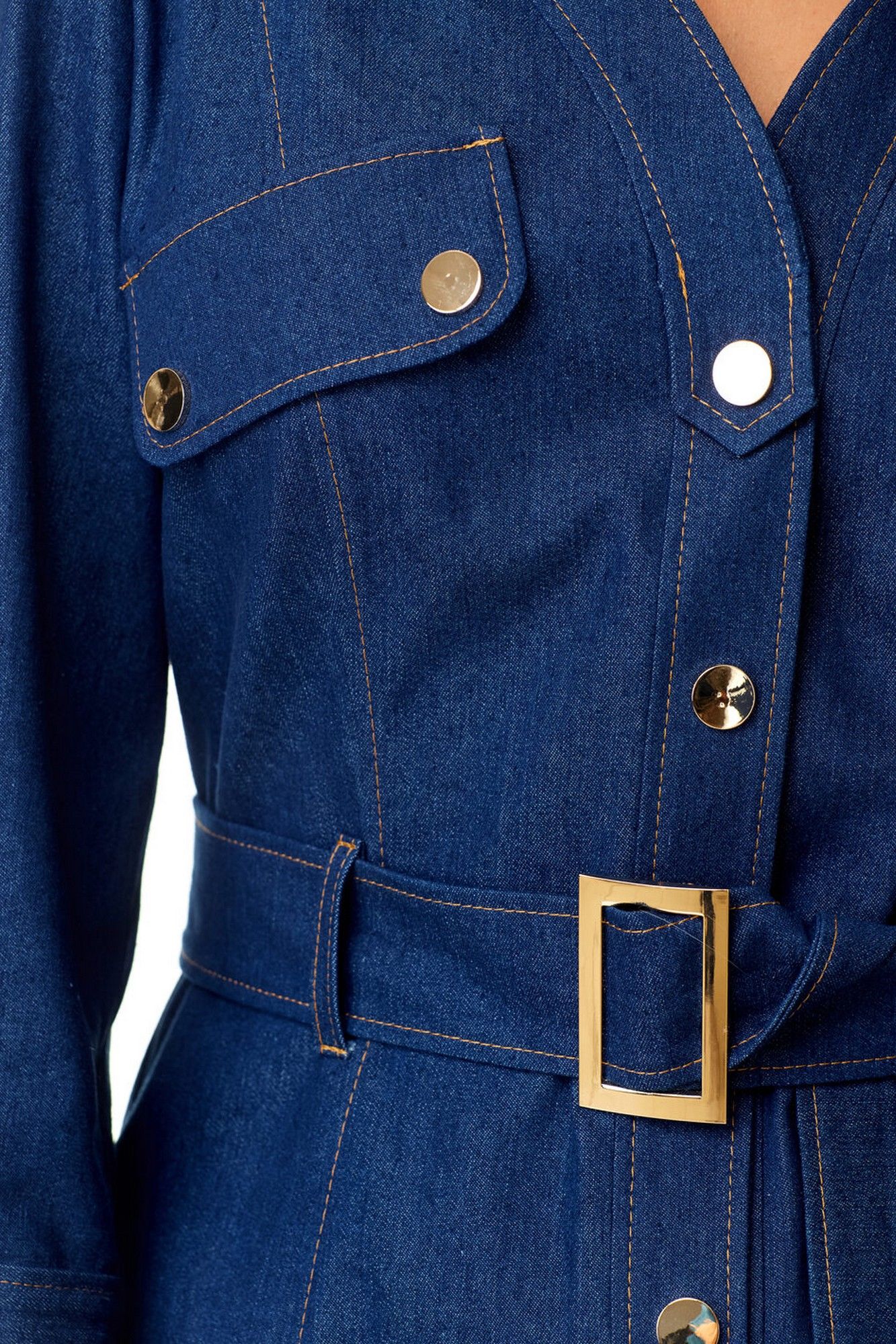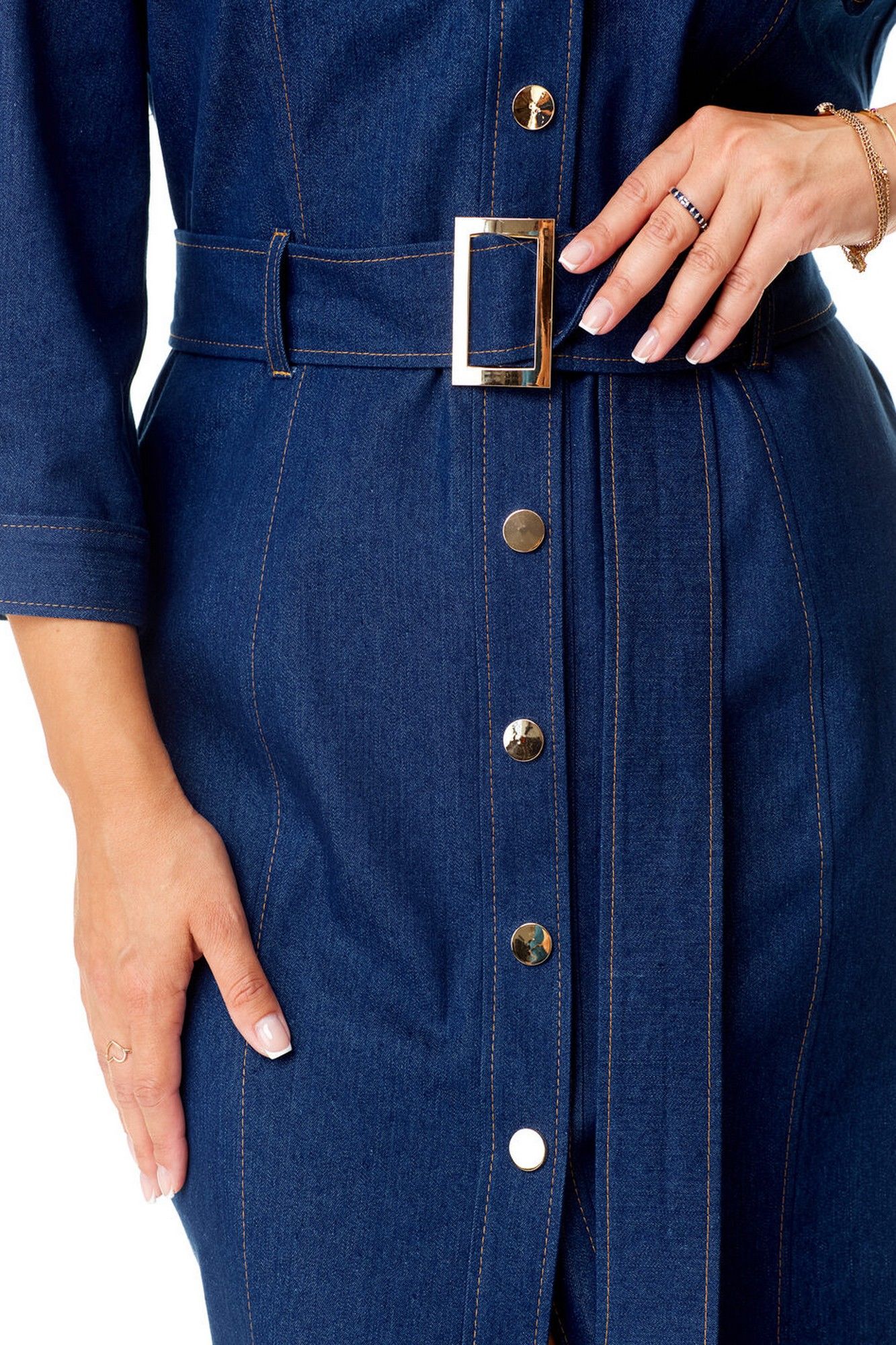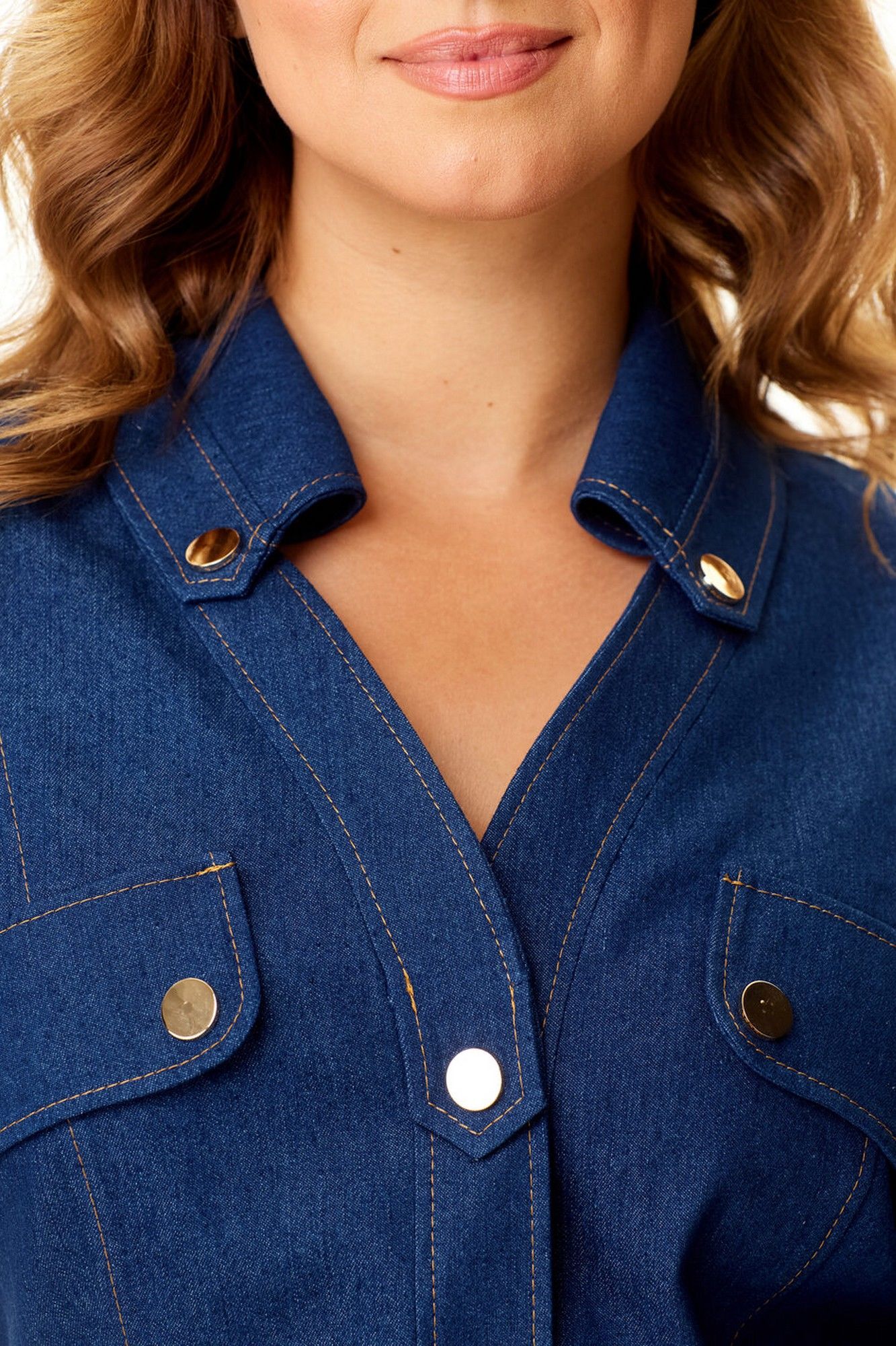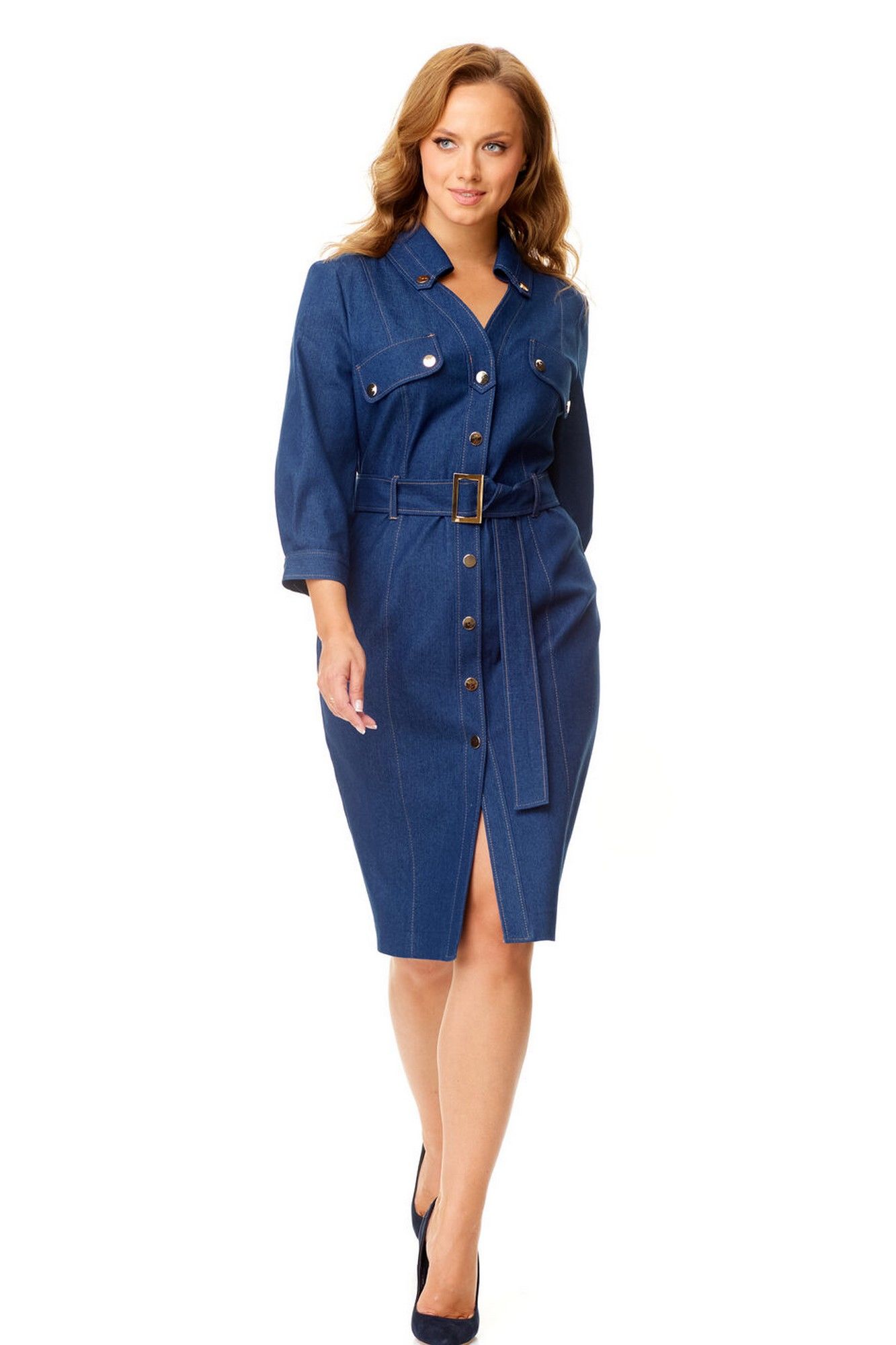 Платье женское полуприталенного силуэта зауженное книзу. Центральная бортовая застёжка с планкой на кнопки. Полочка и спинка с рельефами и отделочными строчками. Полочка с накладными клапанами с застёжкой на кнопки. Воротник на отрезной стойке блузочного типа. Отлет воротника обработан планкой с застёжкой на кнопки. Рукав втачной одношовный. Низ рукава с манжетой и складками. Манжета с застёжкой на кнопку. Имеется навесной пояс с отделочной пряжкой. Для поддержания пояса имеются шлёвки.