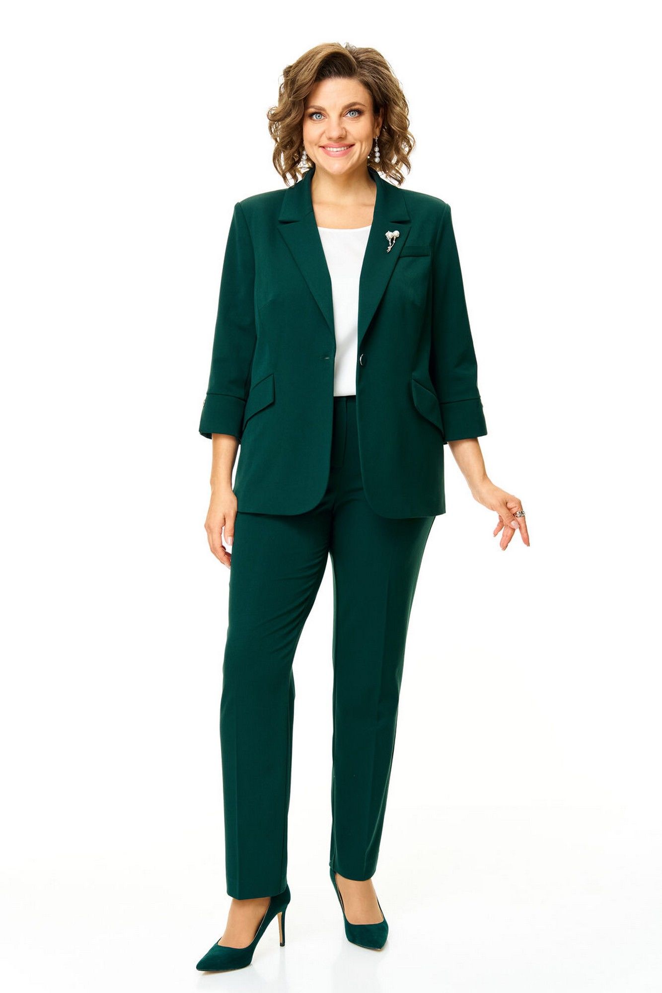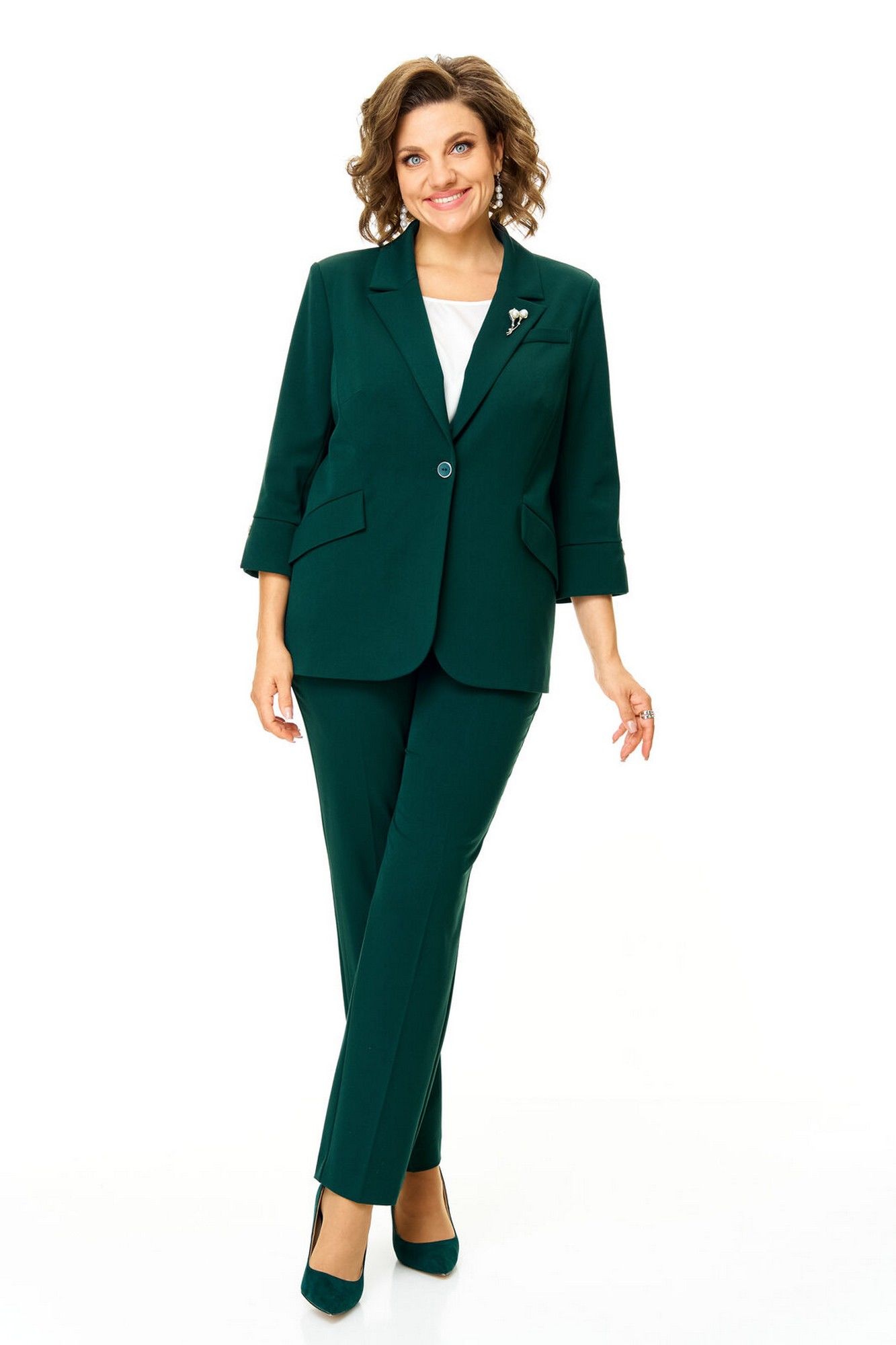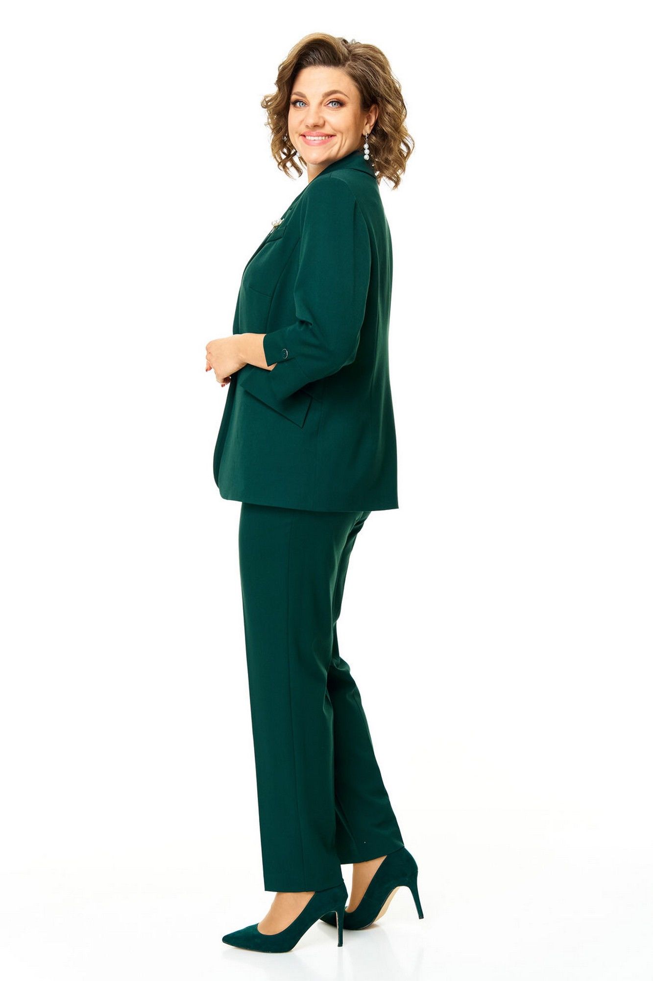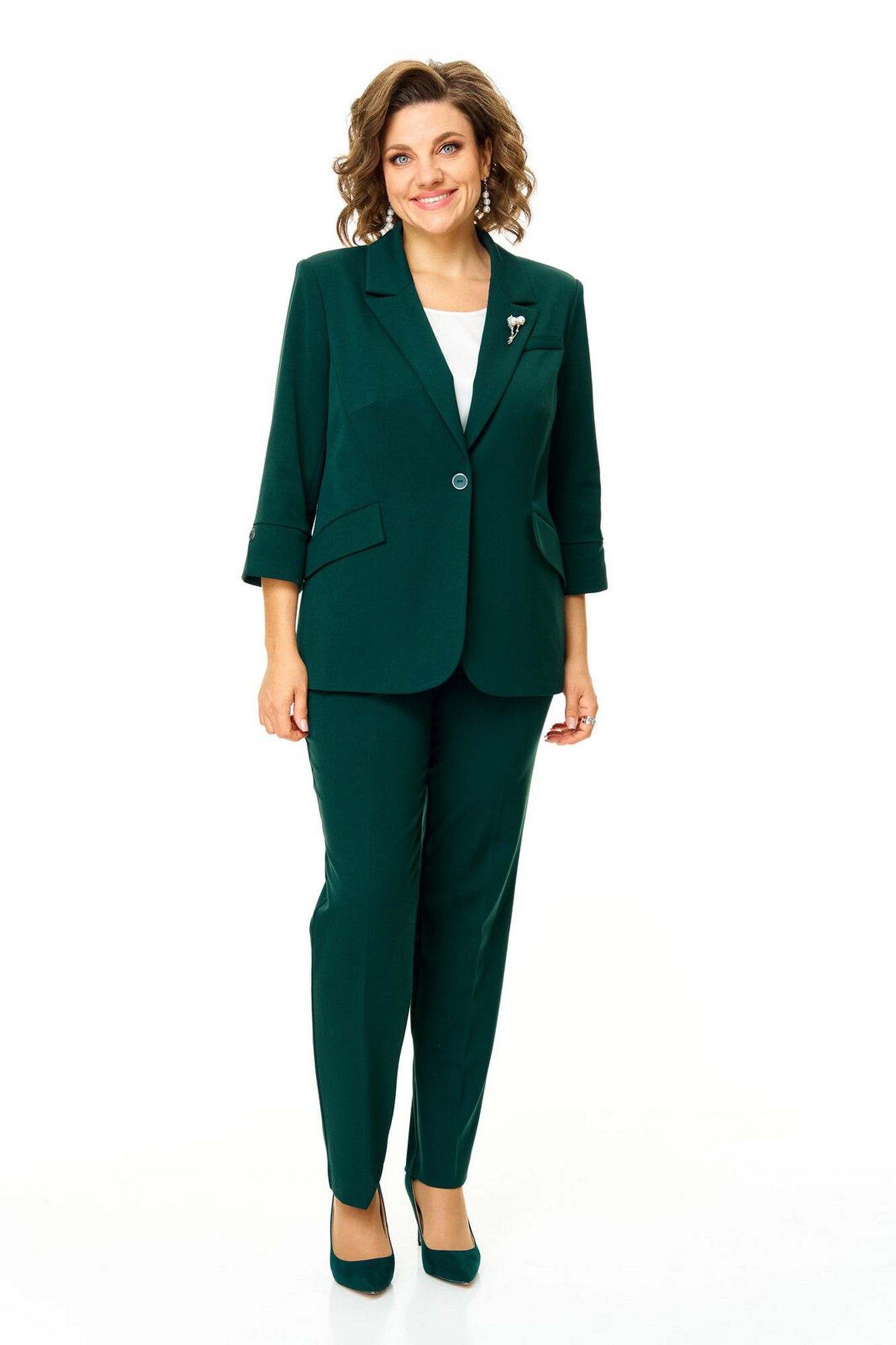 Костюм женский состоит из жакета и брюк.Жакет полуприлегающего покроя с естественной линией плеча на подкладке.Застежка однобортная на петлю-пуговицу.Спинка со средним швом и талиевыми вытачками.Перед с рельефами из проймы и небольшой нагрудной вытачкой.По переду, в подрезах, обработаны карманы с клапаном.Низ борта округлой формы.Воротник пиджачного типа.Рукав длиной 3/4 с авторской манжетой по низу.Брюки зауженные к низу, с центральной застёжкой на молнию и петлю-пуговицу.В боковых швах карманы с отрезным бочком.Пояс притачной с резинкой по бокам.В комплект входит съёмная металлическая брошь.