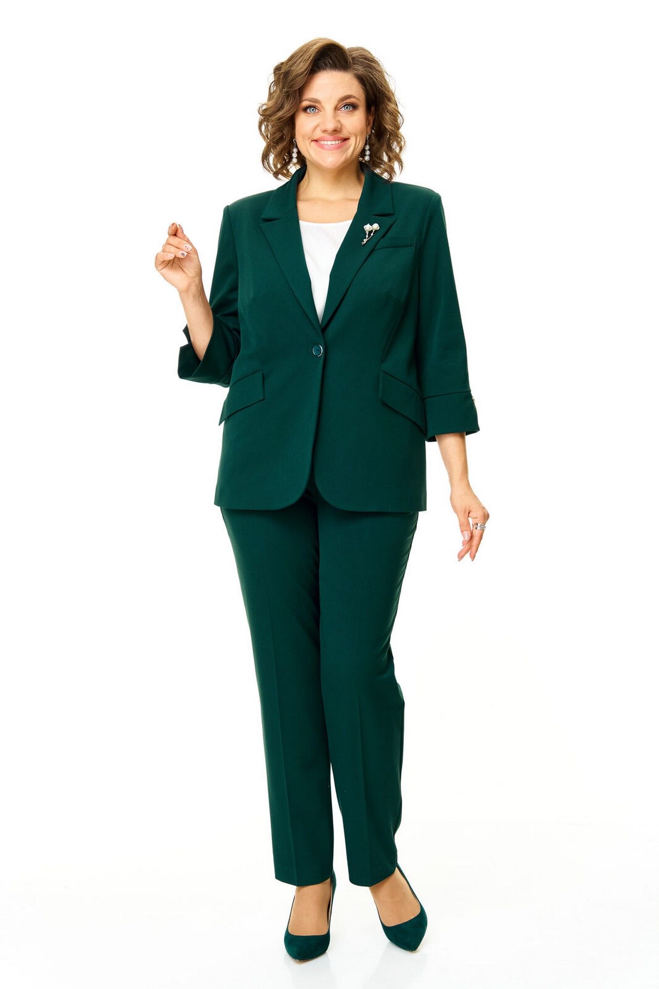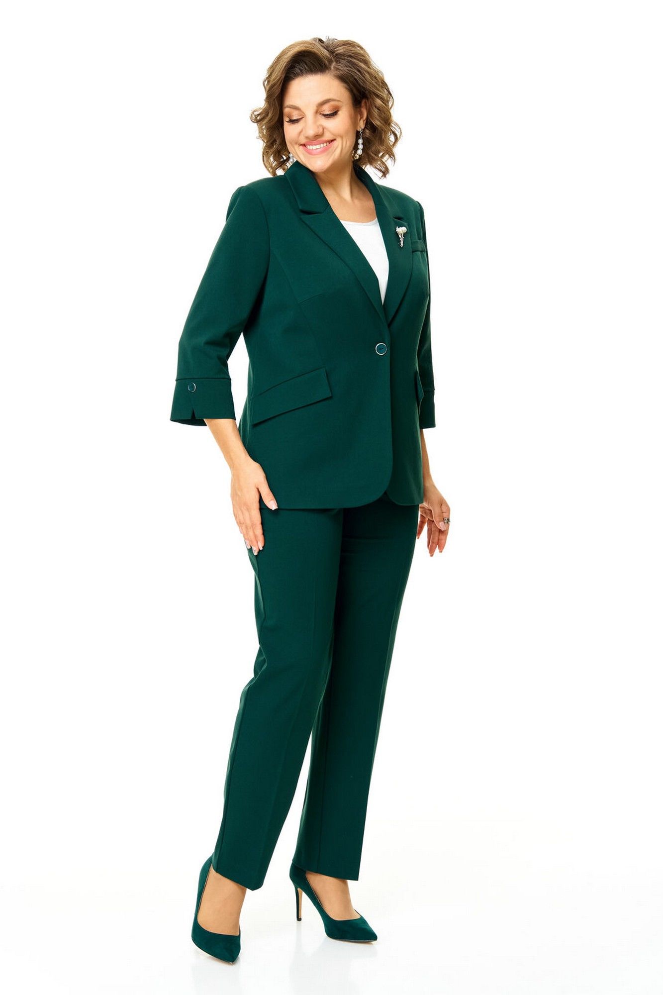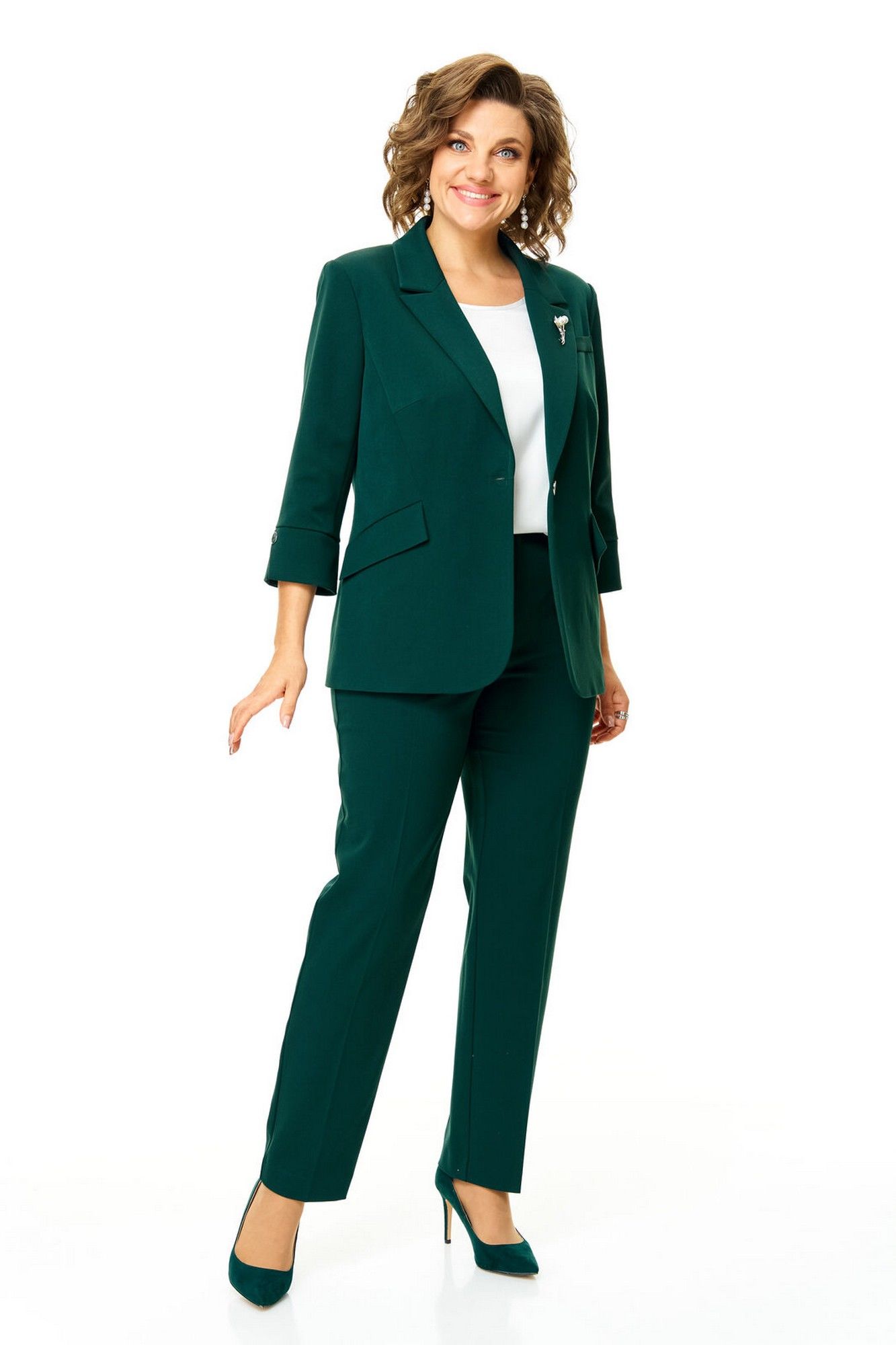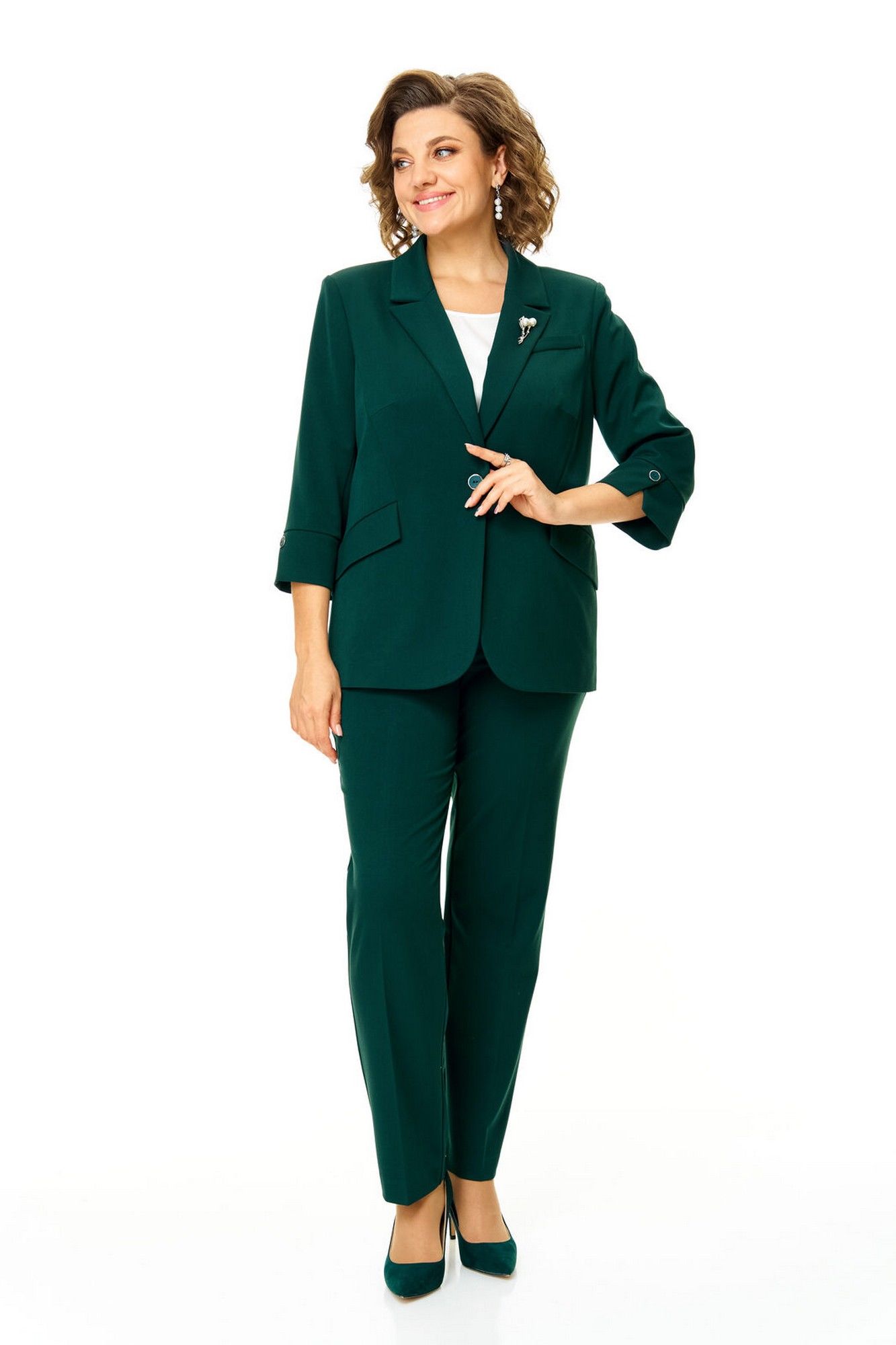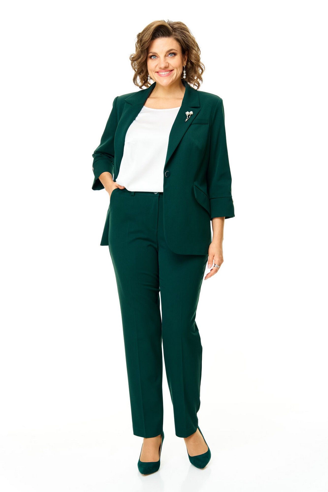 Костюм женский состоит из жакета и брюк.Жакет полуприлегающего покроя с естественной линией плеча на подкладке.Застежка однобортная на петлю-пуговицу.Спинка со средним швом и талиевыми вытачками.Перед с рельефами из проймы и небольшой нагрудной вытачкой.По переду, в подрезах, обработаны карманы с клапаном.Низ борта округлой формы.Воротник пиджачного типа.Рукав длиной 3/4 с авторской манжетой по низу.Брюки зауженные к низу, с центральной застёжкой на молнию и петлю-пуговицу.В боковых швах карманы с отрезным бочком.Пояс притачной с резинкой по бокам.В комплект входит съёмная металлическая брошь.