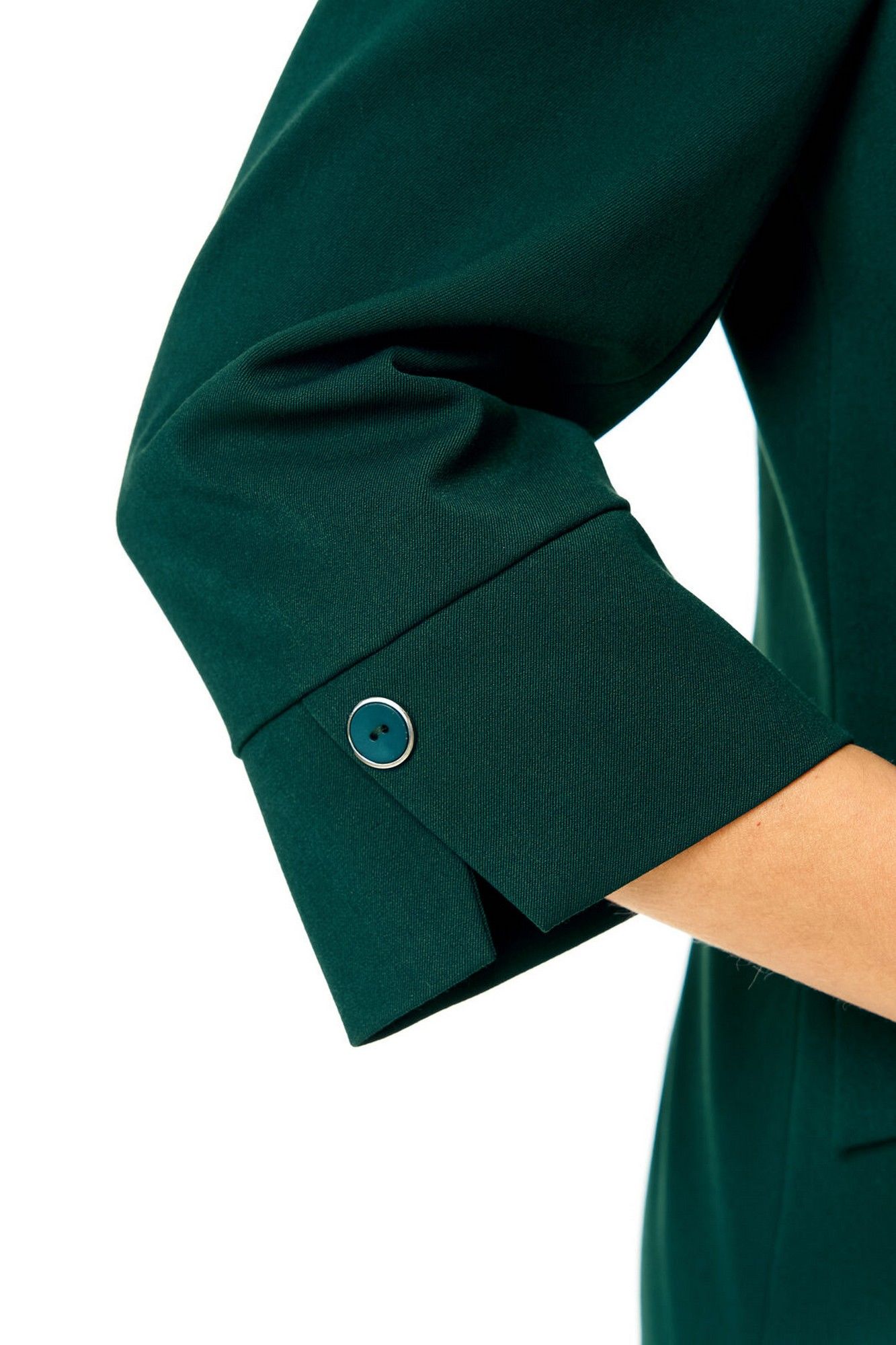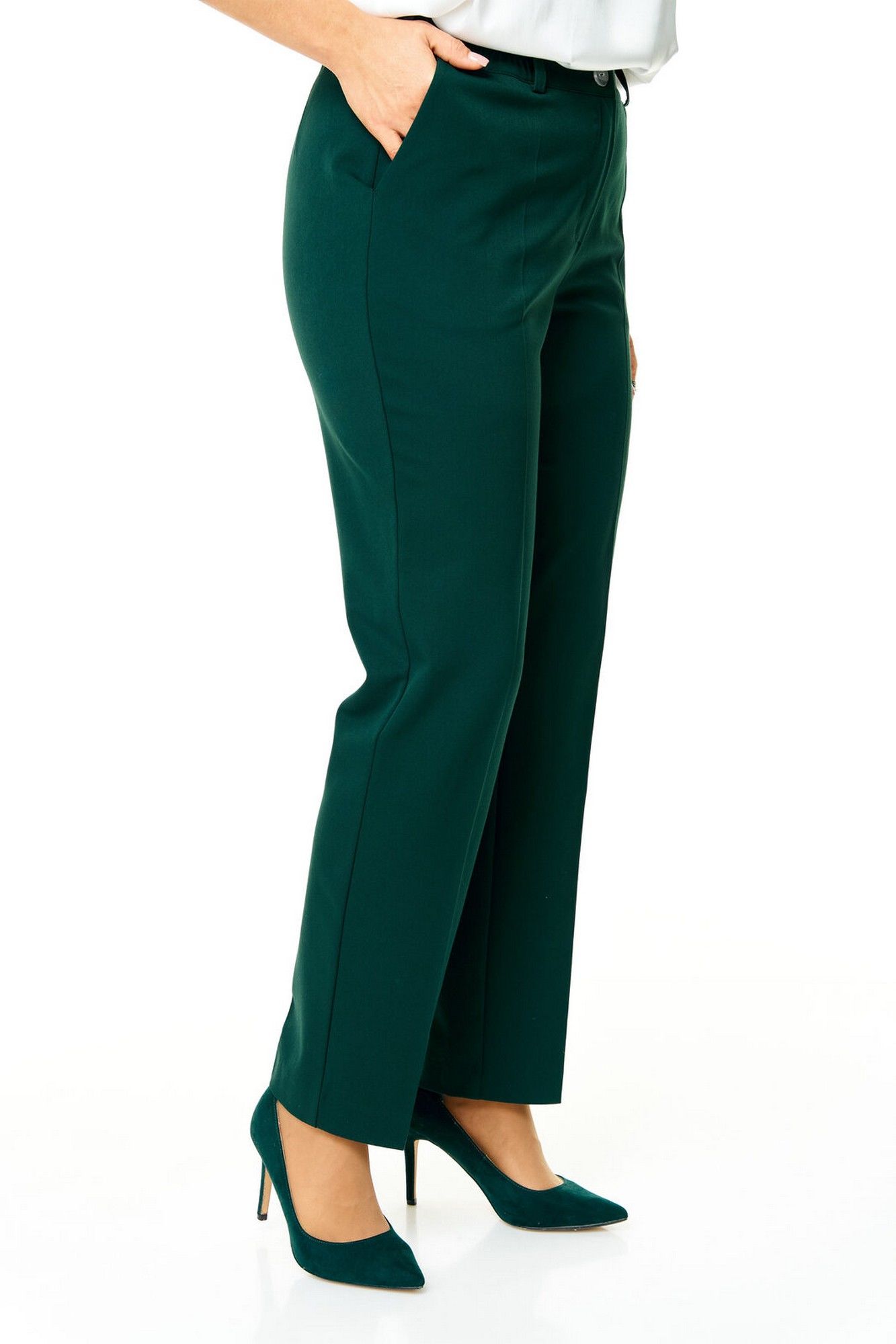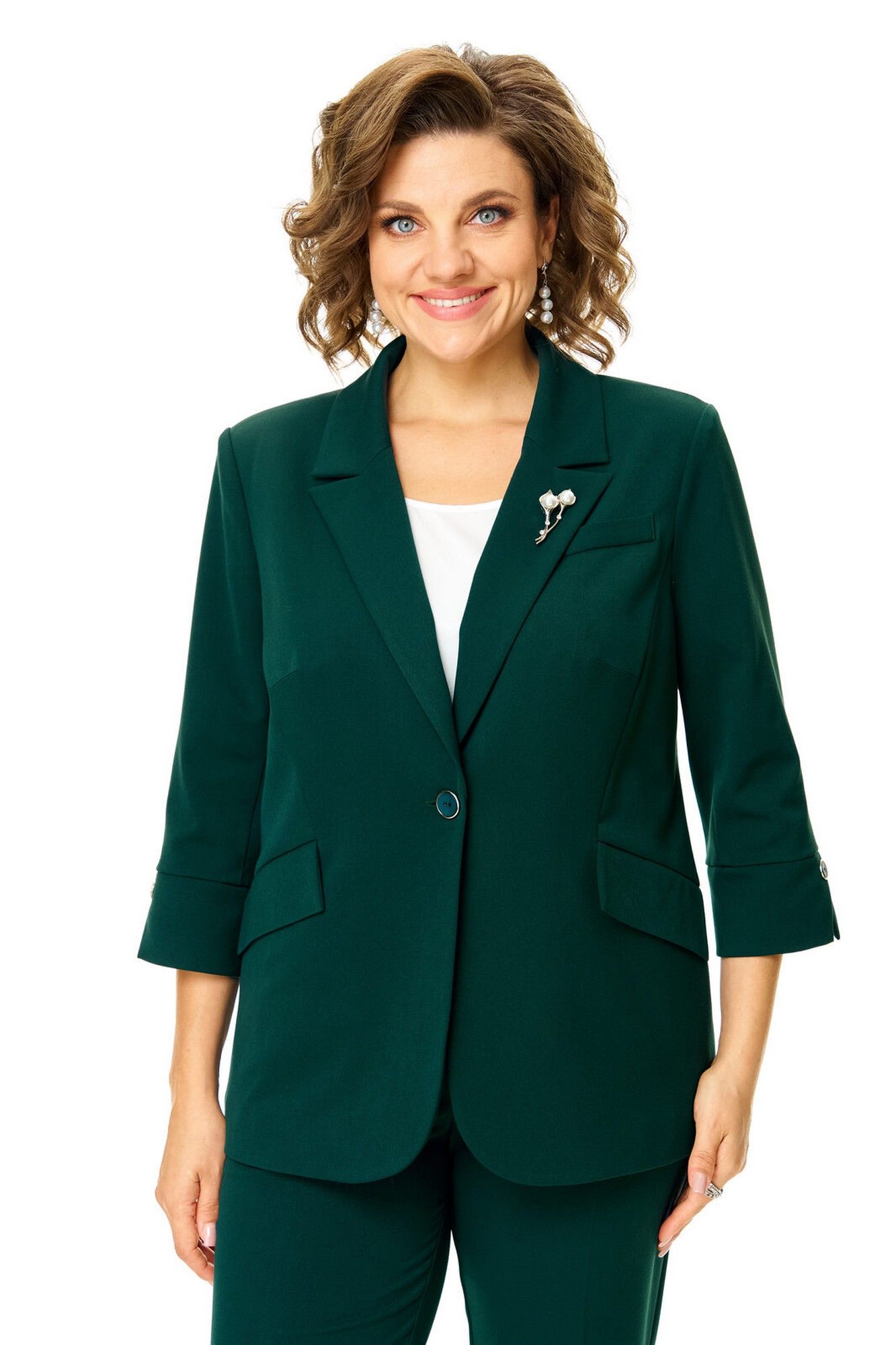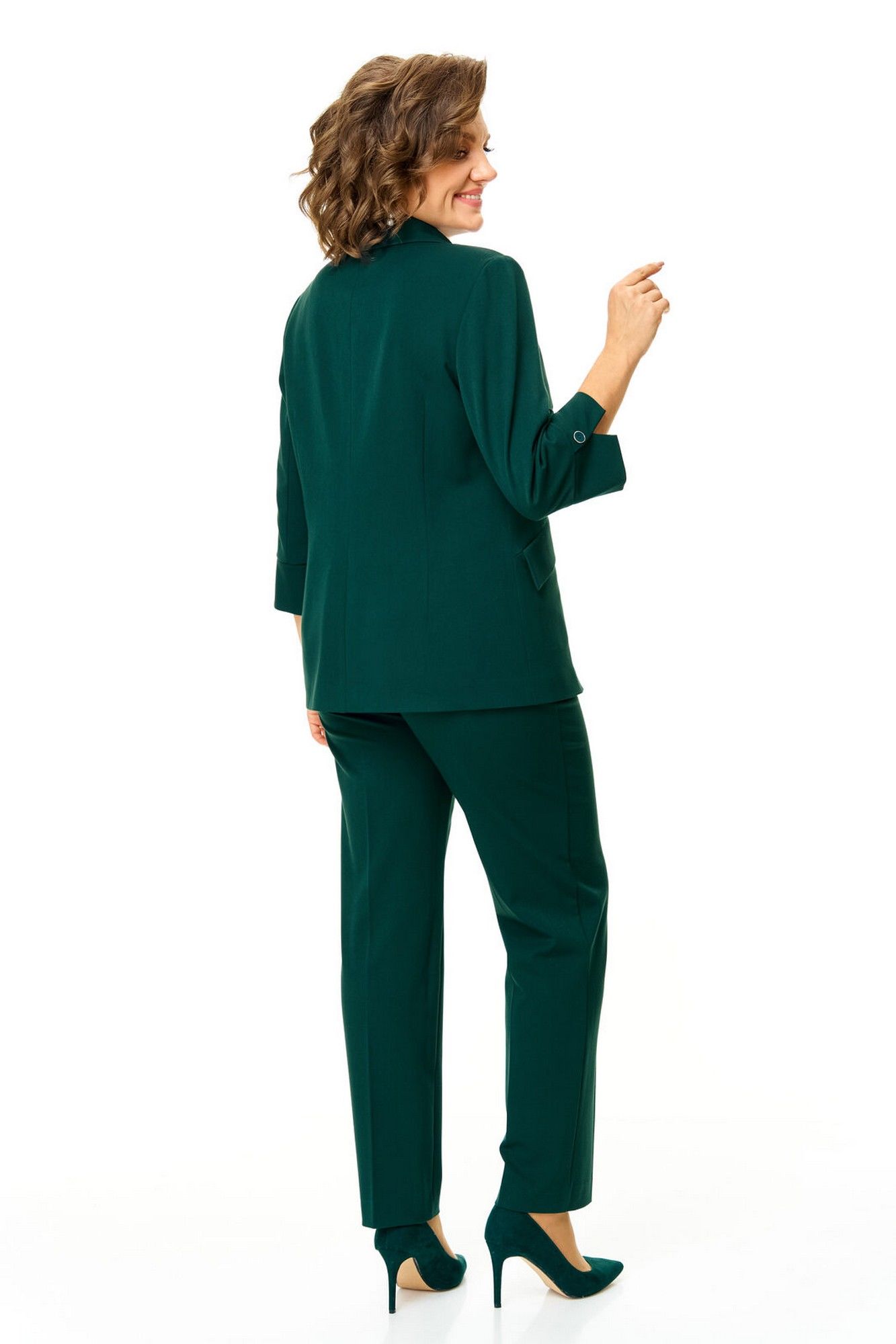 Костюм женский состоит из жакета и брюк.Жакет полуприлегающего покроя с естественной линией плеча на подкладке.Застежка однобортная на петлю-пуговицу.Спинка со средним швом и талиевыми вытачками.Перед с рельефами из проймы и небольшой нагрудной вытачкой.По переду, в подрезах, обработаны карманы с клапаном.Низ борта округлой формы.Воротник пиджачного типа.Рукав длиной 3/4 с авторской манжетой по низу.Брюки зауженные к низу, с центральной застёжкой на молнию и петлю-пуговицу.В боковых швах карманы с отрезным бочком.Пояс притачной с резинкой по бокам.В комплект входит съёмная металлическая брошь.